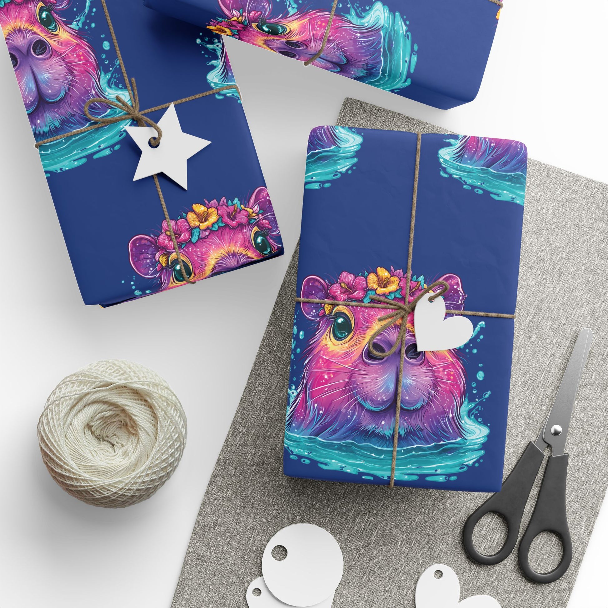 A whimsical and charming wrapping paper pattern featuring a sweet capybara adorned with a colorful flower crown. Perfect for gifts for animal lovers, nature enthusiasts, or anyone who enjoys playful and cheerful designs. The repeating pattern creates a joyful, lighthearted aesthetic that adds a touch of fun and warmth to any present.