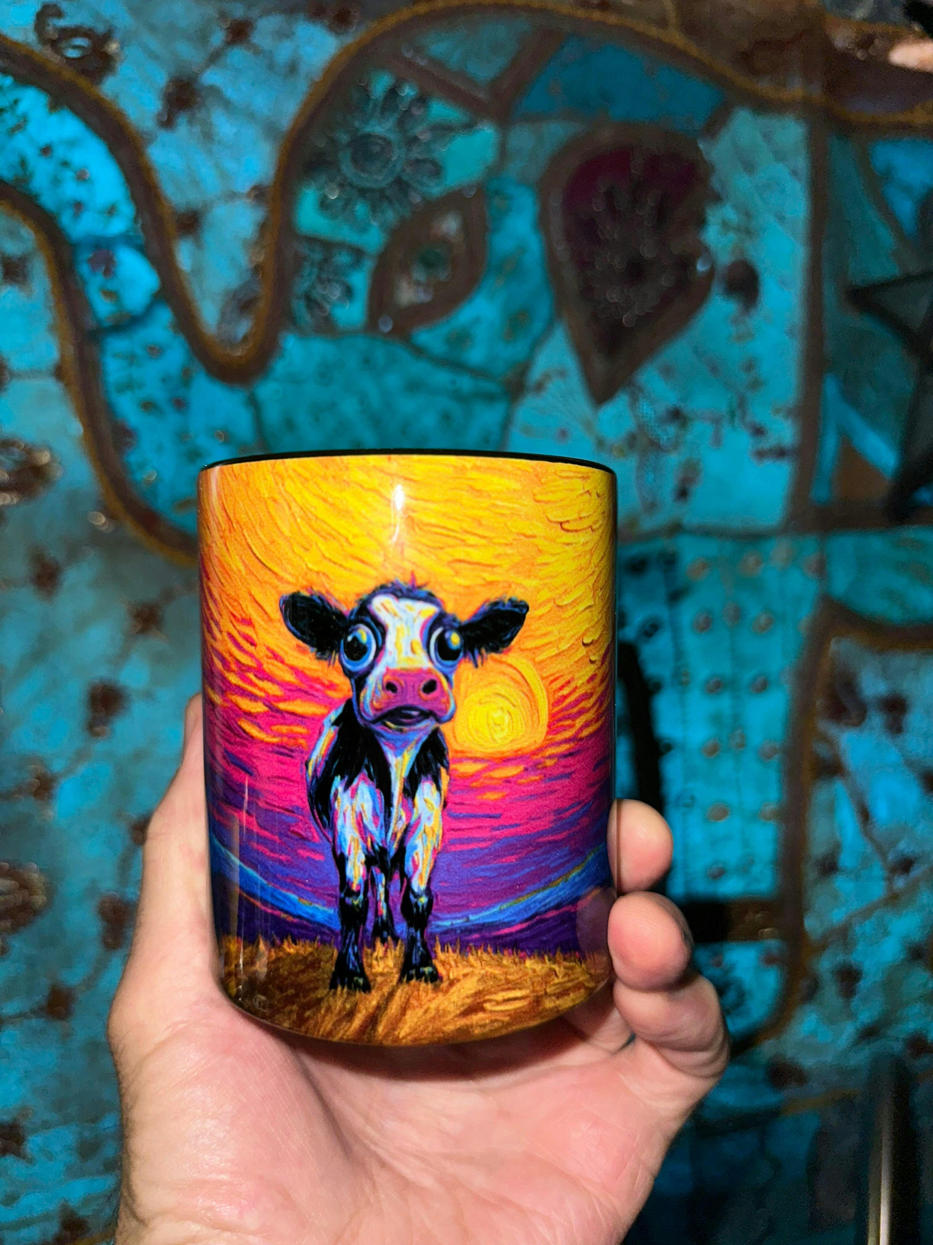 Mornings are better when you start them with a little moo-tiful scenery. This vibrant mug features an irresistibly adorable cow basking in a vivid sunset of pinks, oranges, and purples—like a pastoral postcard for your coffee break. Perfect for cow lovers, sunset chasers, and anyone who likes their caffeine with a side of country charm.