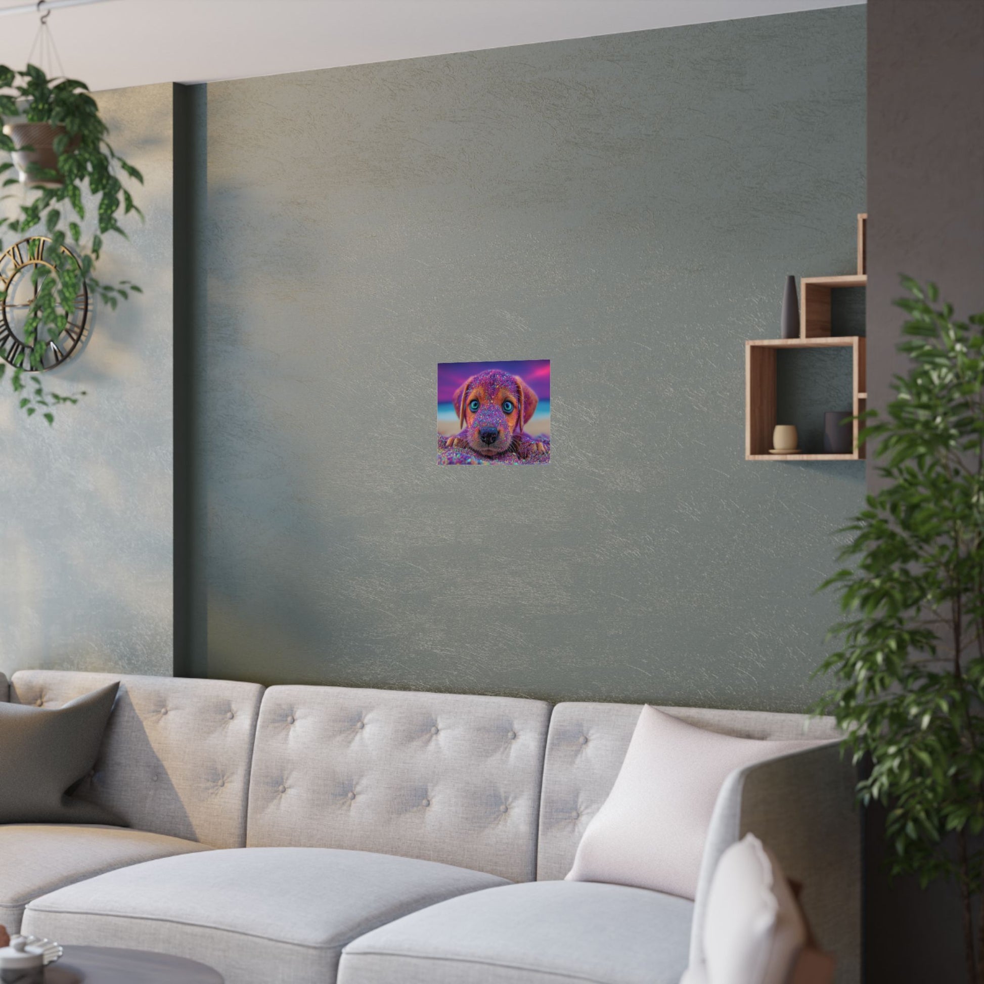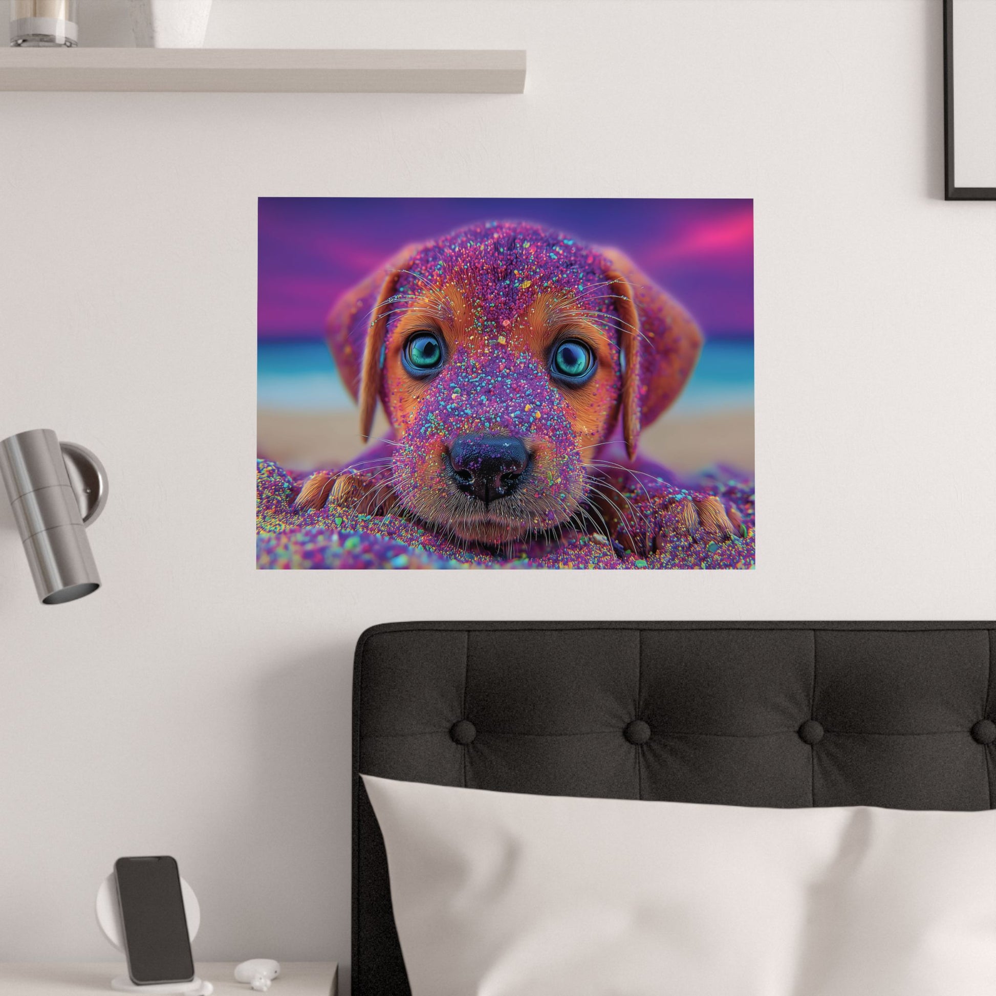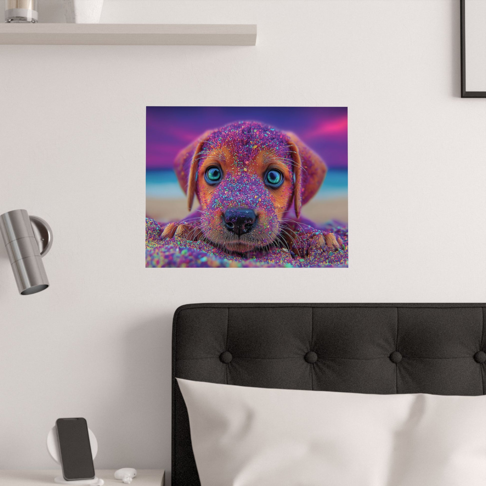 Adorable Hypnotic Colored Puppy Poster – Cute Vibrant Colors & Hypnotic Purple Sand