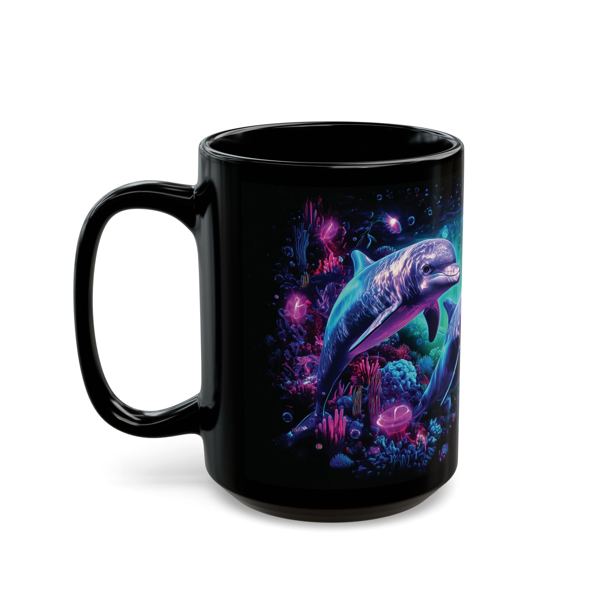 Mug featuring vibrant, colorful dolphins swimming gracefully in calm, deep-blue water. The dolphins are painted in bright, cheerful colors—turquoise, magenta, yellow, and purple—gliding smoothly together in a serene underwater scene. Soft light filters through the water, highlighting the dolphins’ sleek forms. The design wraps around the mug, full-color, whimsical and lively, perfect for an eye-catching drinkware piece