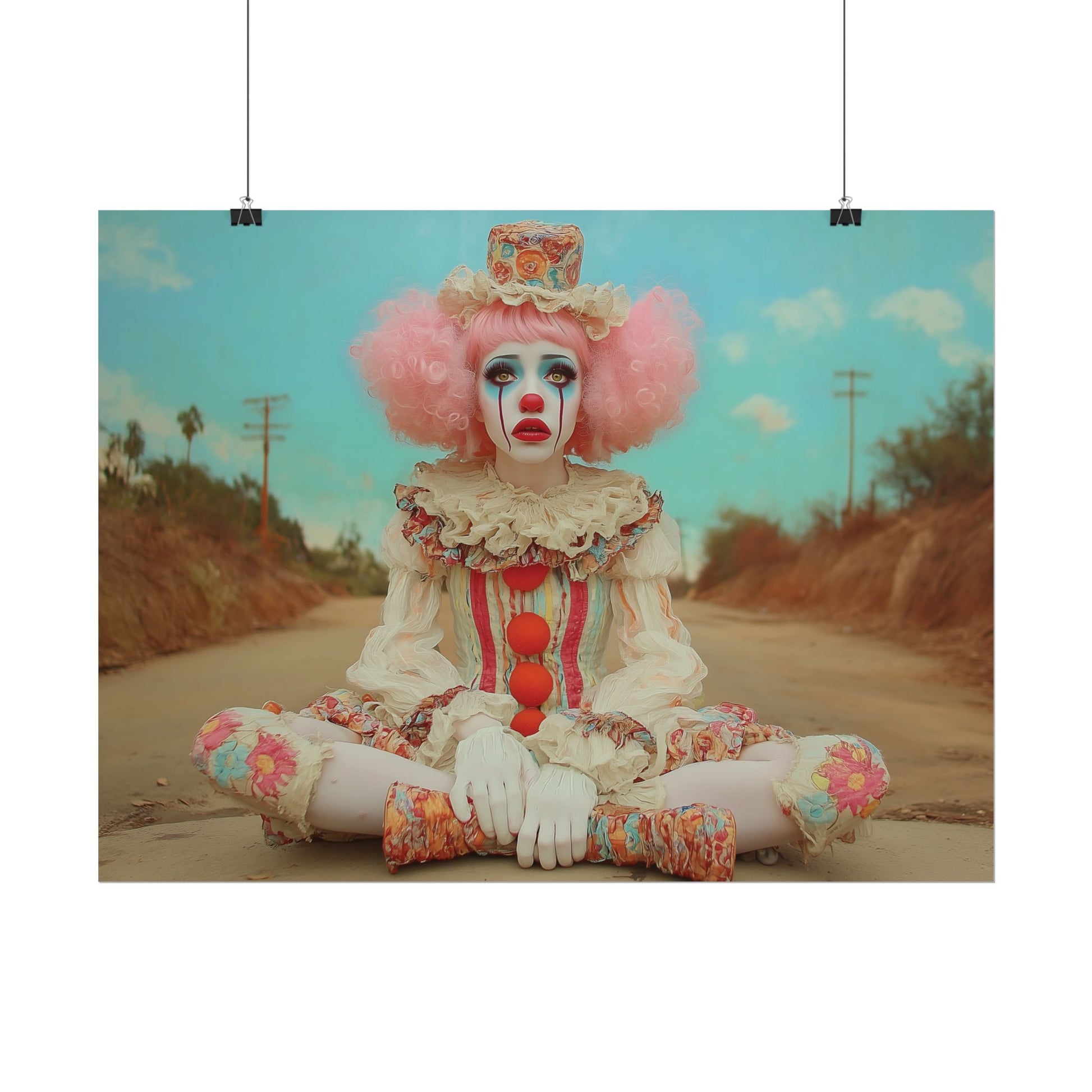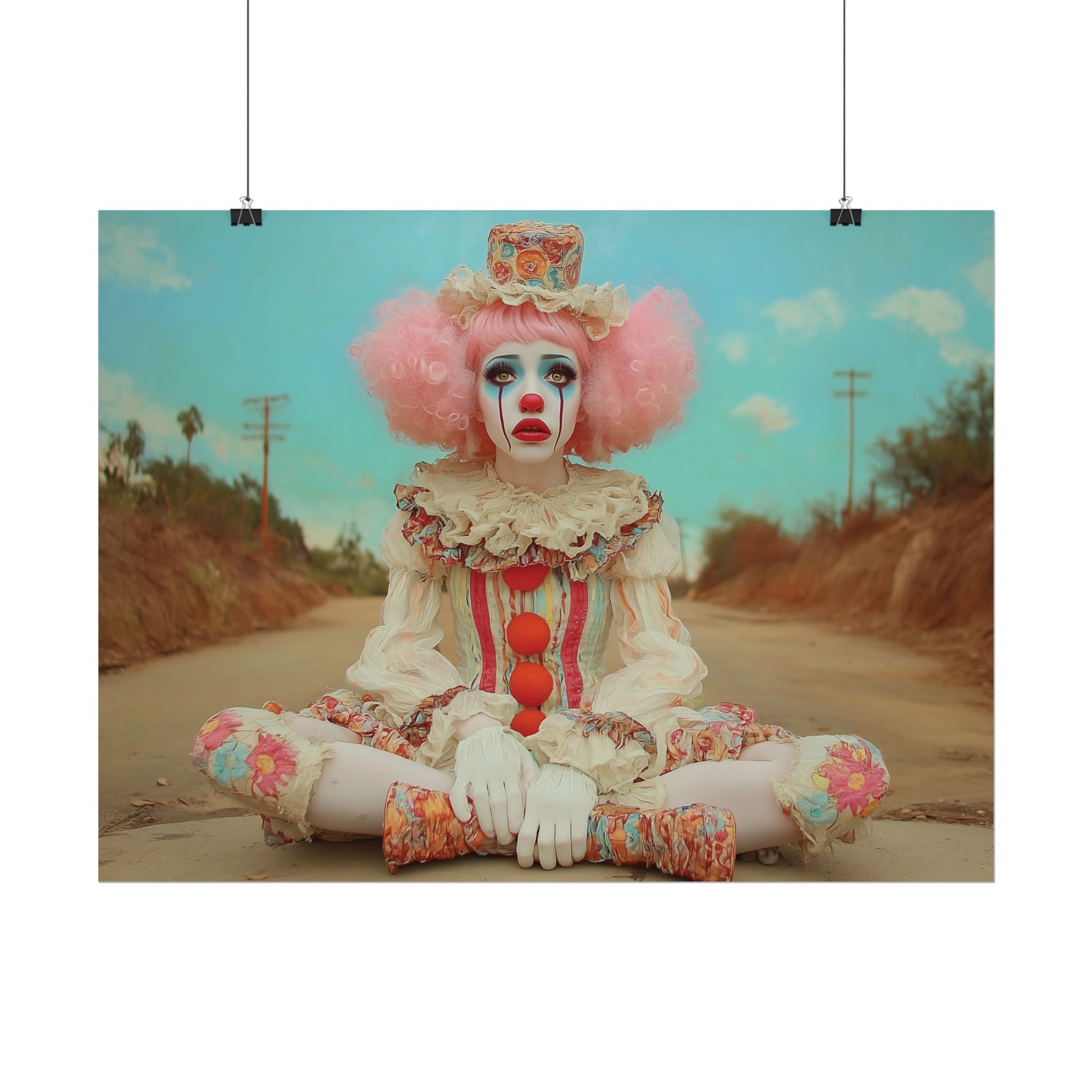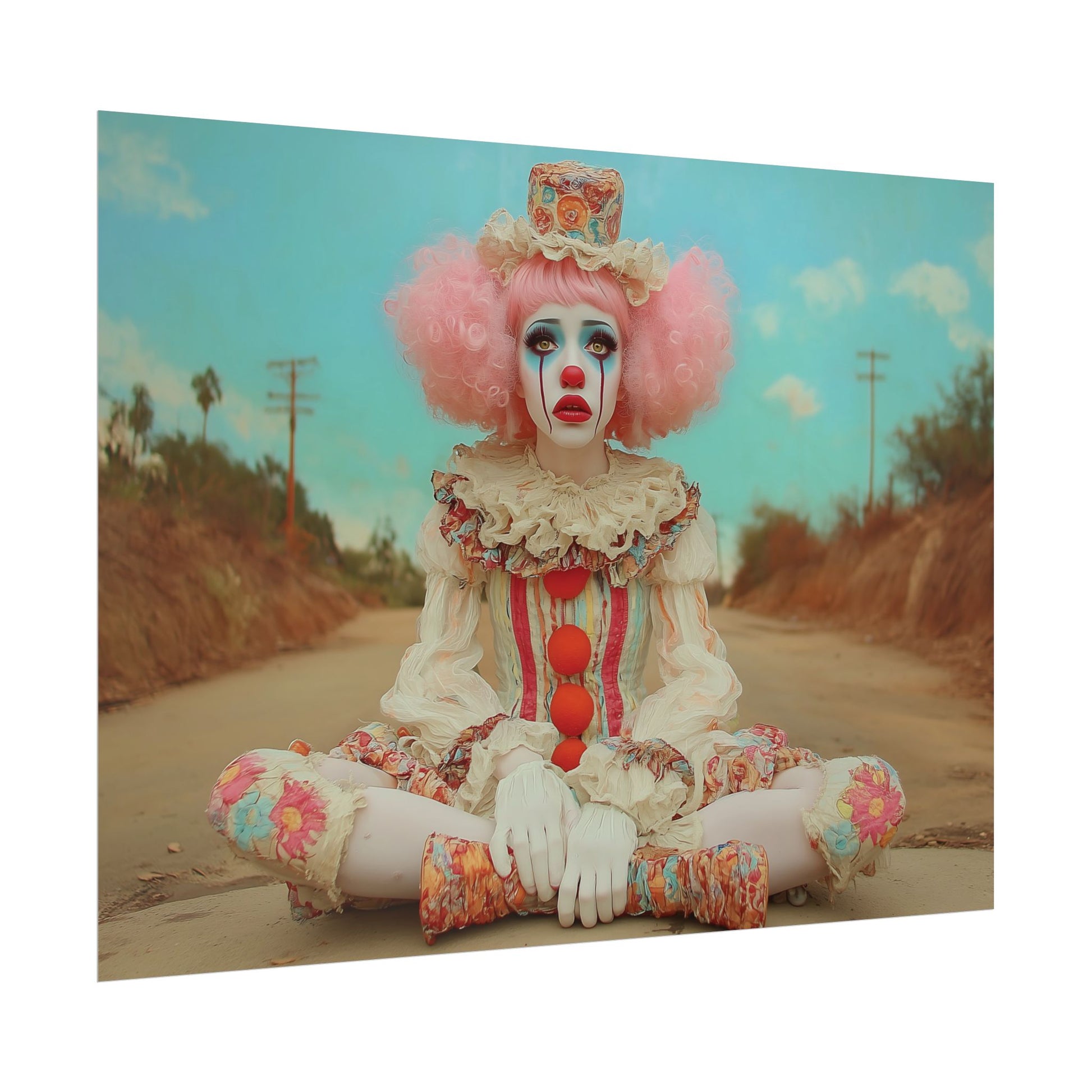 A rolled poster that brings a surreal, vintage-carnival moment into your space. This print captures a melancholy clown in pastel pinks and muted desert tones — a scene that feels equal parts nostalgic fairground and sun-bleached roadside. Hung over a desk, leaned against a shelf, or framed above a reading nook, the image creates a quietly theatrical atmosphere: soft cotton-candy hair, faded sky blues, and tactile costume details draw the eye and invite longer looks. Choose from fine art, semi-glossy, or matte papers to match your room’s light and mood. The giclée printing preserves vibrant color and subtle texture, so the portrait holds up under display and sunlight. This poster suits collectors of oddball vintage art, lovers of cinematic photography, and anyone who enjoys décor that starts conversations rather than blending in.
