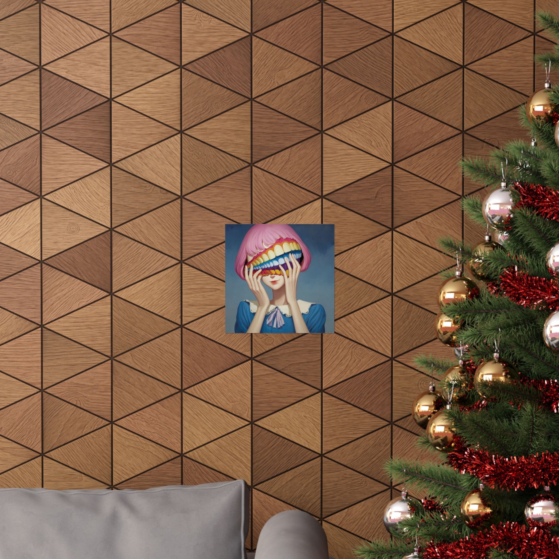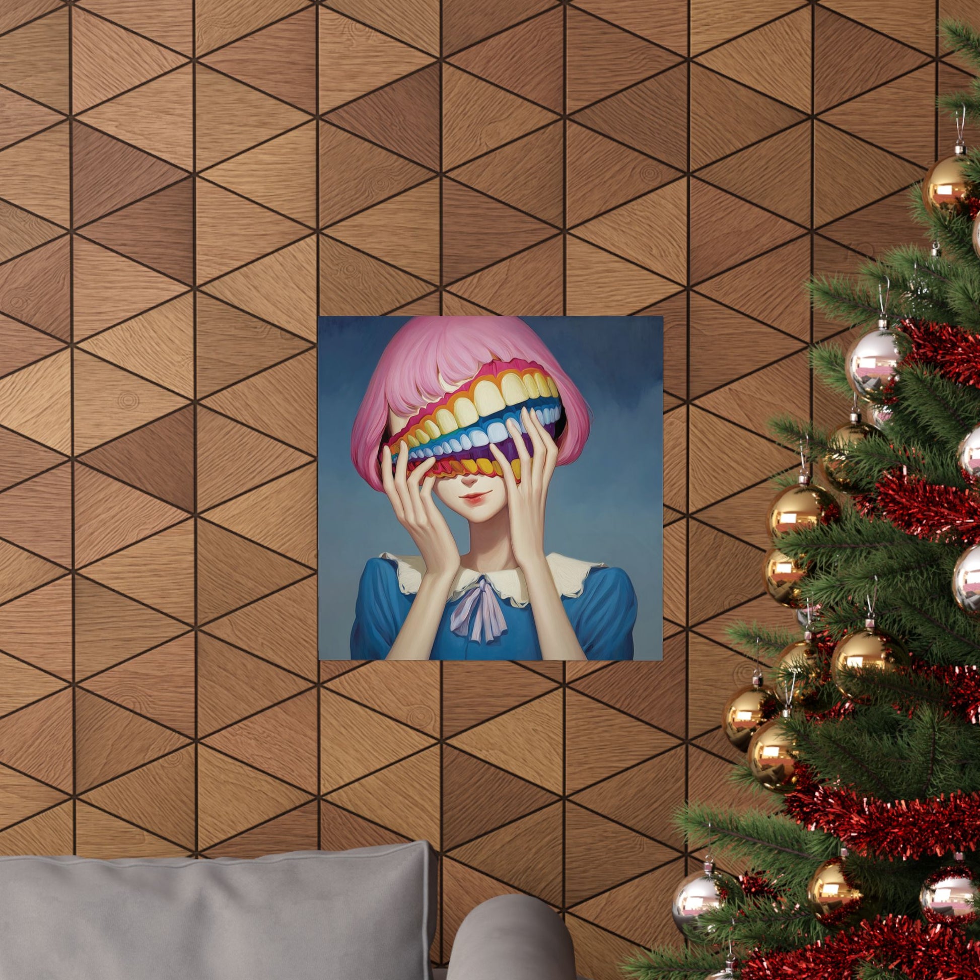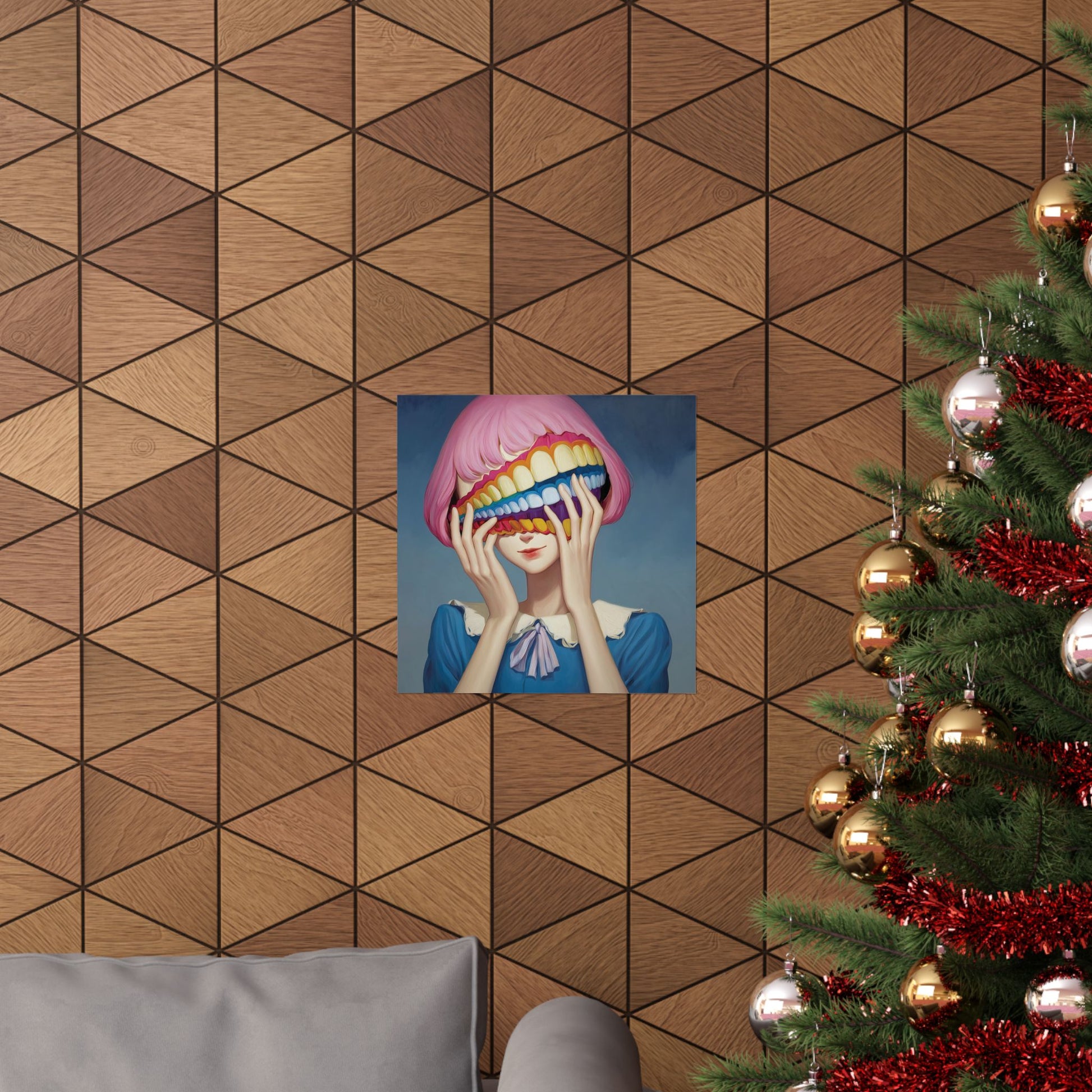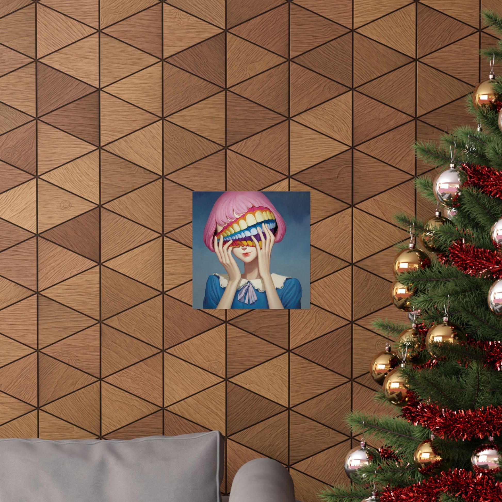 This haunting yet delicate surreal poster captures the emotional weight behind the phrase “fake it till you make it.” A girl wears a mask of smiling human teeth — a symbol of forced joy and hidden struggle. Rendered in soft pastel tones and painterly textures, it blends vulnerability with quiet power. Perfect for lovers of conceptual art, emotion-driven décor, and modern surrealism.