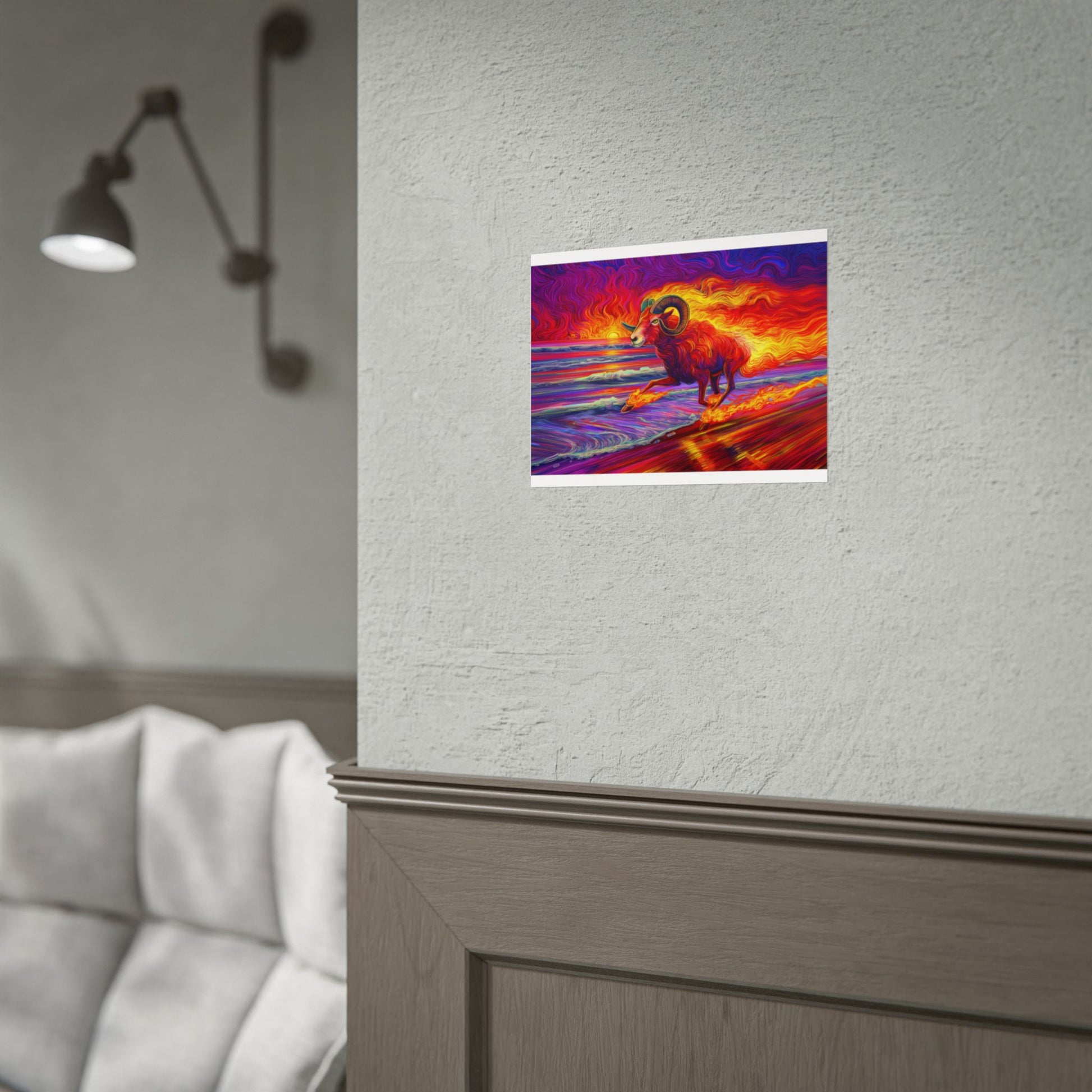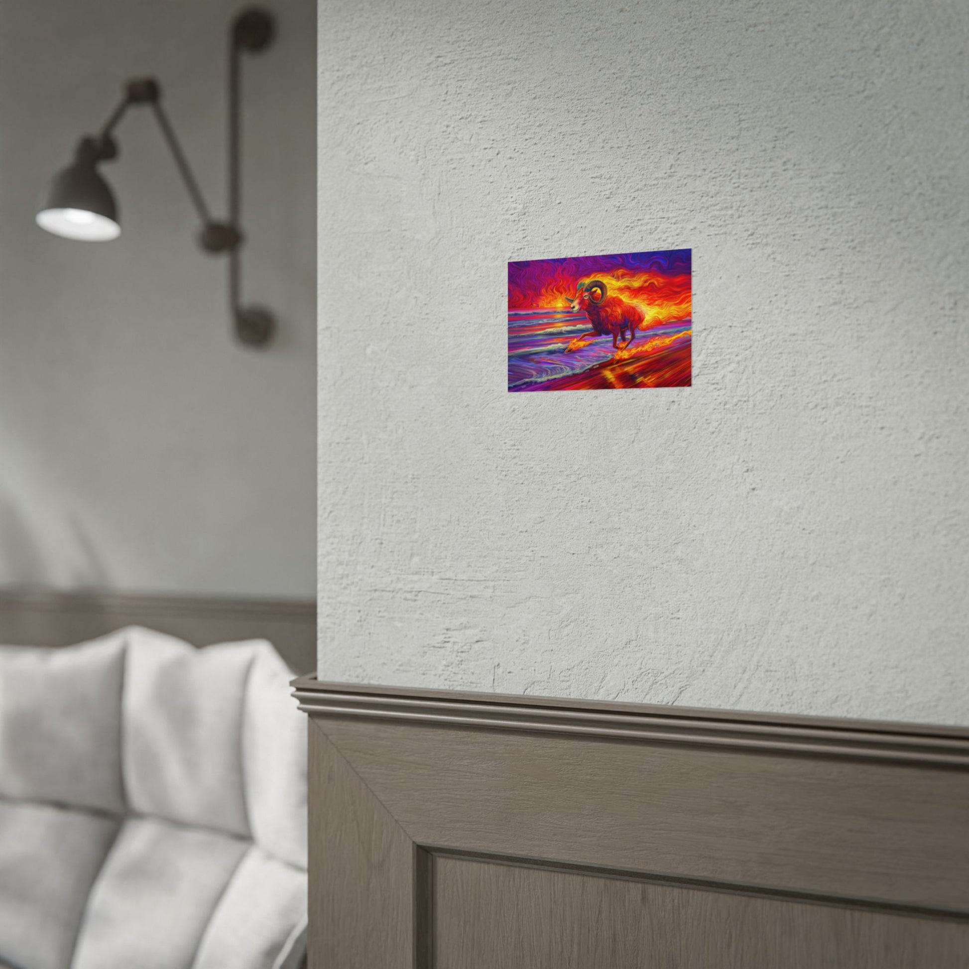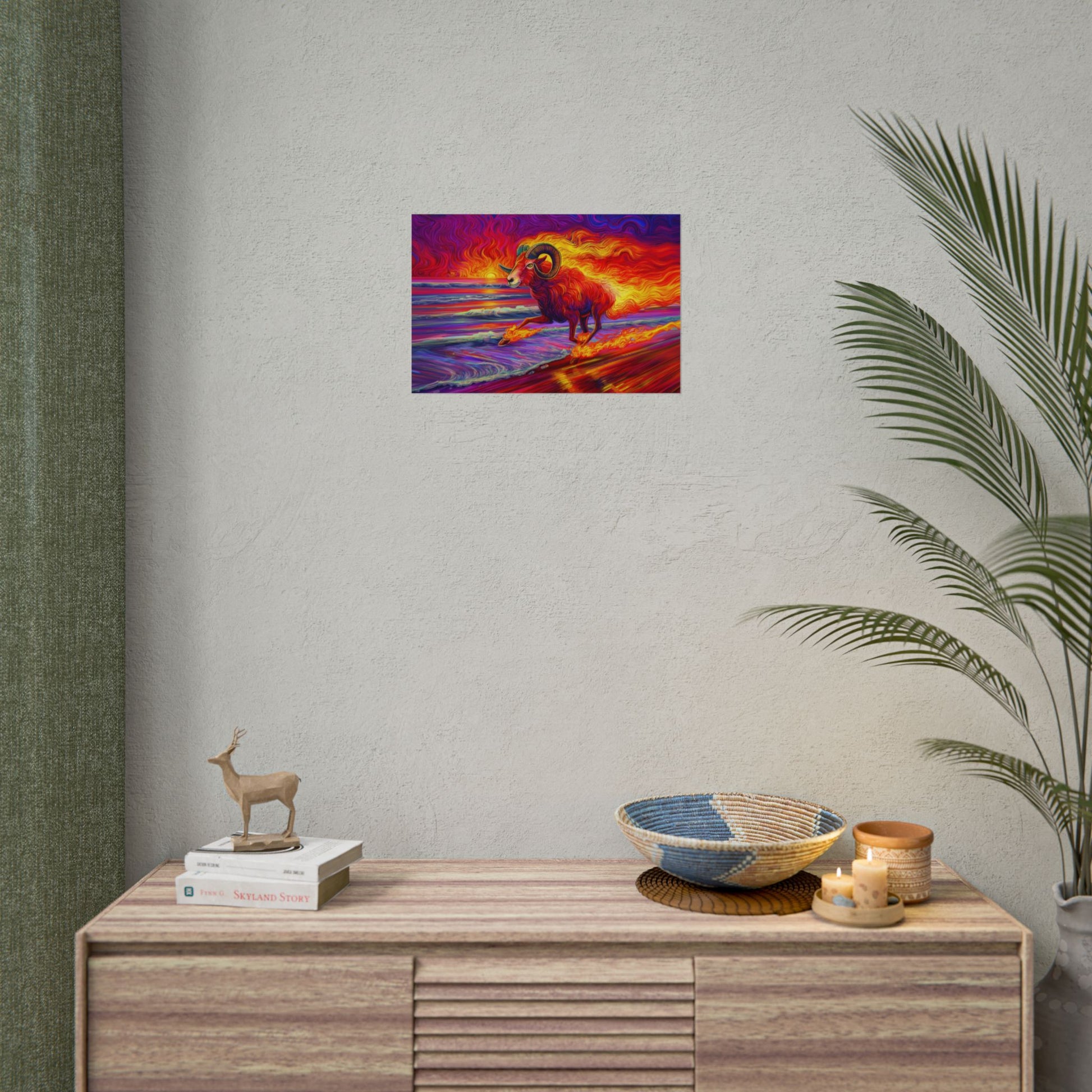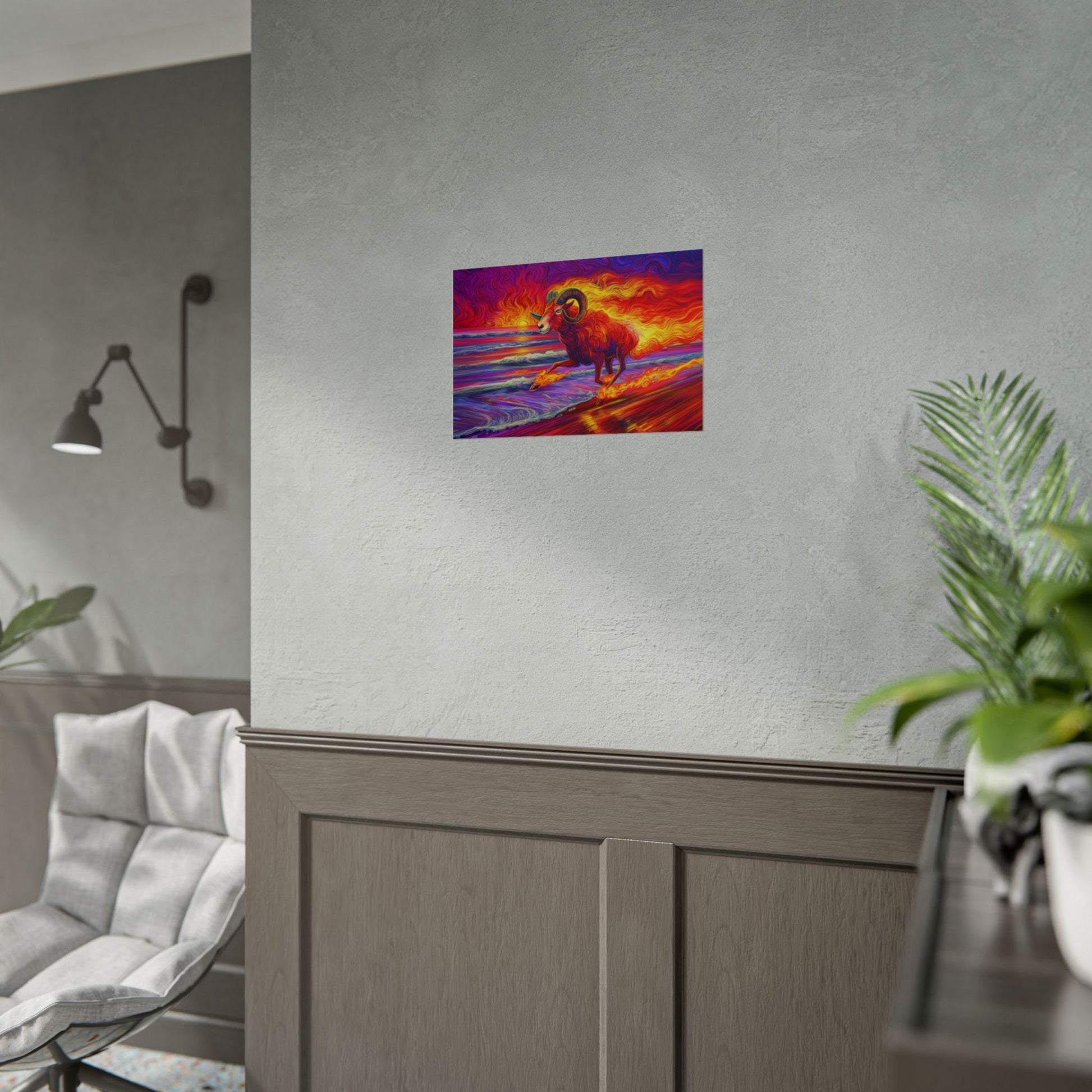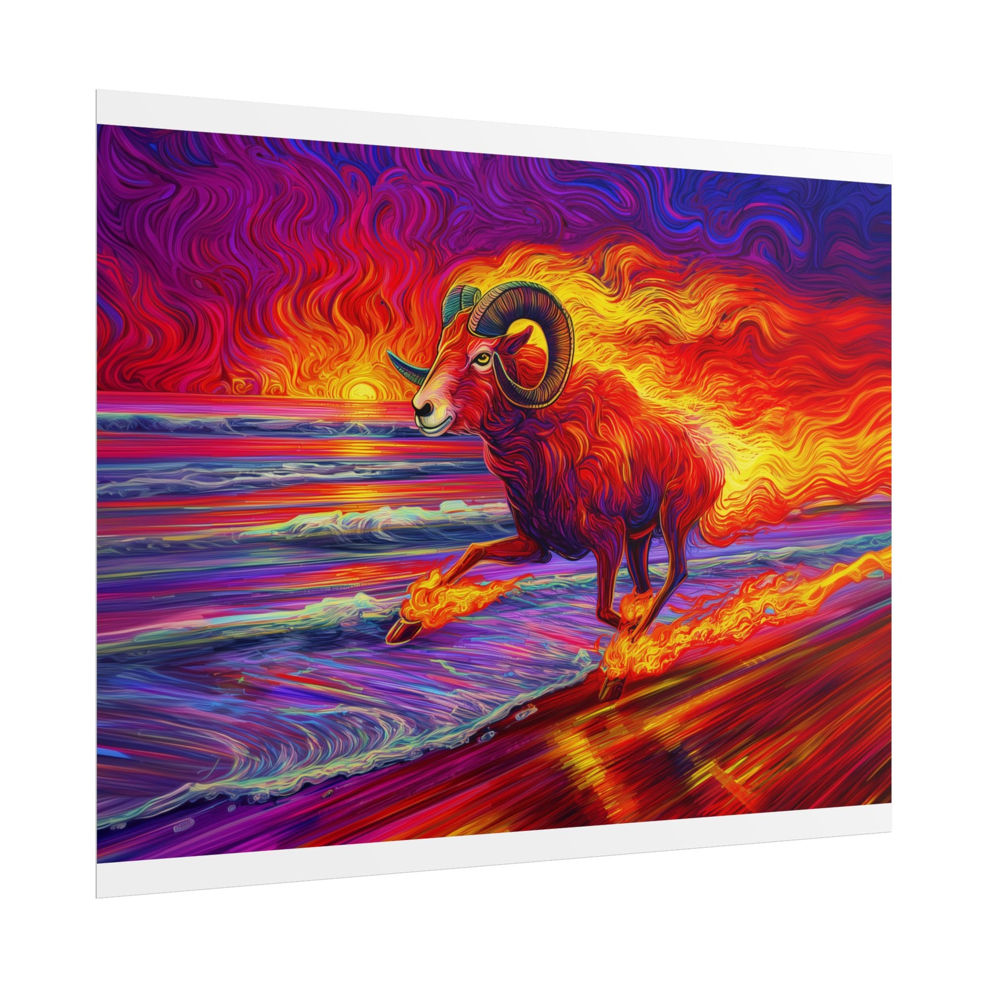 Unleash the fire of the stars with this boldly colorful Aries ram, charging straight out of a beach sunset. Vivid, dynamic, and bursting with energy, this zodiac-inspired artwork brings the perfect mix of power and beauty to any room. Perfect for astrology lovers, art enthusiasts, or anyone who appreciates a sunset that really makes a statement.
