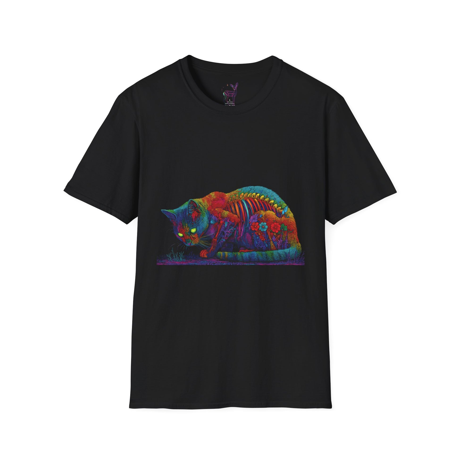 Straight from another dimension, this glowing skeleton cat prowls between worlds with an eerie cosmic energy. Its bones shimmer with an unearthly light, giving it a spectral glow that feels both mystical and unsettling. Set against a dark backdrop, the design radiates intensity, making it pop like a living (or unliving) apparition.