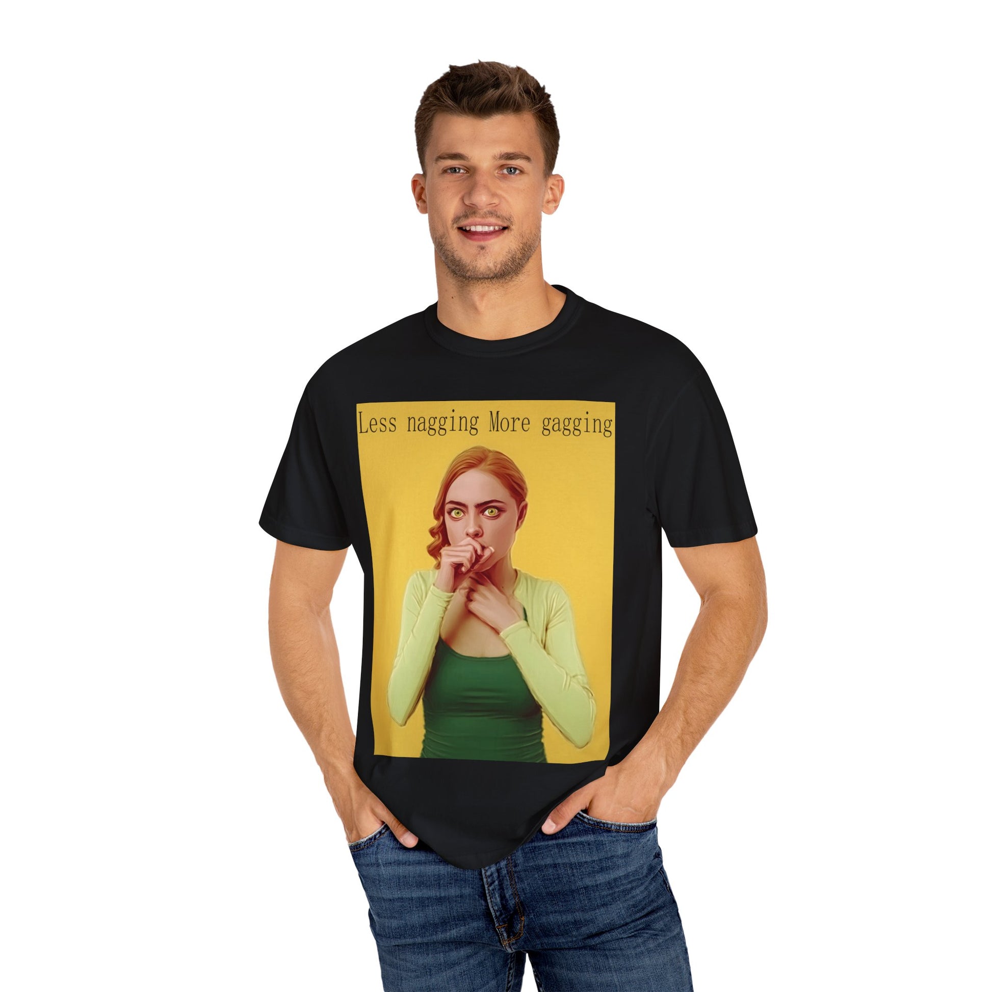 Turn up the sass with this bold adult humor tee. Featuring the phrase ‘Less Nagging, More Gagging,’ it’s a cheeky statement piece for anyone with a daring sense of humor. Perfect as a gag gift, party shirt, or conversation starter.