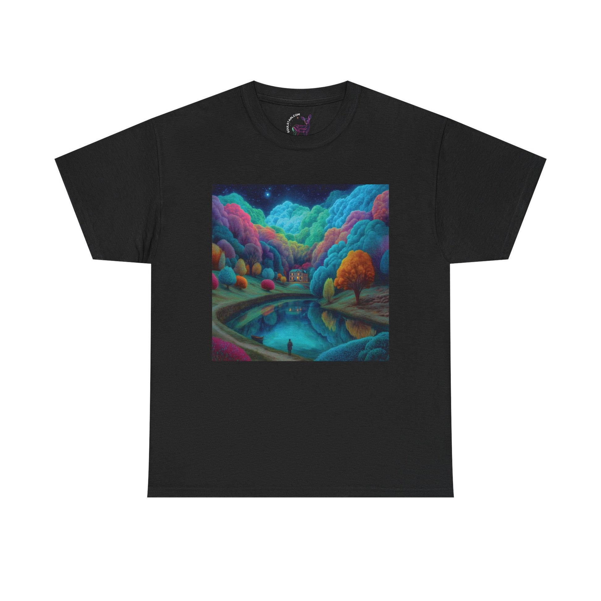 Bring a touch of magic to any space with this dreamy surreal landscape tee. Fluffy, cloud-like trees seamlessly blend into a soft sky, while a serene lake reflects the ethereal beauty of the scene. In the distance, a cozy dwelling glows with warm light, inviting curiosity and wonder. Perfect for dreamers, nature lovers, and anyone who appreciates whimsical, semi-realistic art that sparks imagination.