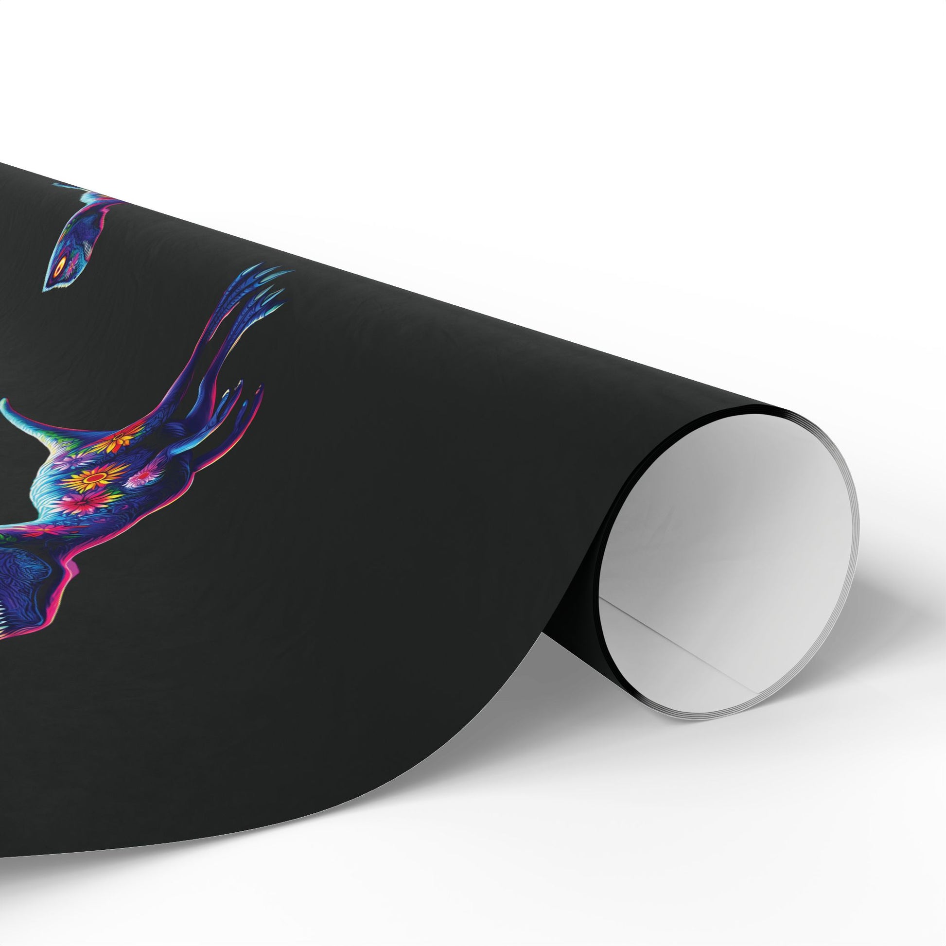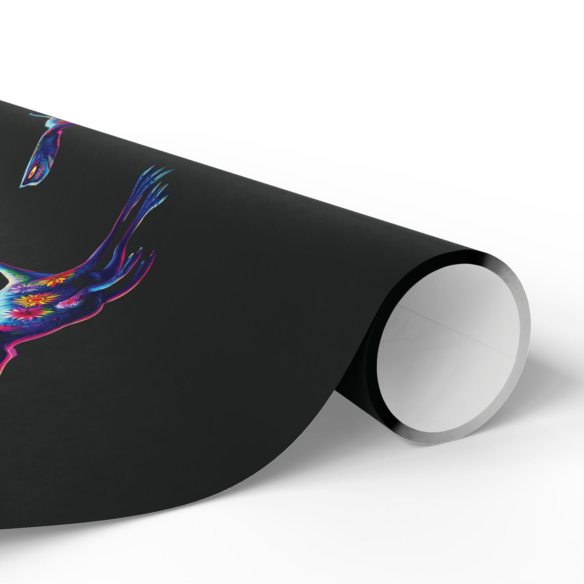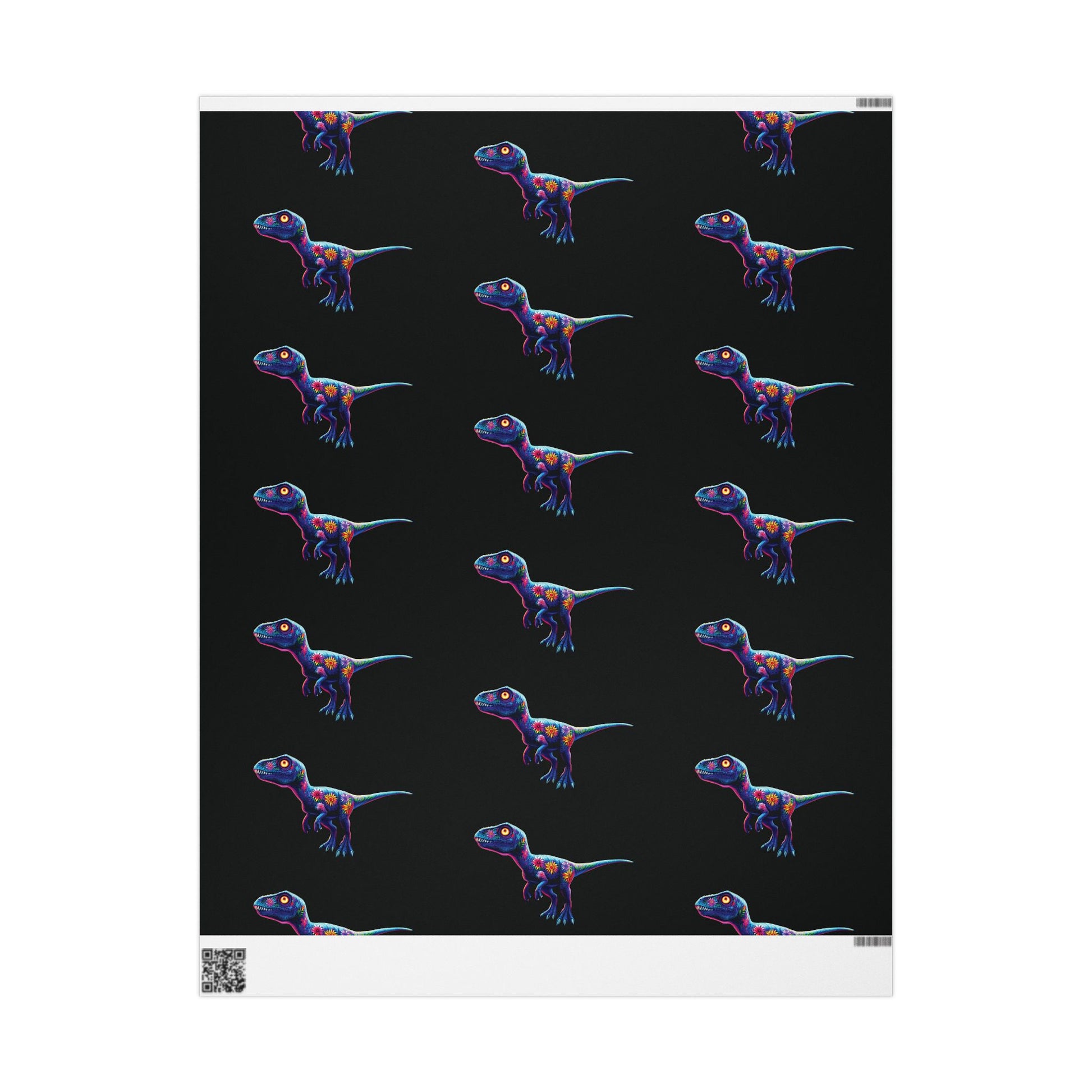 A bold and striking wrapping paper pattern featuring a neon-colored raptor adorned with vibrant flowers, set against a deep black background. The neon hues pop dramatically, creating a modern, edgy, and playful aesthetic. Perfect for dinosaur fans, lovers of bright colors, or anyone wanting a unique and eye-catching gift wrap