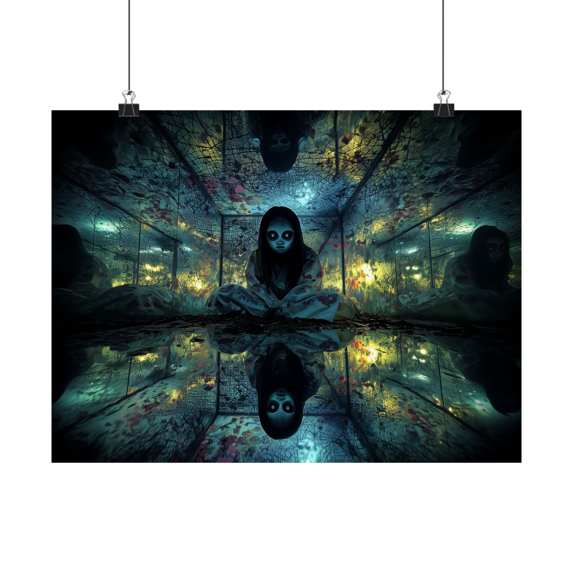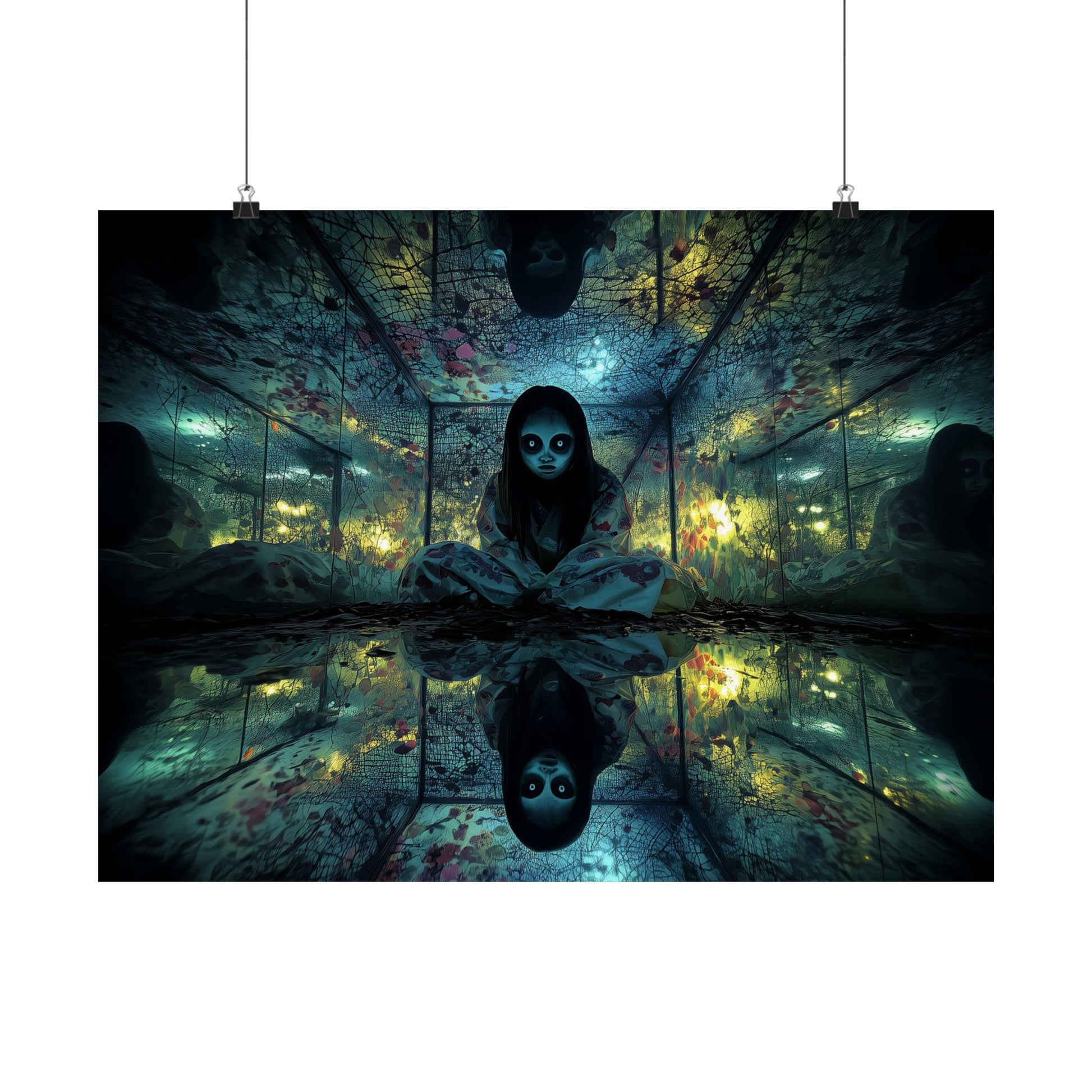 Step into a world that feels both familiar and impossibly wrong. This unsettling poster features a girl trapped inside a fractured mirror box, her distorted reflection multiplying with every angle. Dark, dreamlike colors swirl around her, blending horror and psychedelia in a way that is impossible to look away from. Perfect for fans of surreal horror and trippy, mind-bending visuals, this poster captures the uncanny and the eerie in a single haunting image.