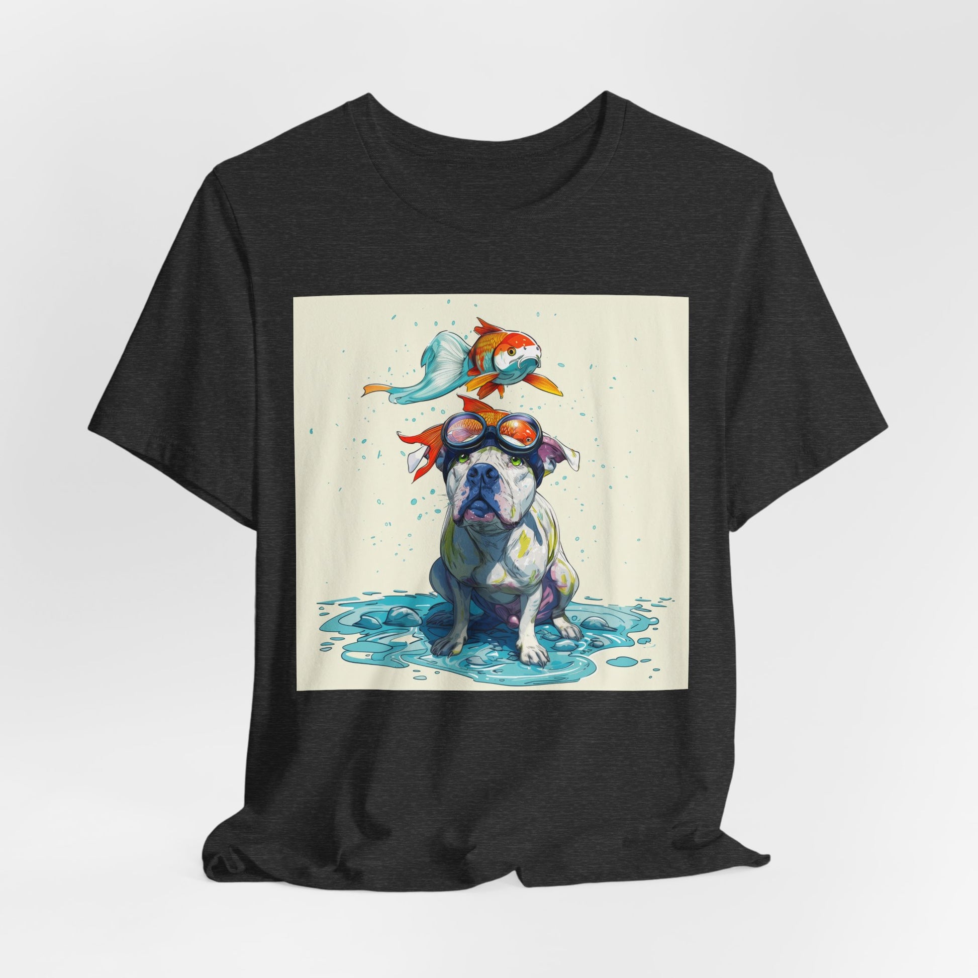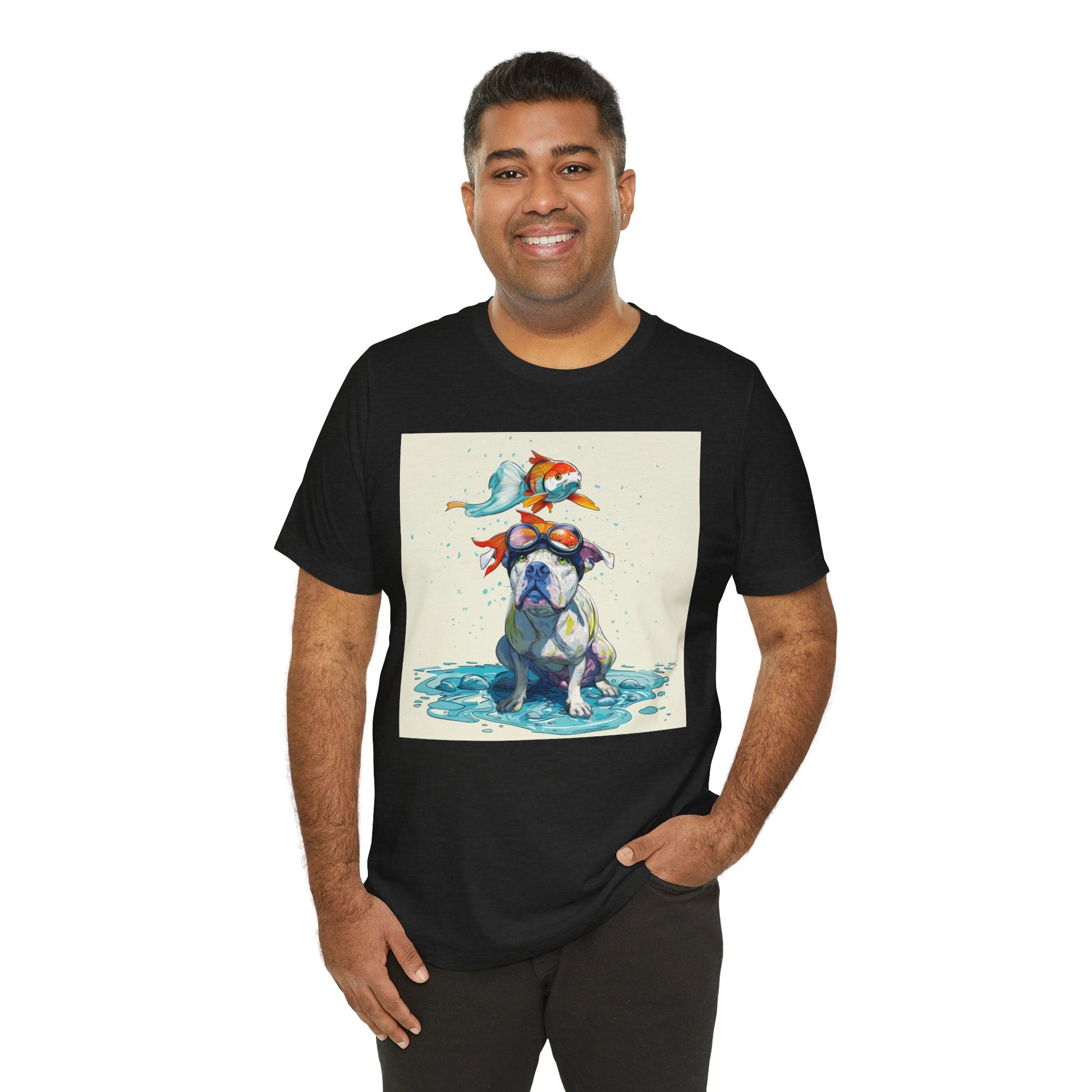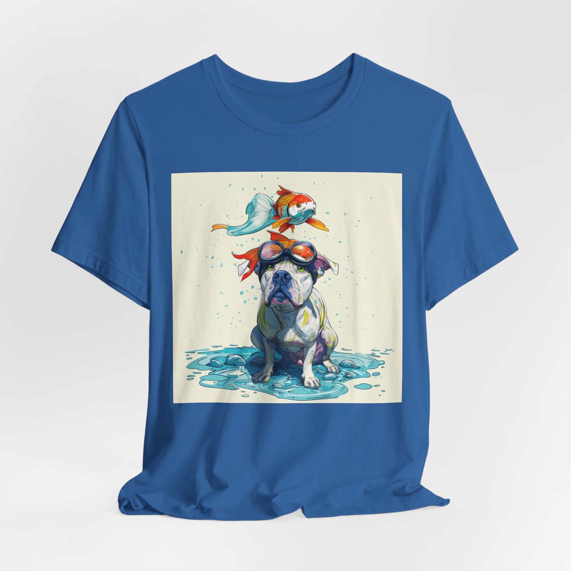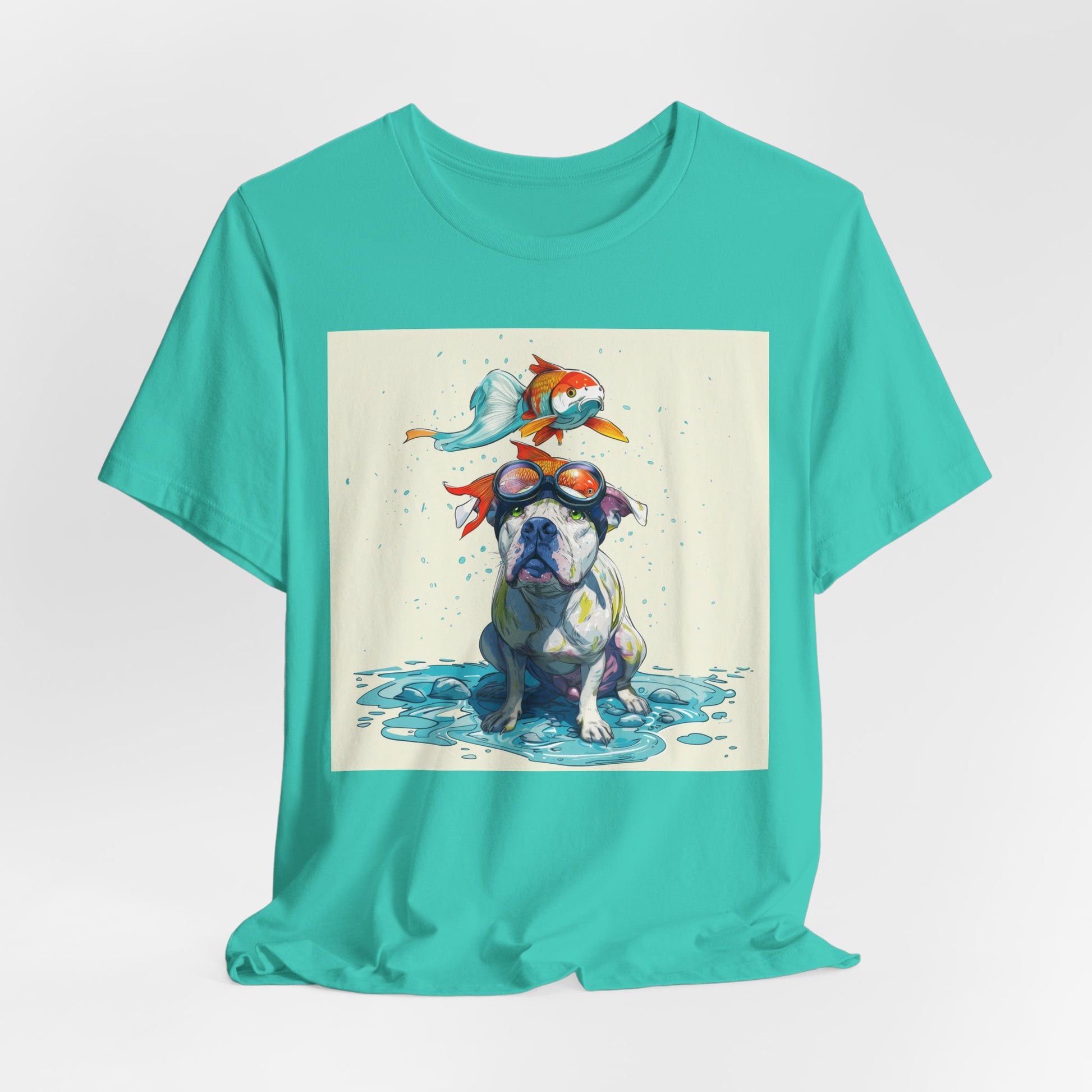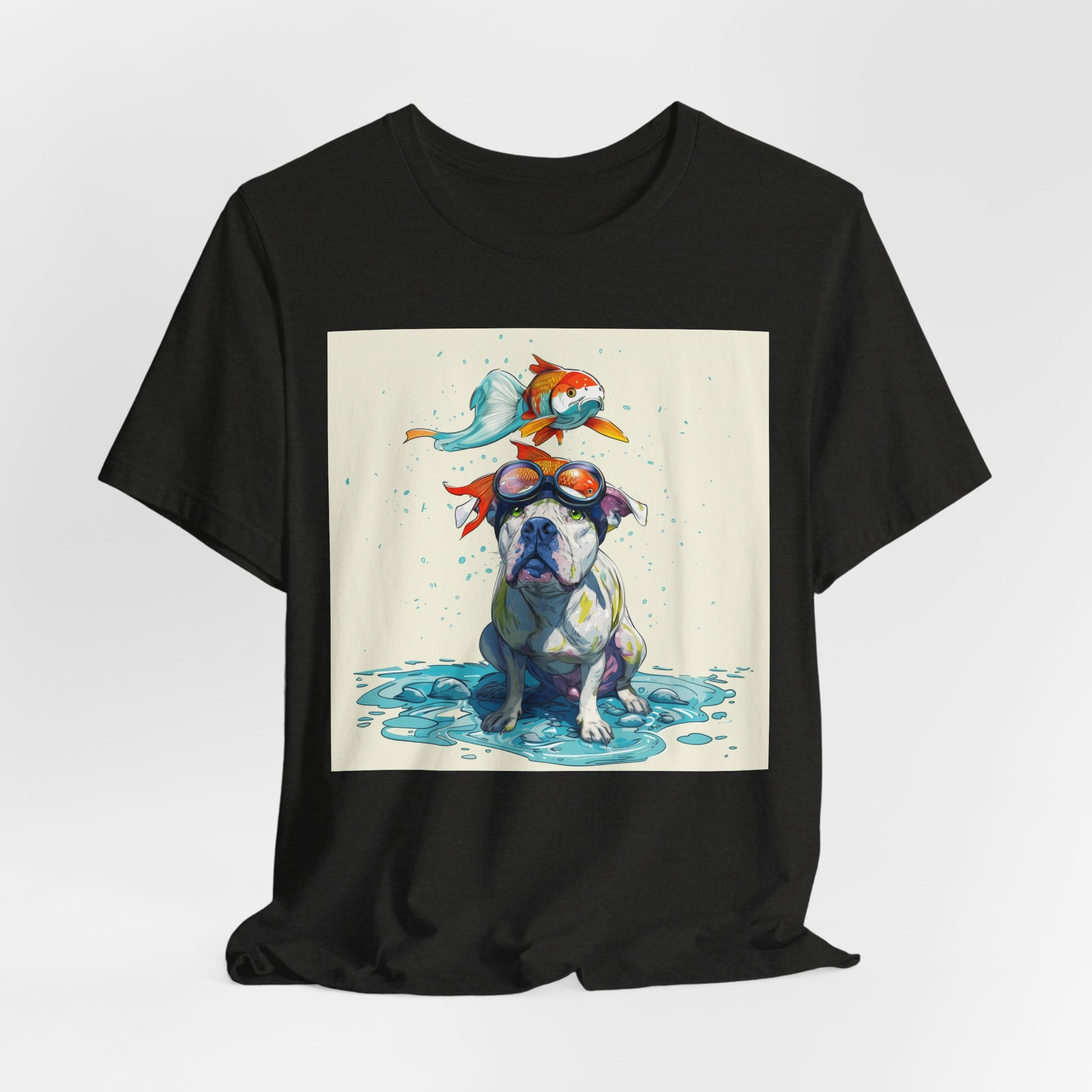 Meet the goofiest pup you’ll ever see! This playful design features a happy pitbull wearing goggles with a colorful koi fish balancing on his head—perfectly ridiculous and absolutely adorable. Full of vibrant colors and silly charm, it’s a shirt that brings smiles wherever it goes.
