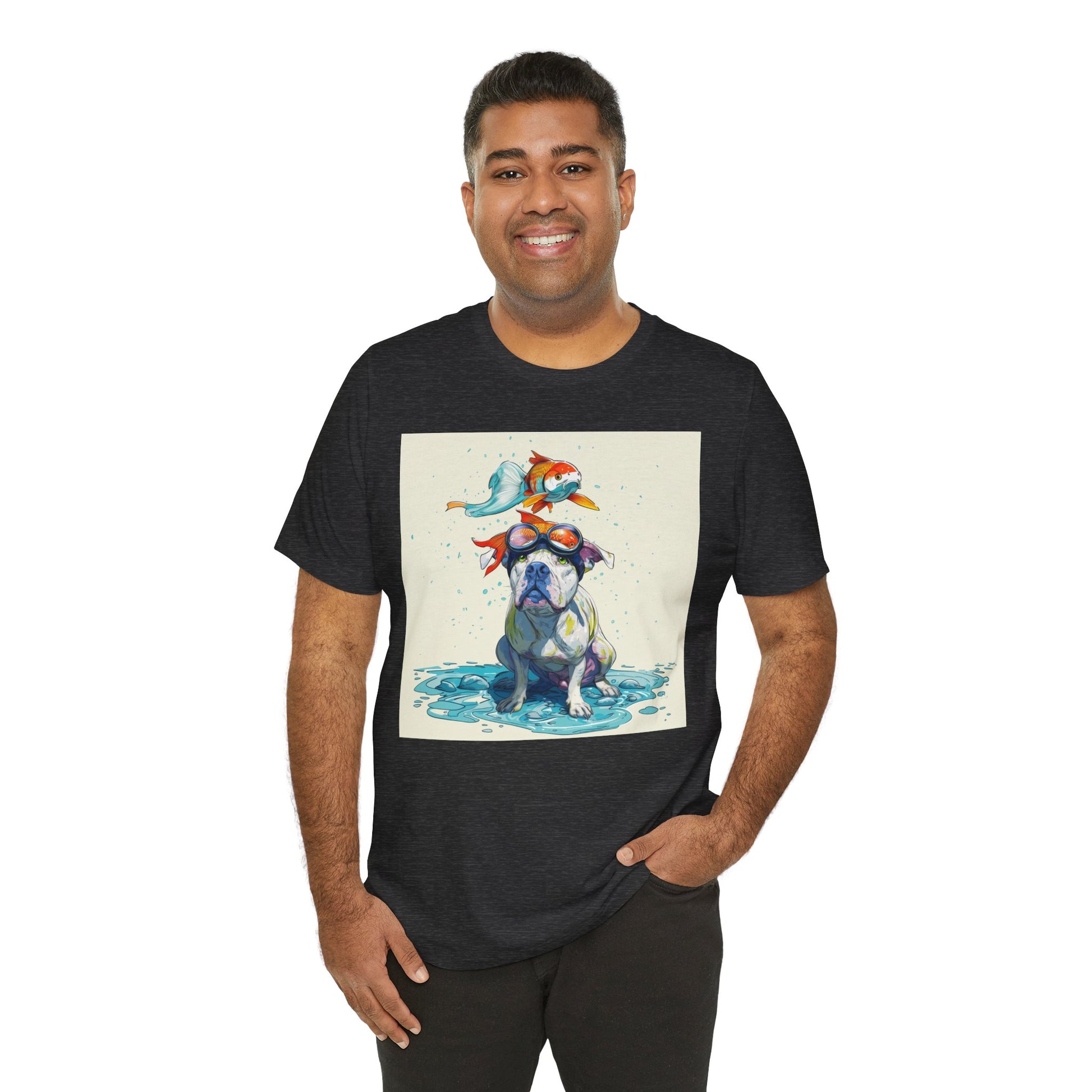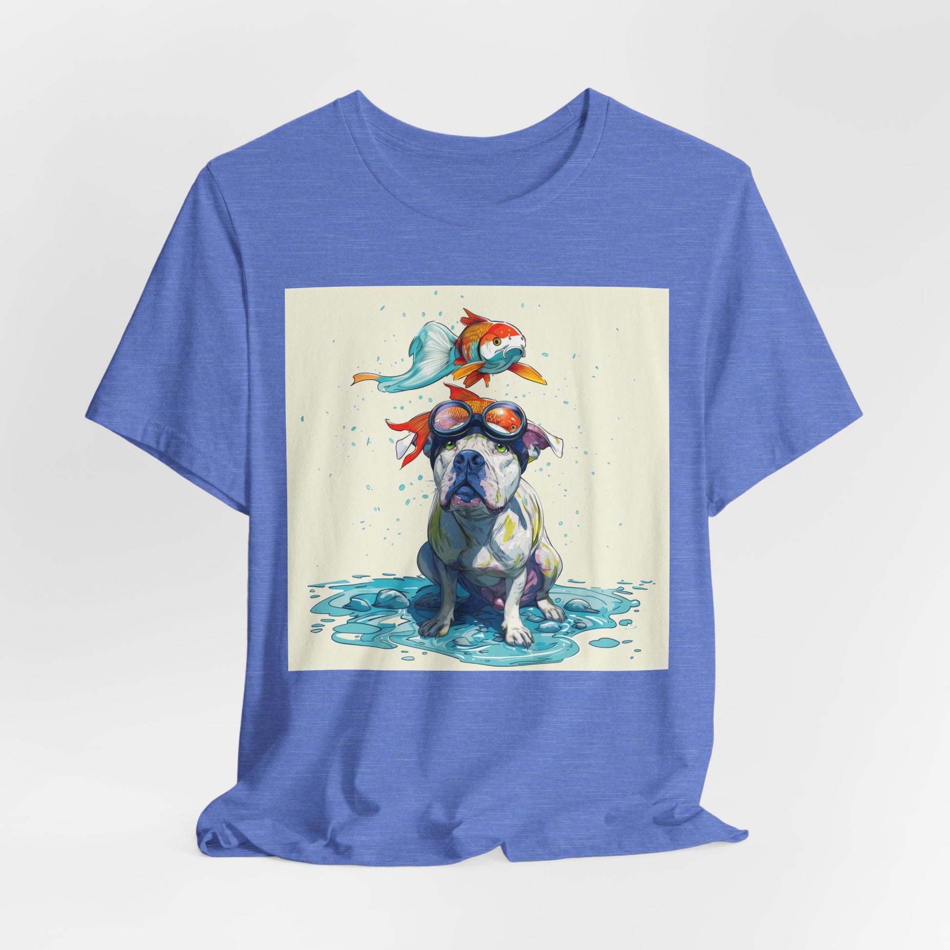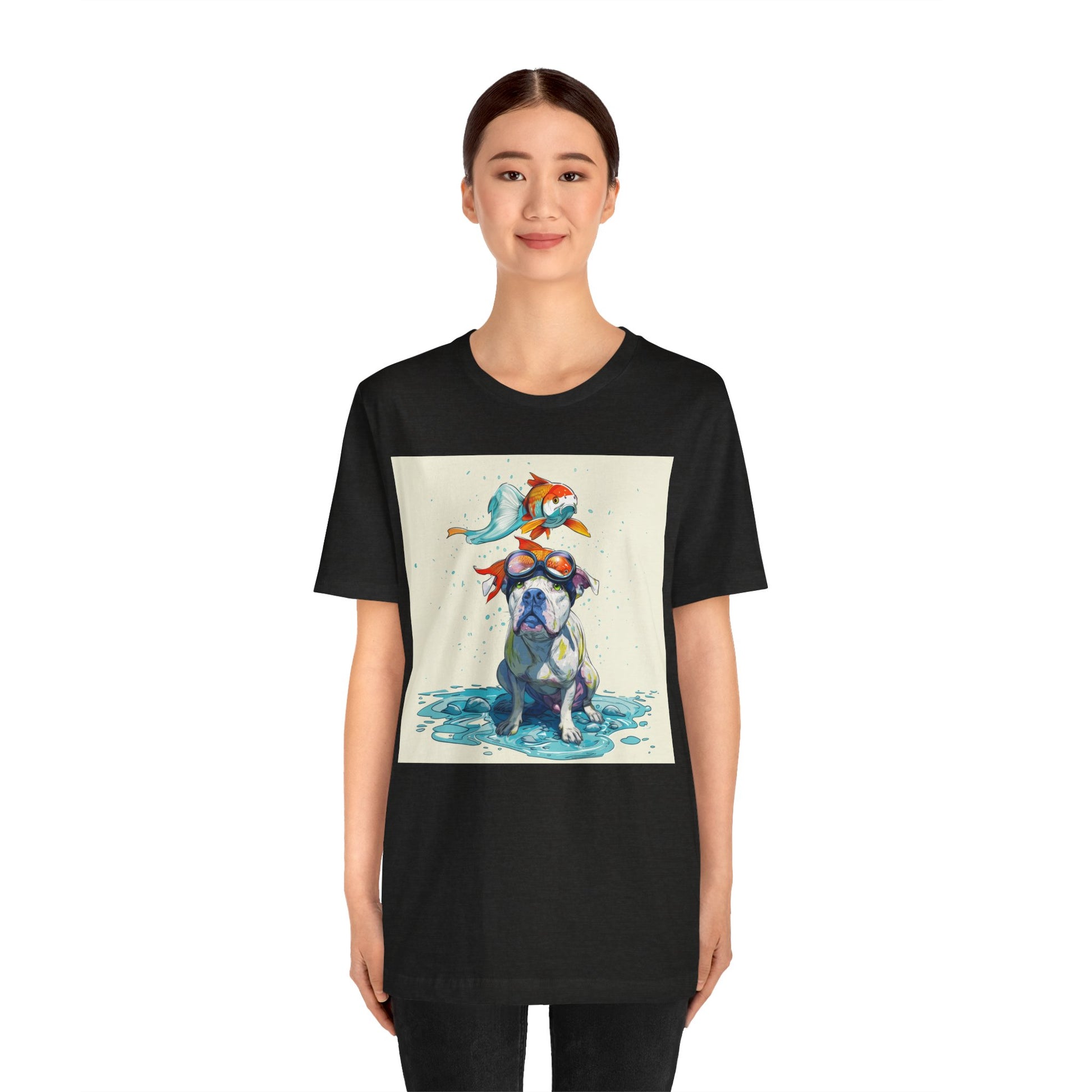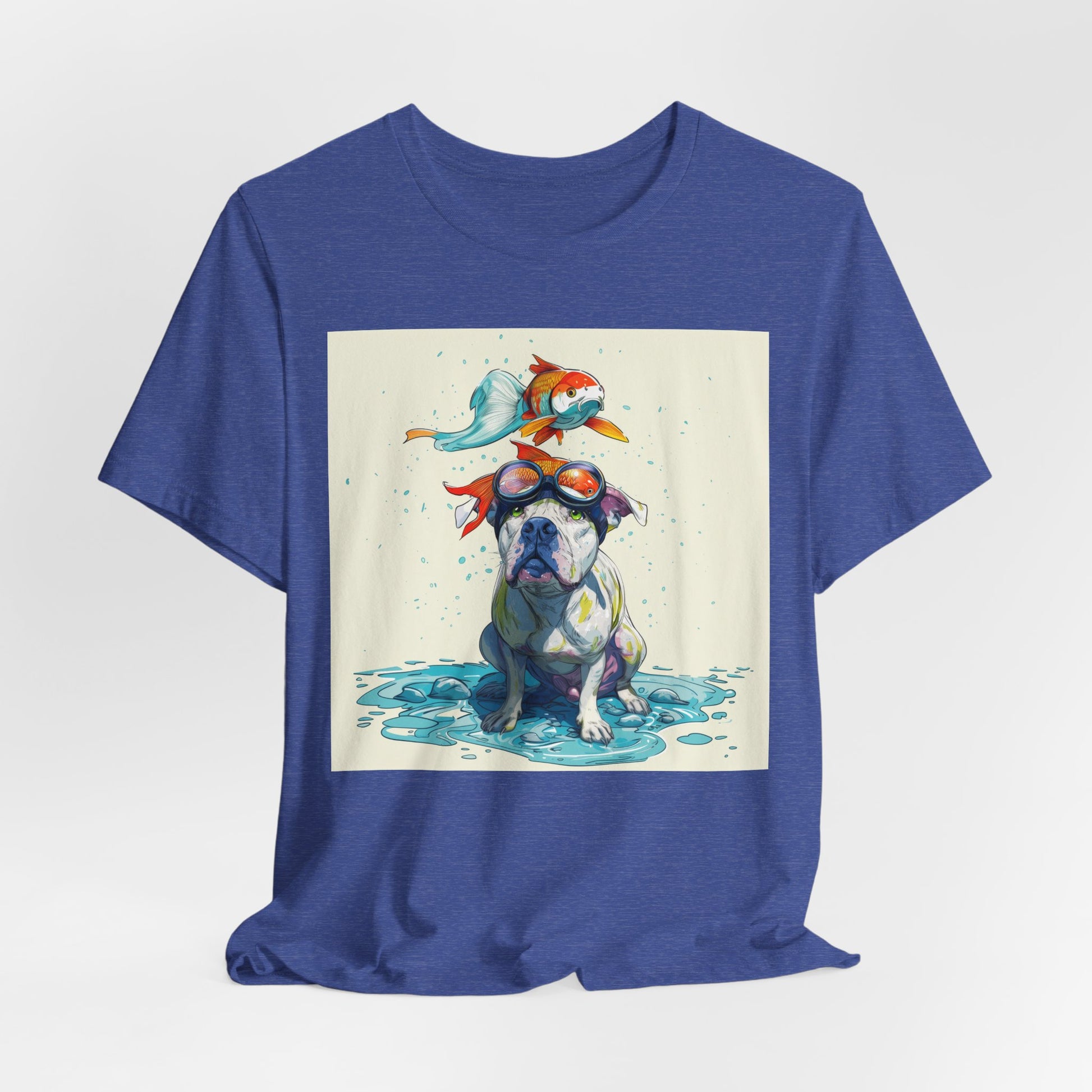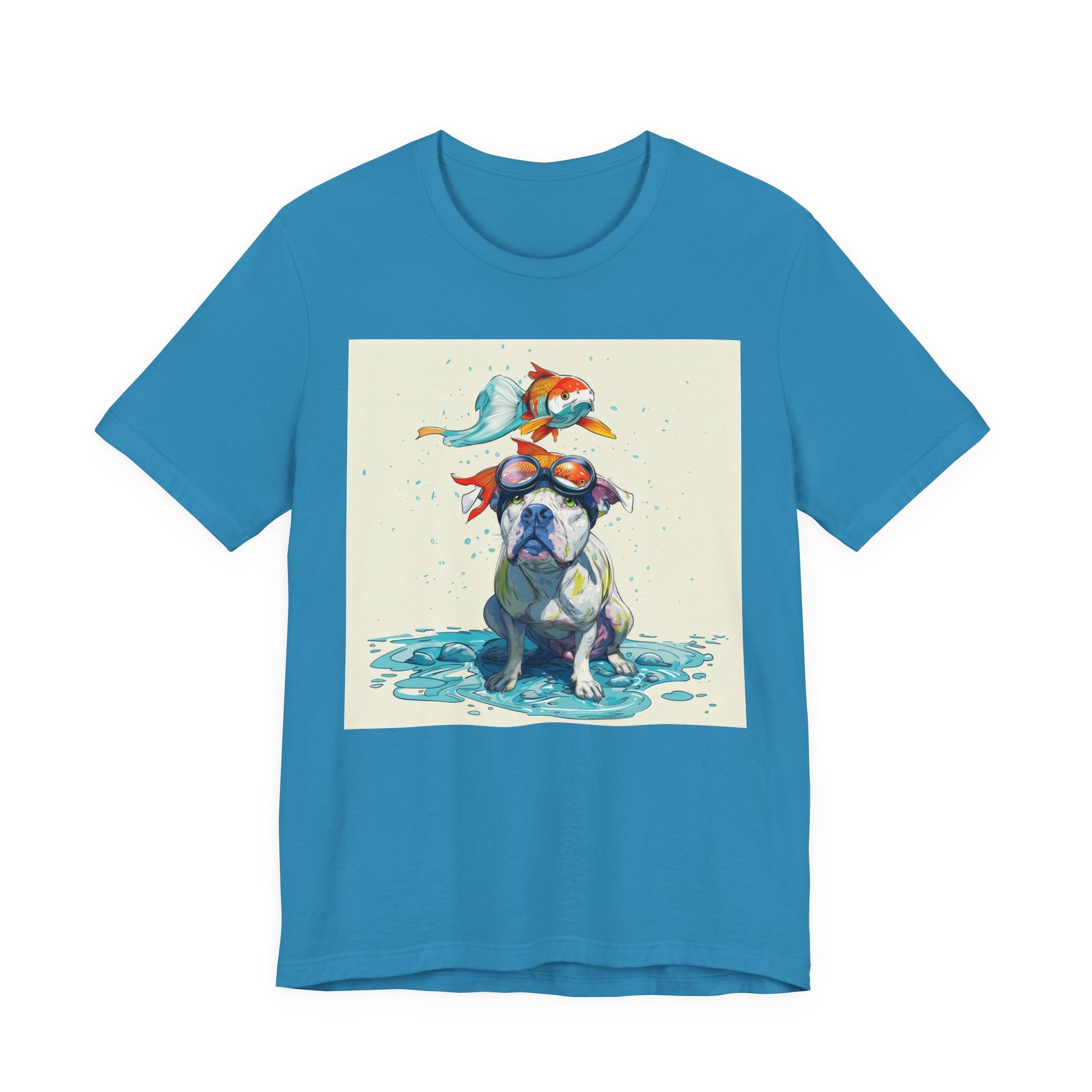 Meet the goofiest pup you’ll ever see! This playful design features a happy pitbull wearing goggles with a colorful koi fish balancing on his head—perfectly ridiculous and absolutely adorable. Full of vibrant colors and silly charm, it’s a shirt that brings smiles wherever it goes.