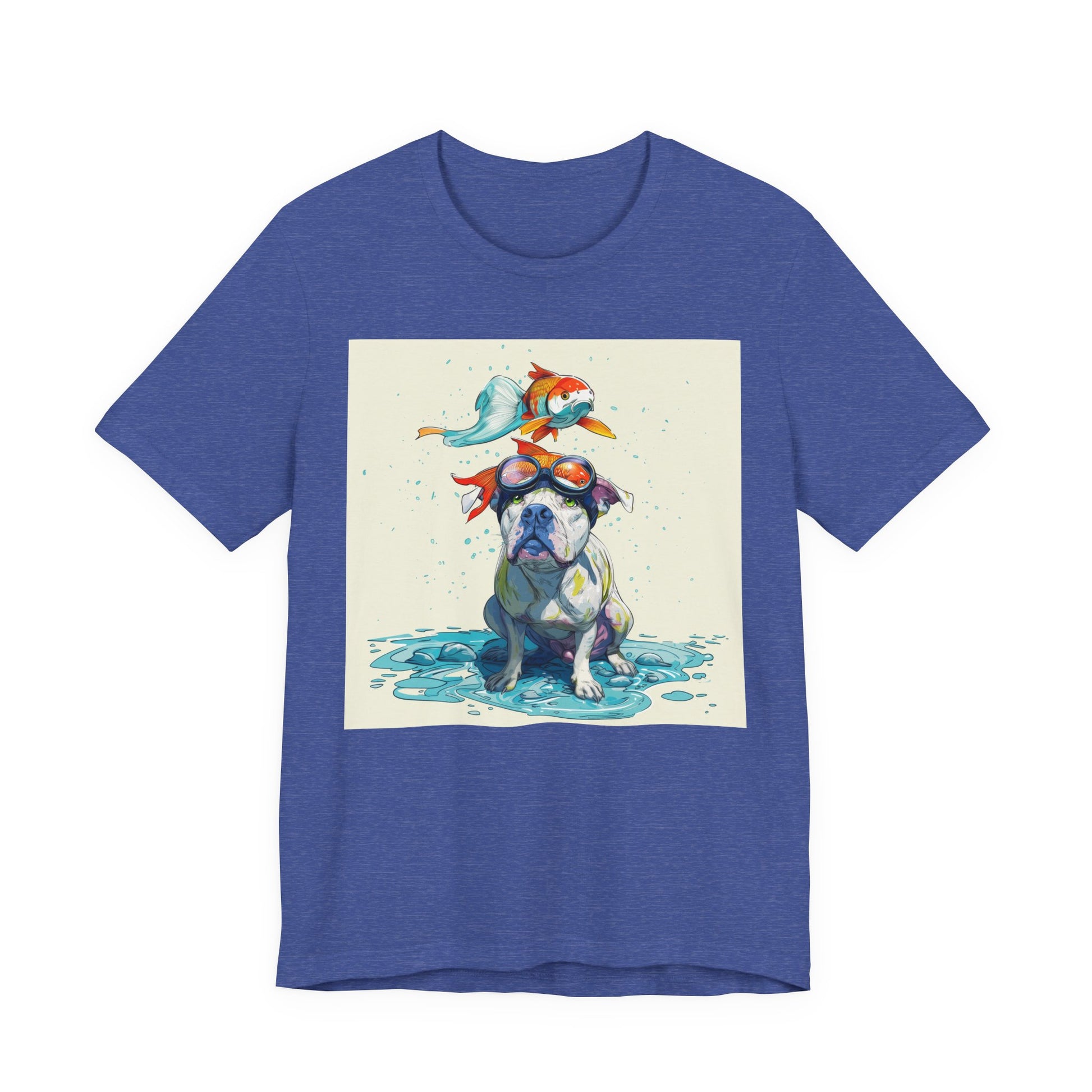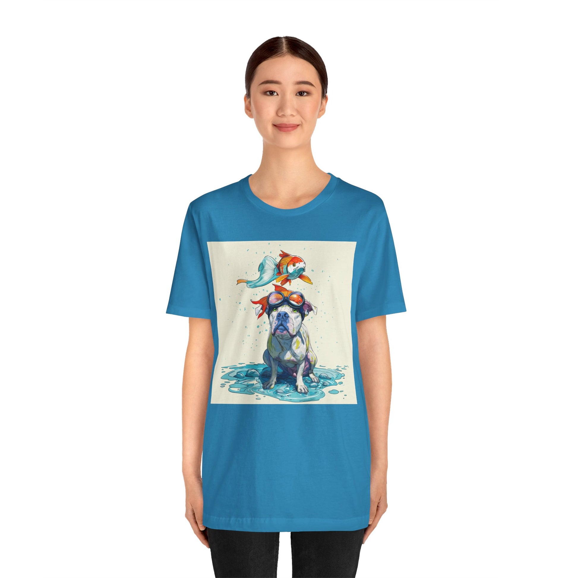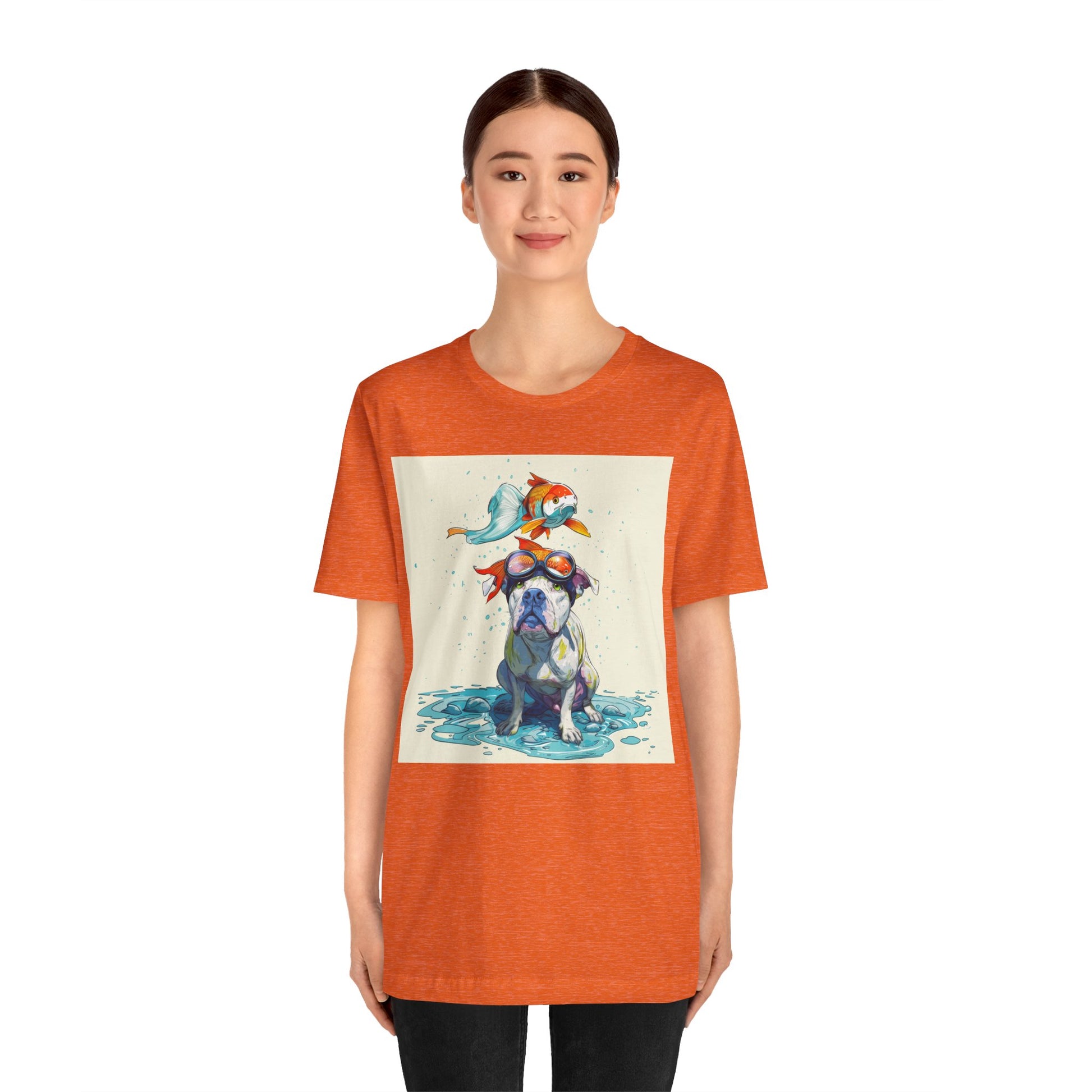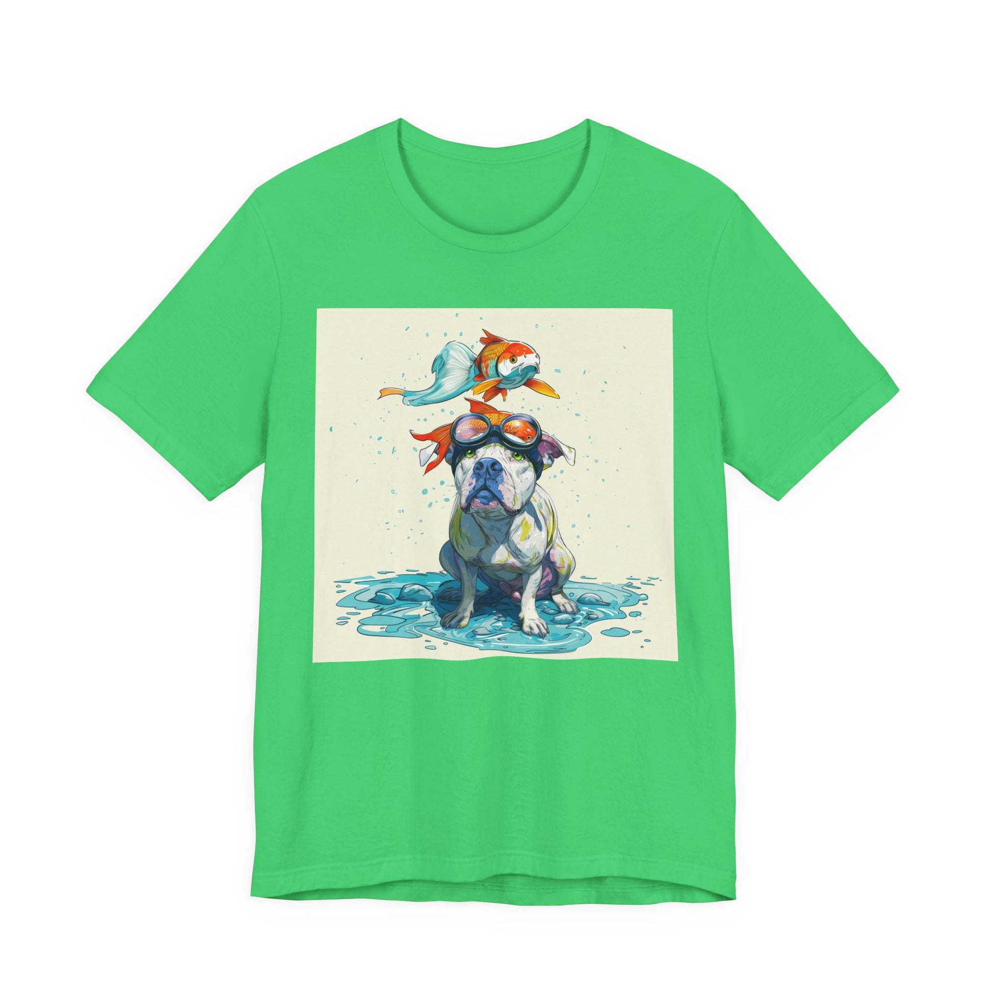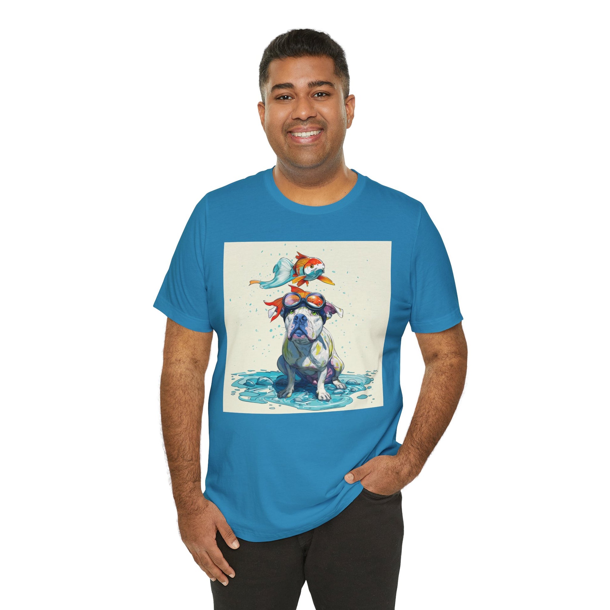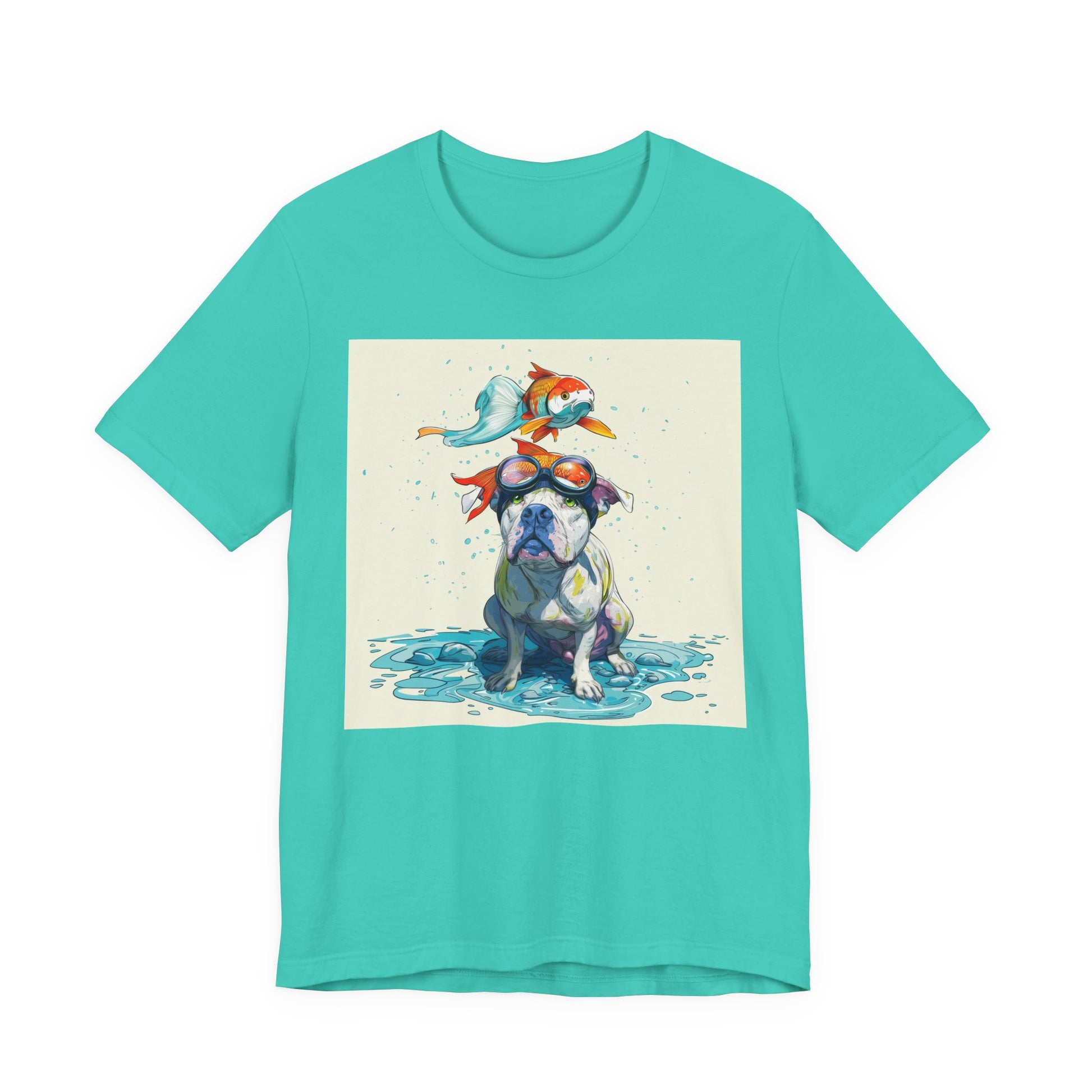 Meet the goofiest pup you’ll ever see! This playful design features a happy pitbull wearing goggles with a colorful koi fish balancing on his head—perfectly ridiculous and absolutely adorable. Full of vibrant colors and silly charm, it’s a shirt that brings smiles wherever it goes.