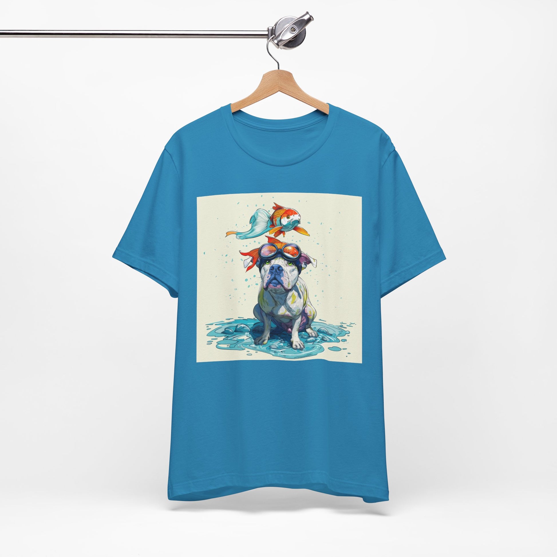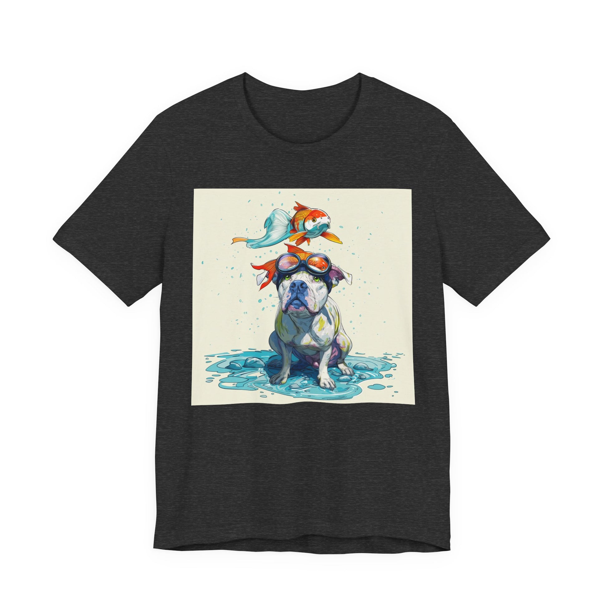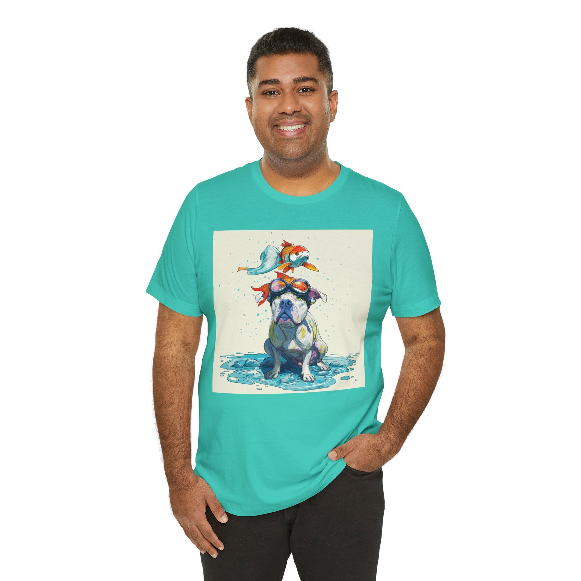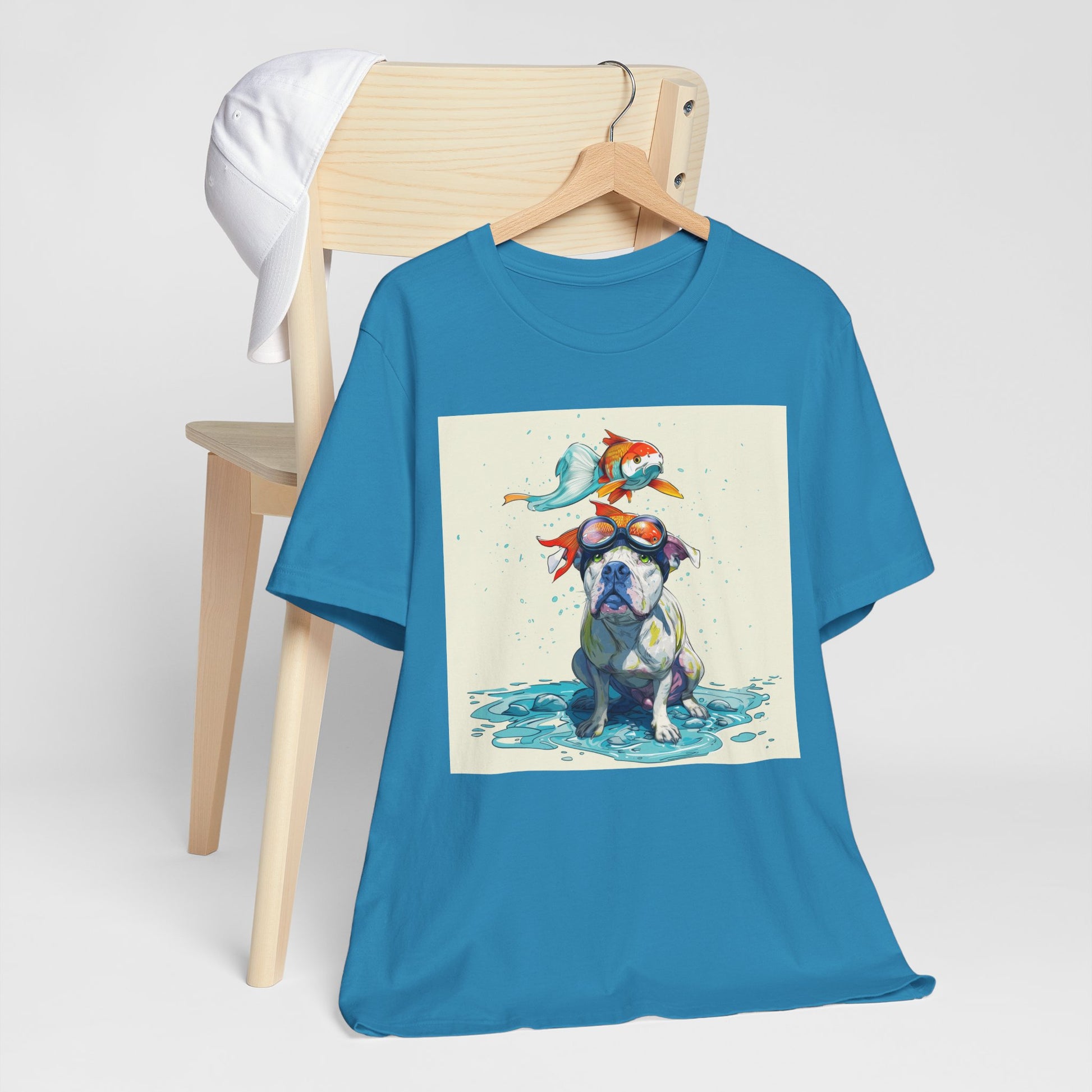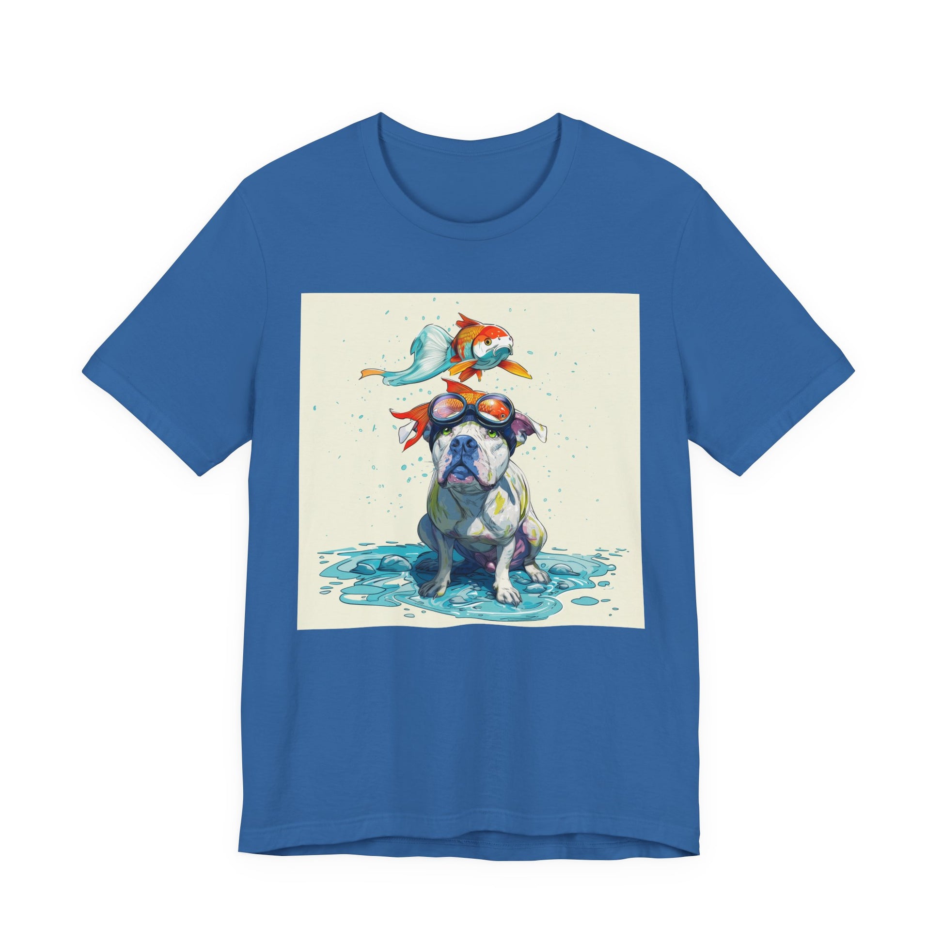 Meet the goofiest pup you’ll ever see! This playful design features a happy pitbull wearing goggles with a colorful koi fish balancing on his head—perfectly ridiculous and absolutely adorable. Full of vibrant colors and silly charm, it’s a shirt that brings smiles wherever it goes.