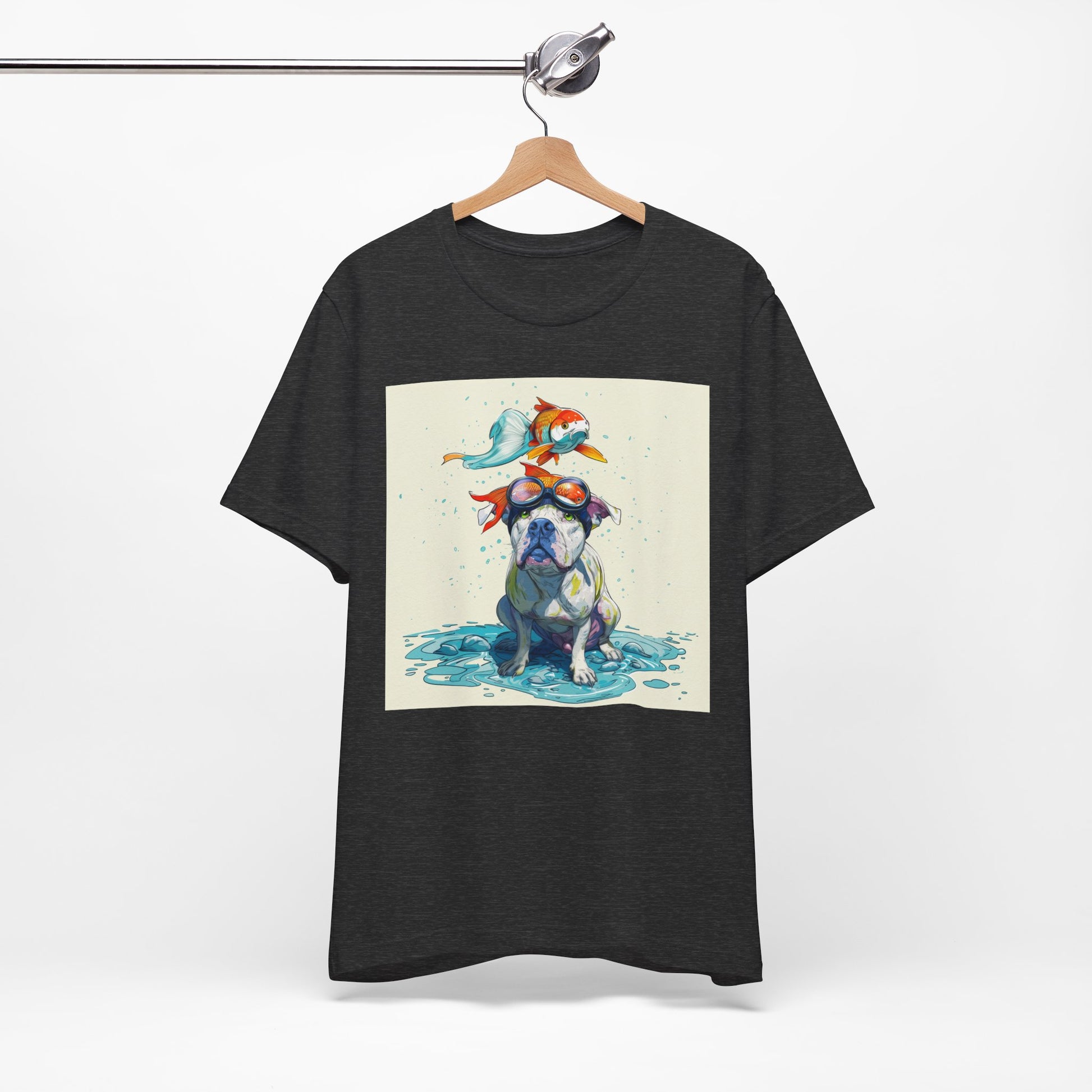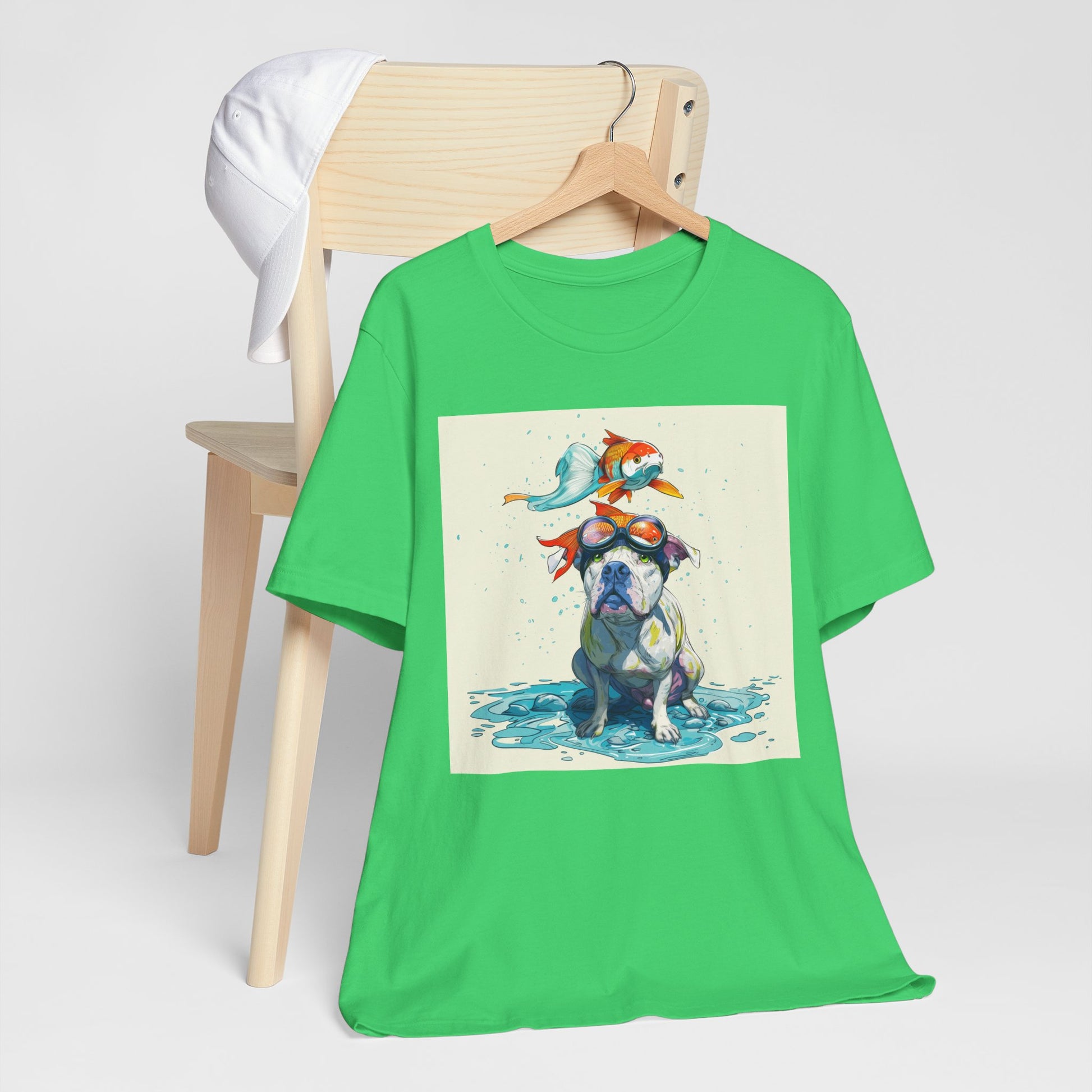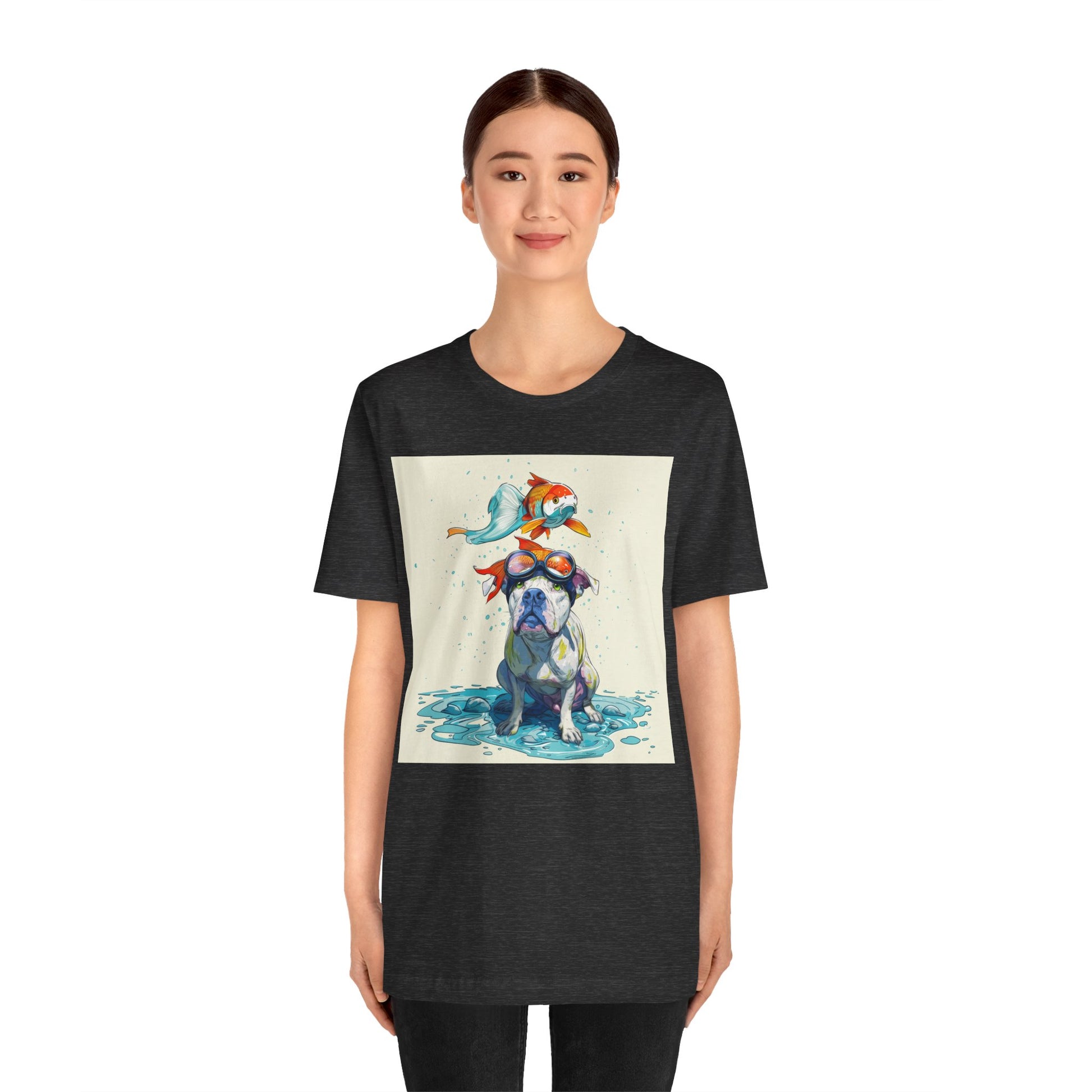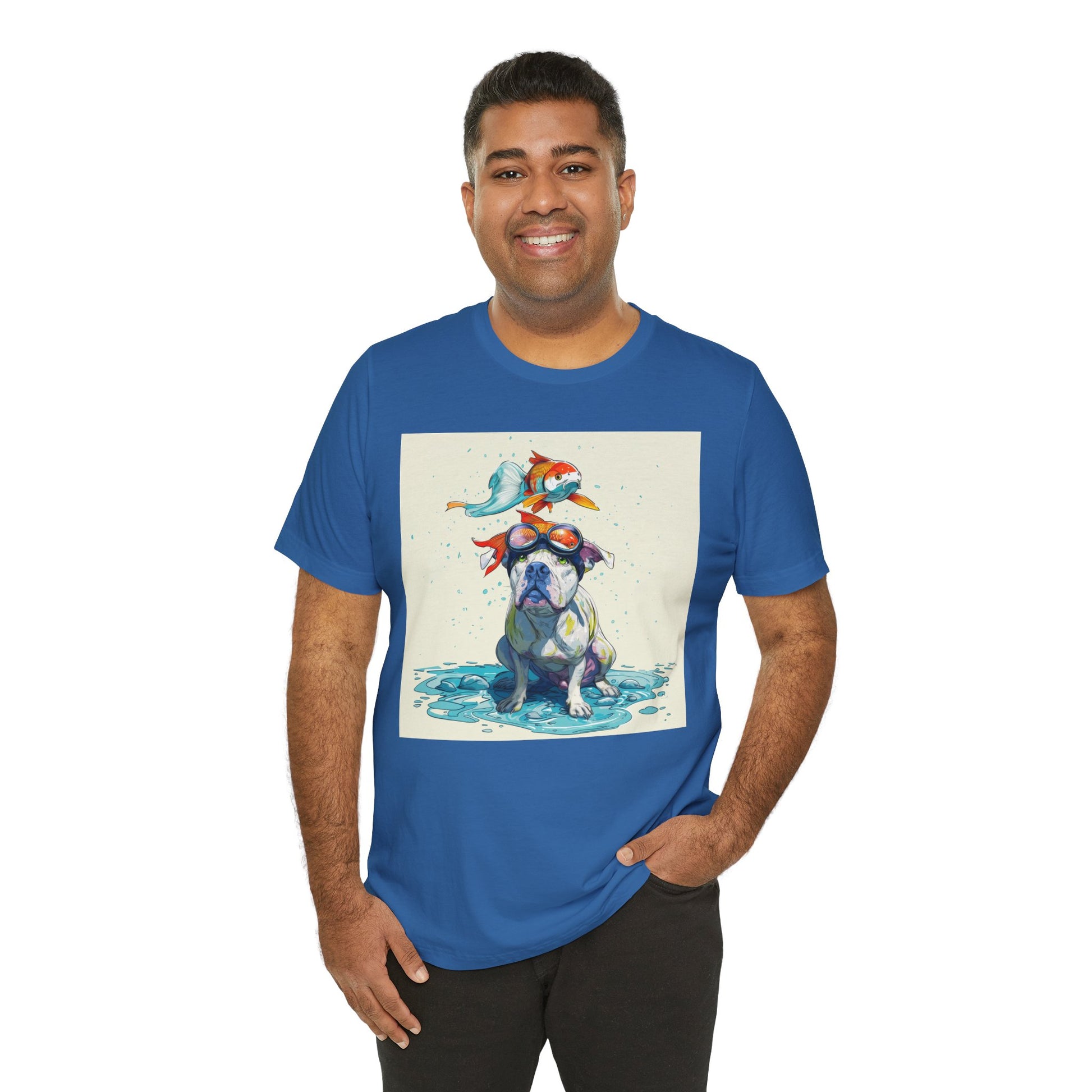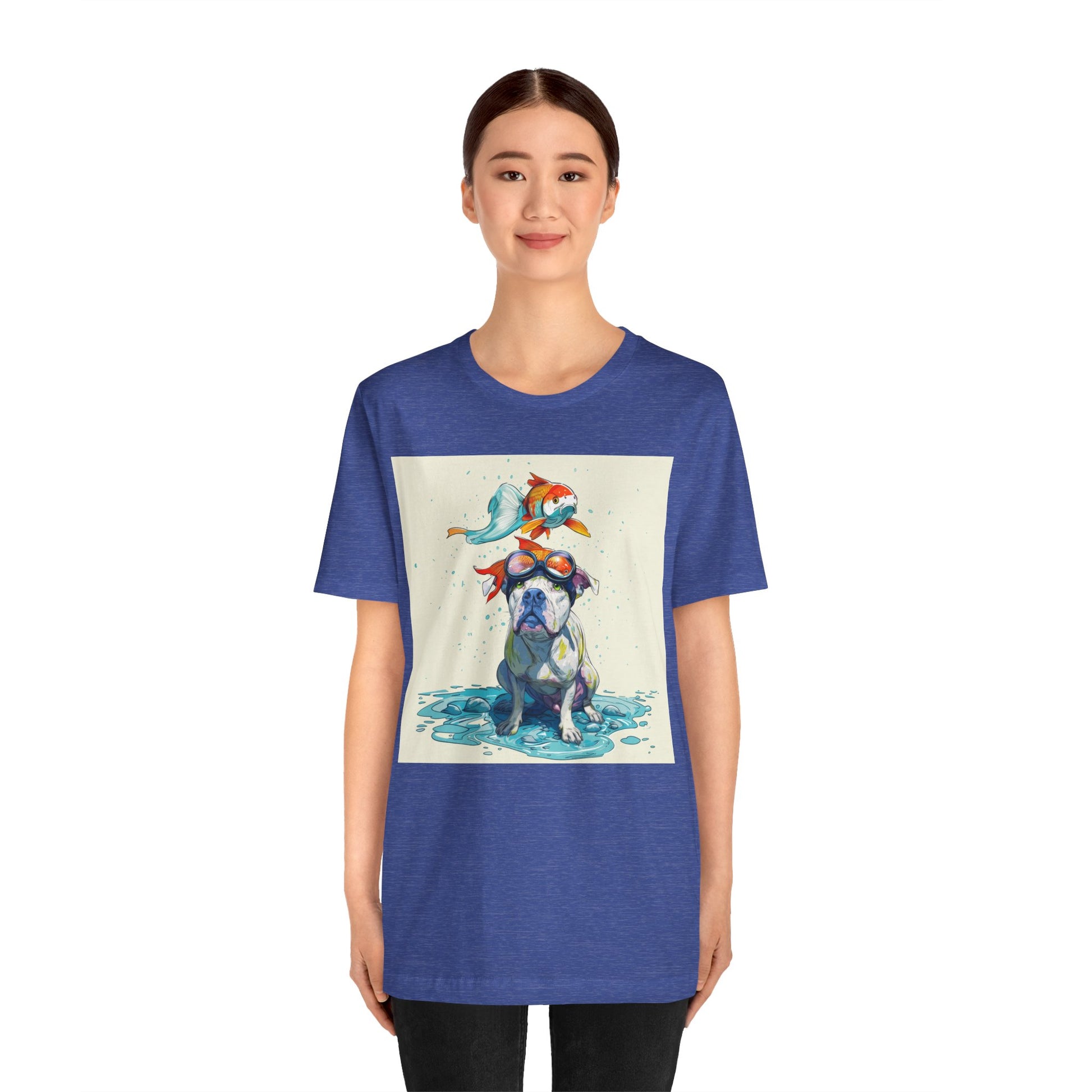 Meet the goofiest pup you’ll ever see! This playful design features a happy pitbull wearing goggles with a colorful koi fish balancing on his head—perfectly ridiculous and absolutely adorable. Full of vibrant colors and silly charm, it’s a shirt that brings smiles wherever it goes.
