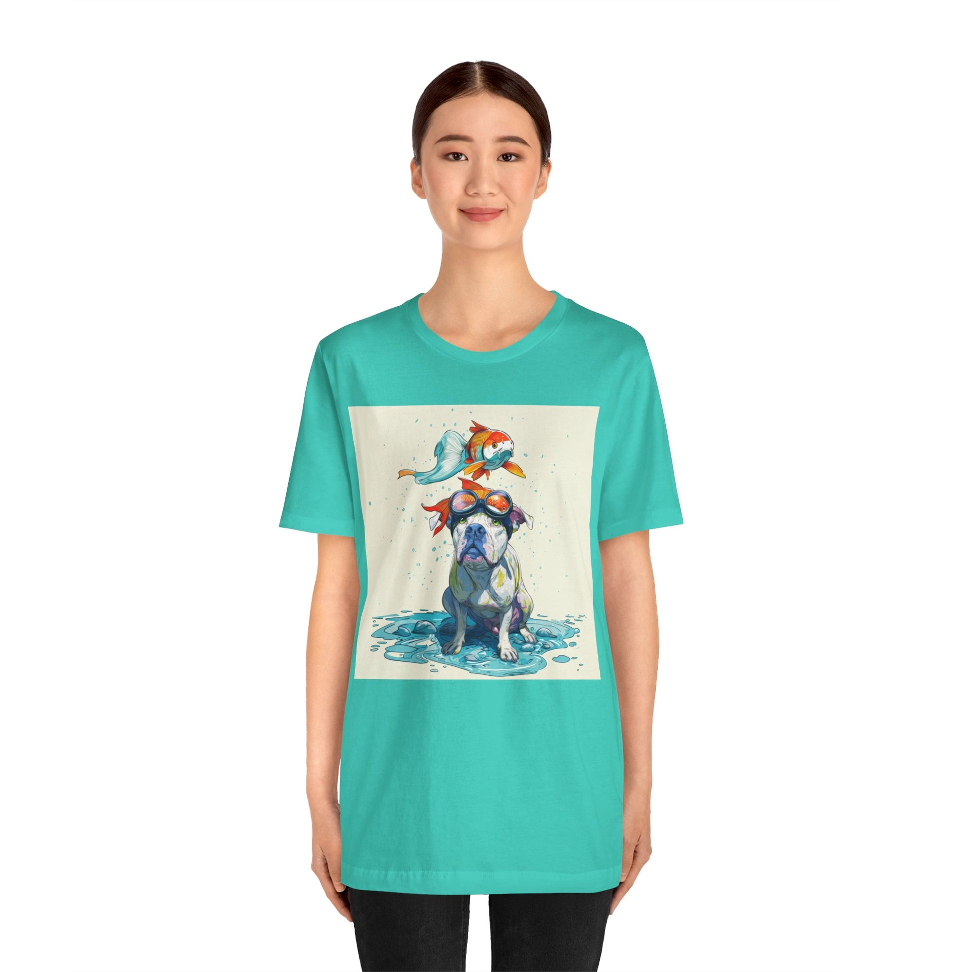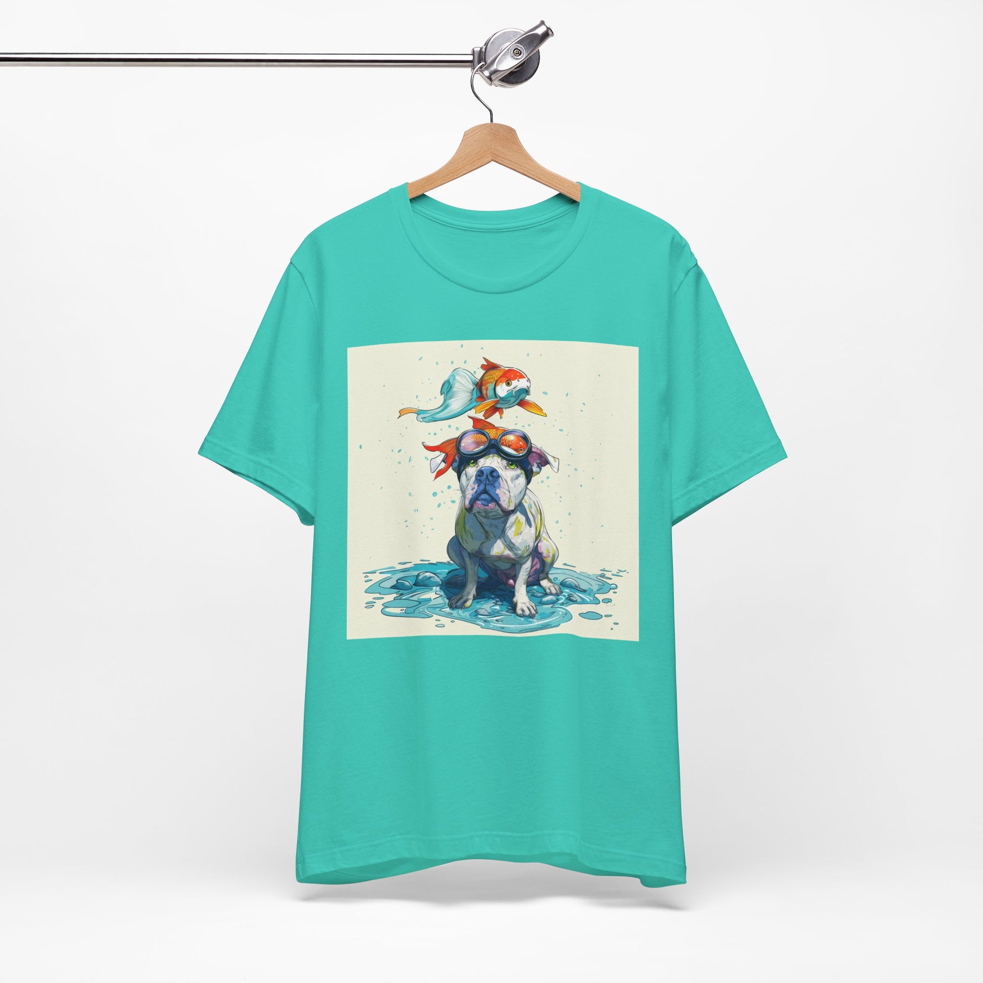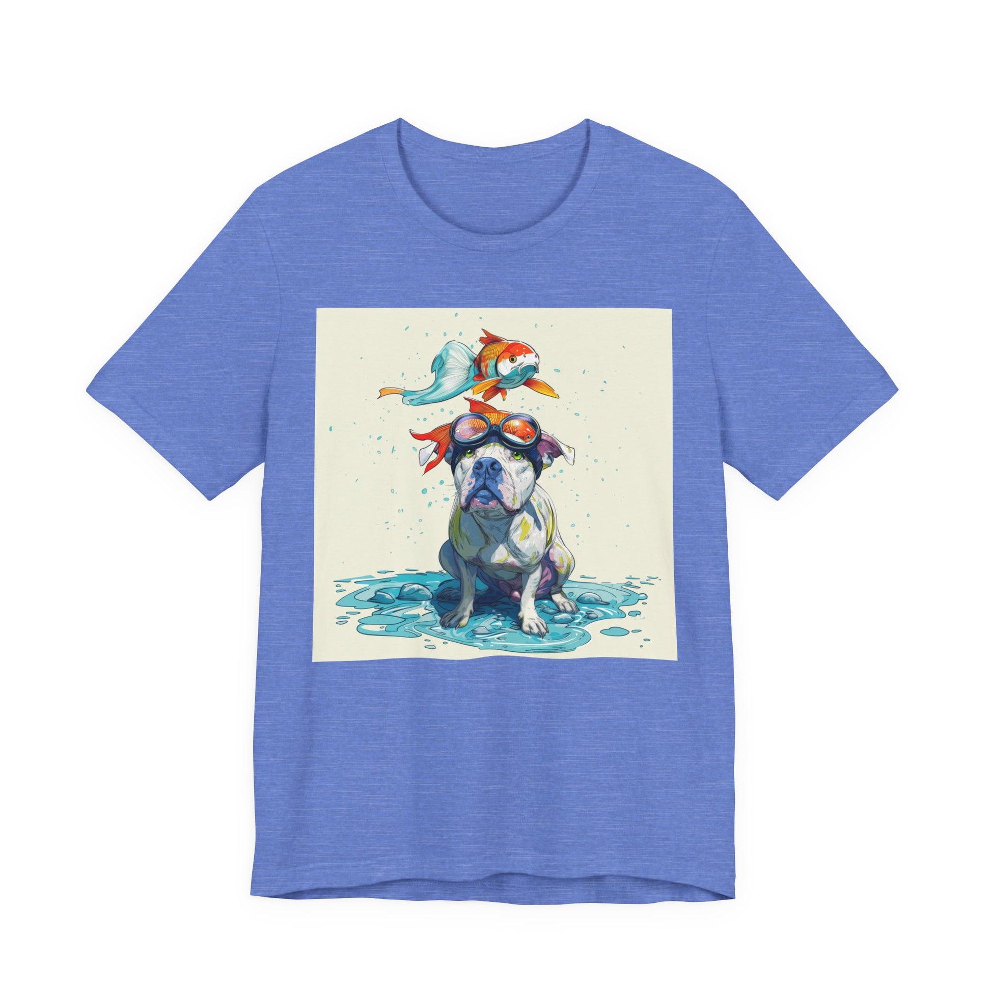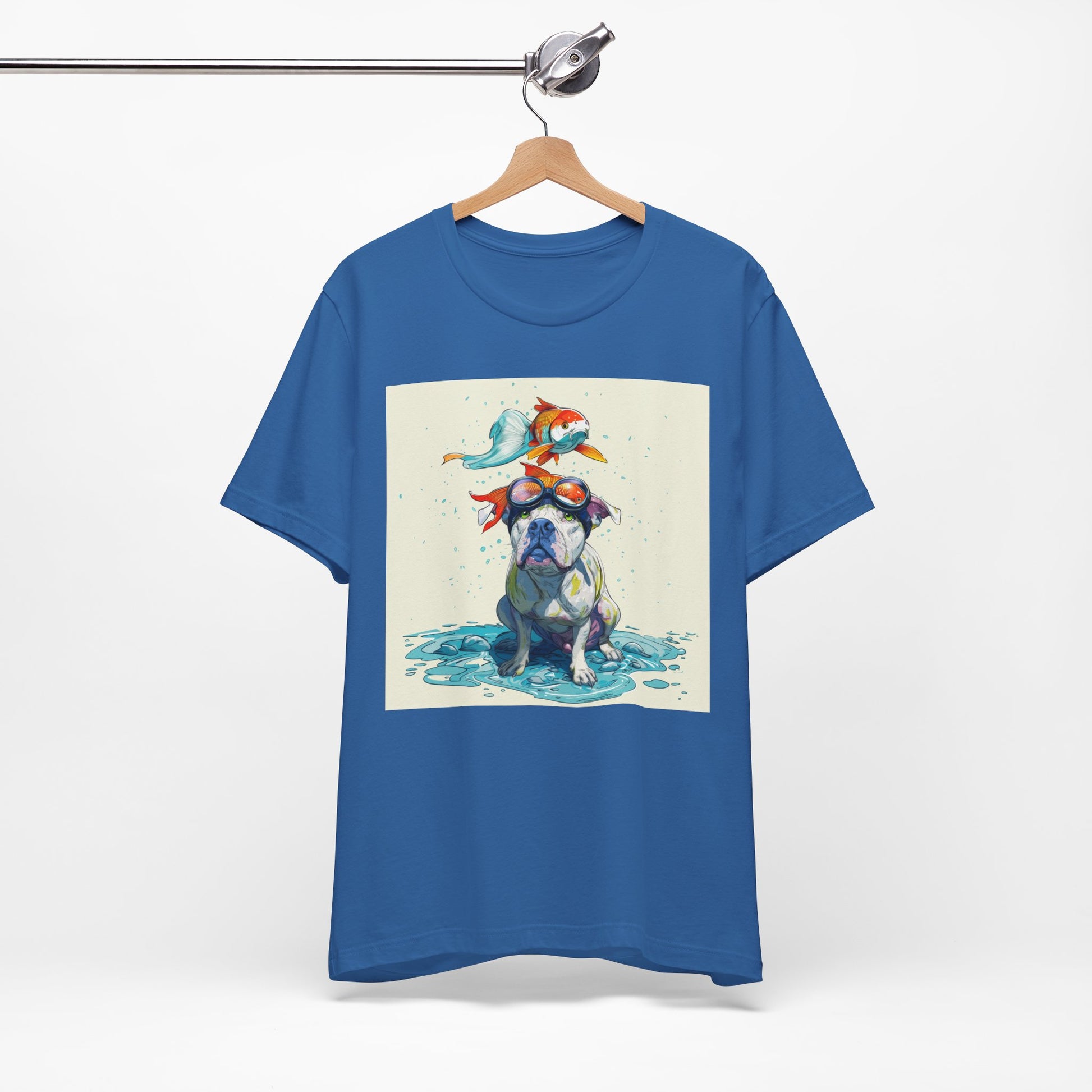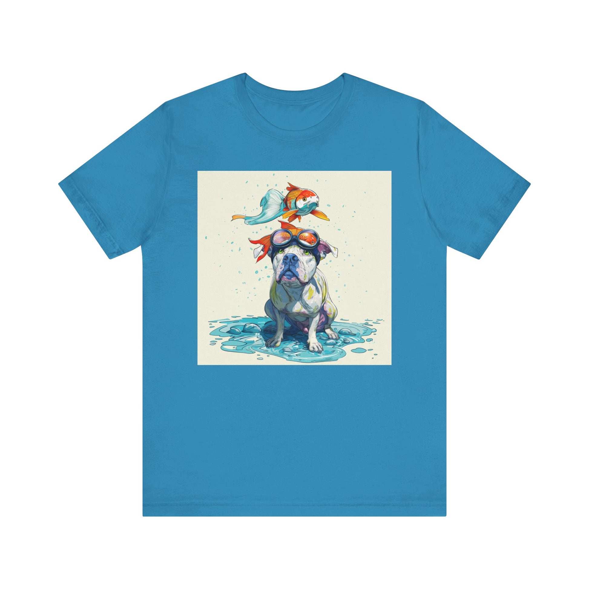 Meet the goofiest pup you’ll ever see! This playful design features a happy pitbull wearing goggles with a colorful koi fish balancing on his head—perfectly ridiculous and absolutely adorable. Full of vibrant colors and silly charm, it’s a shirt that brings smiles wherever it goes.