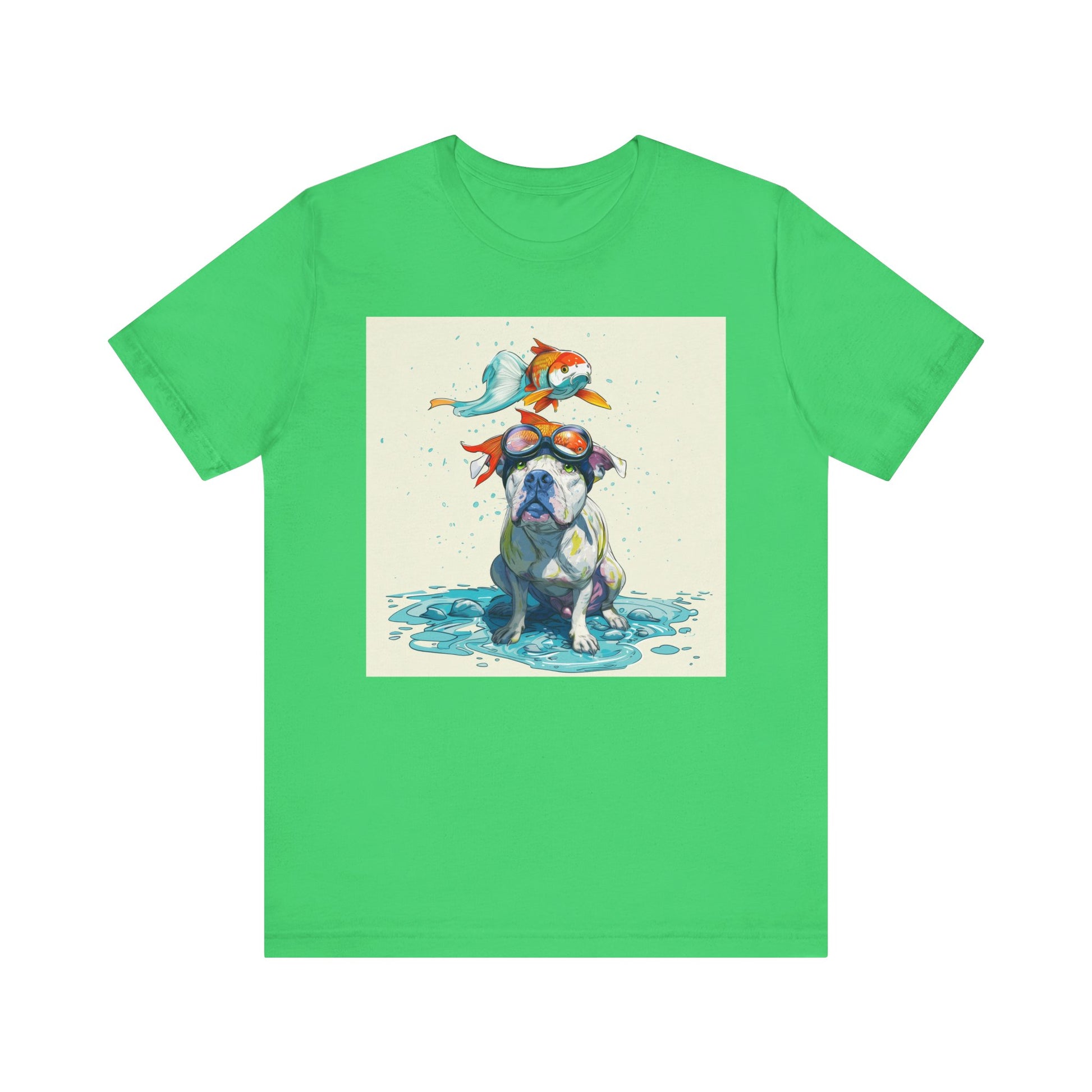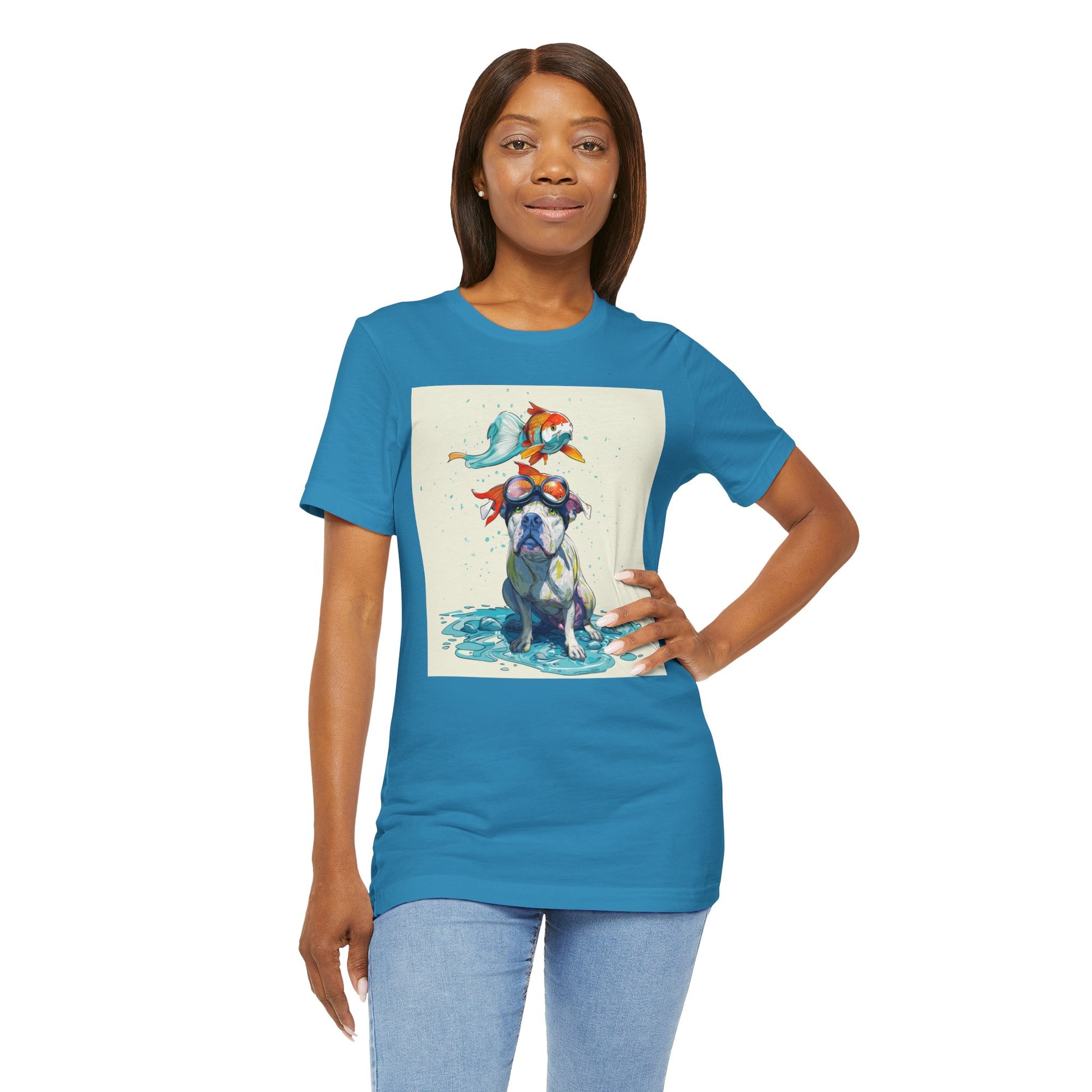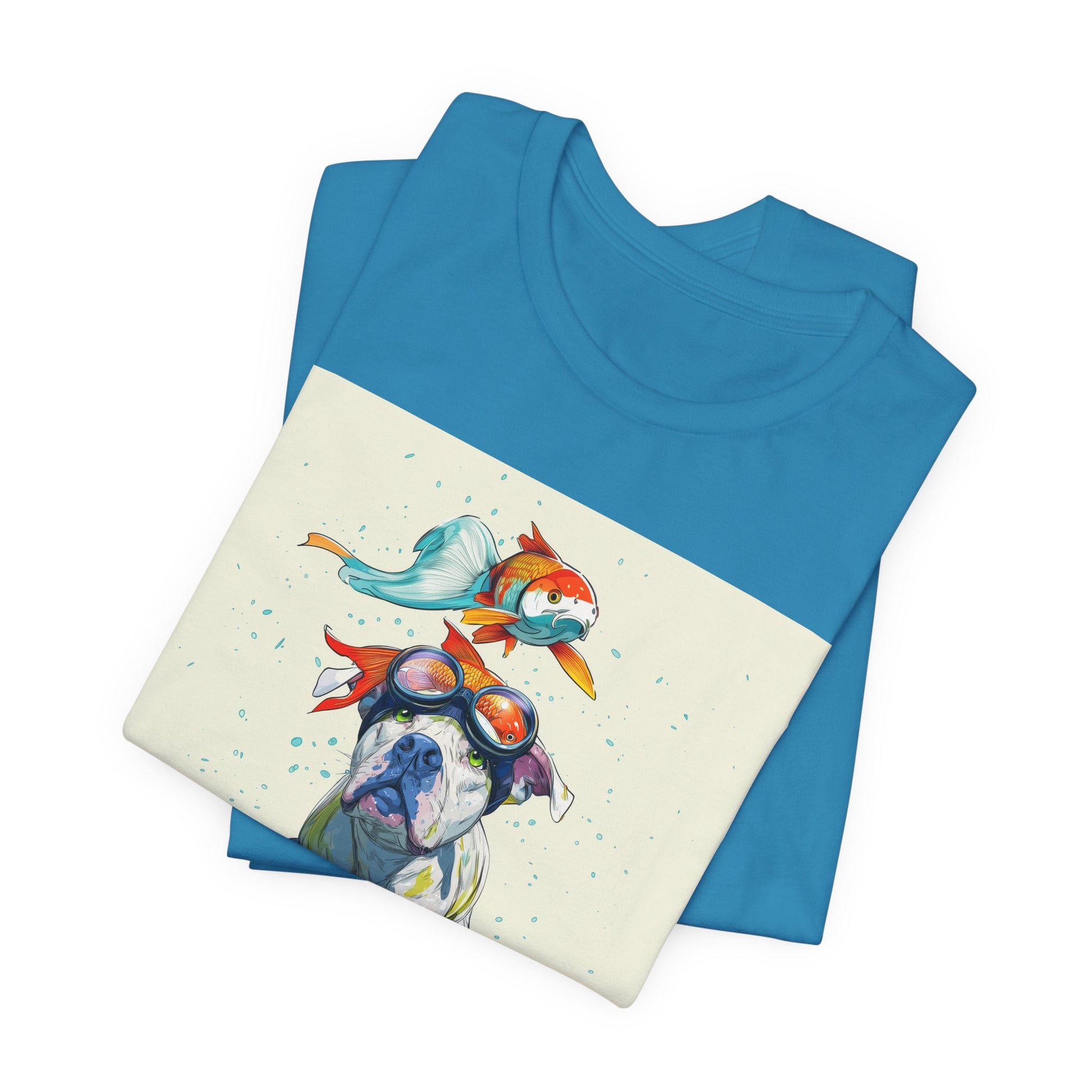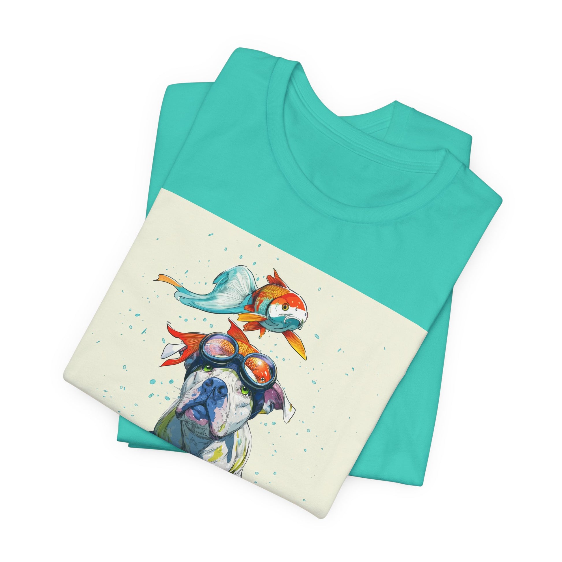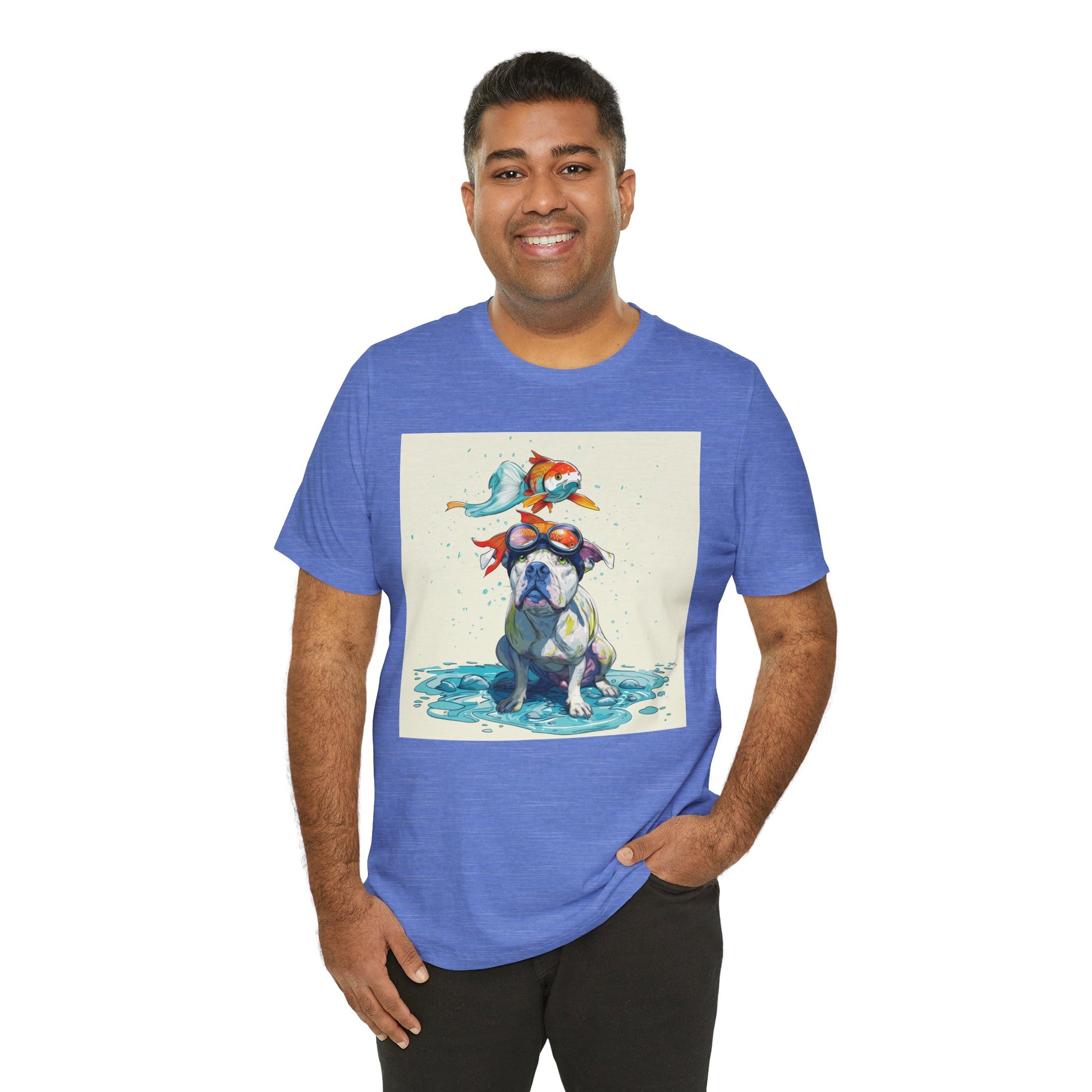 Meet the goofiest pup you’ll ever see! This playful design features a happy pitbull wearing goggles with a colorful koi fish balancing on his head—perfectly ridiculous and absolutely adorable. Full of vibrant colors and silly charm, it’s a shirt that brings smiles wherever it goes.