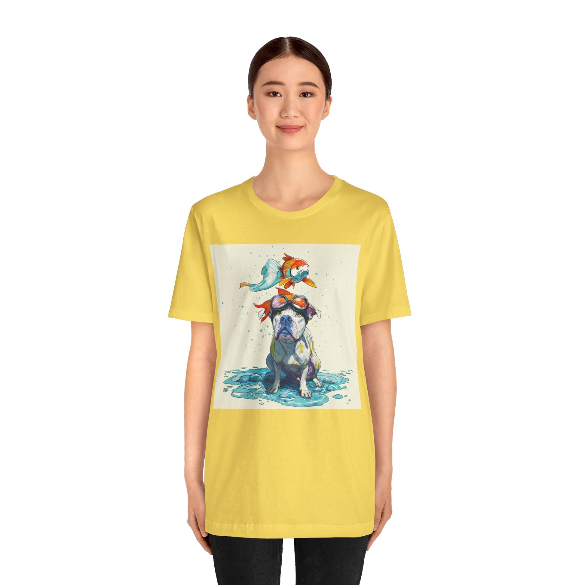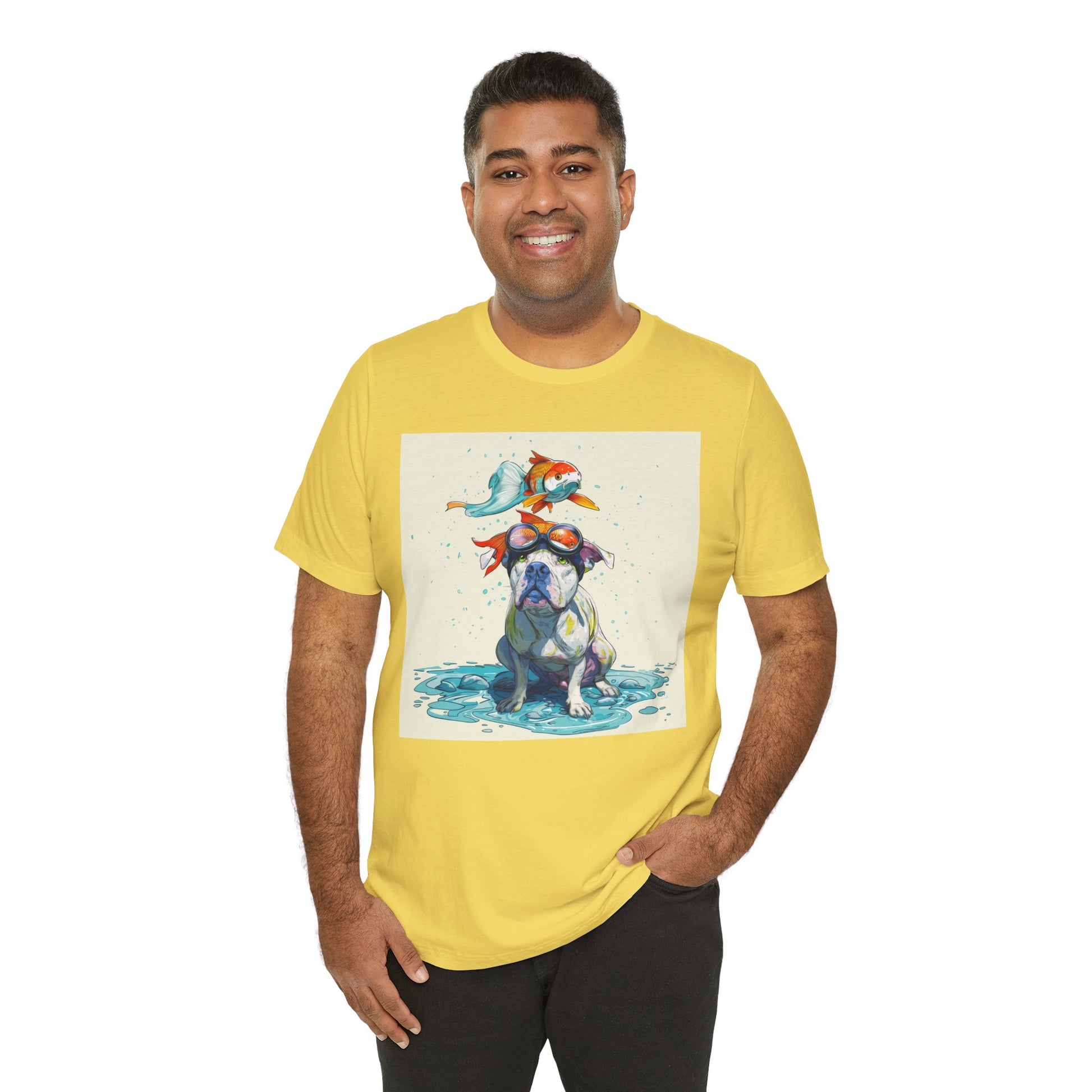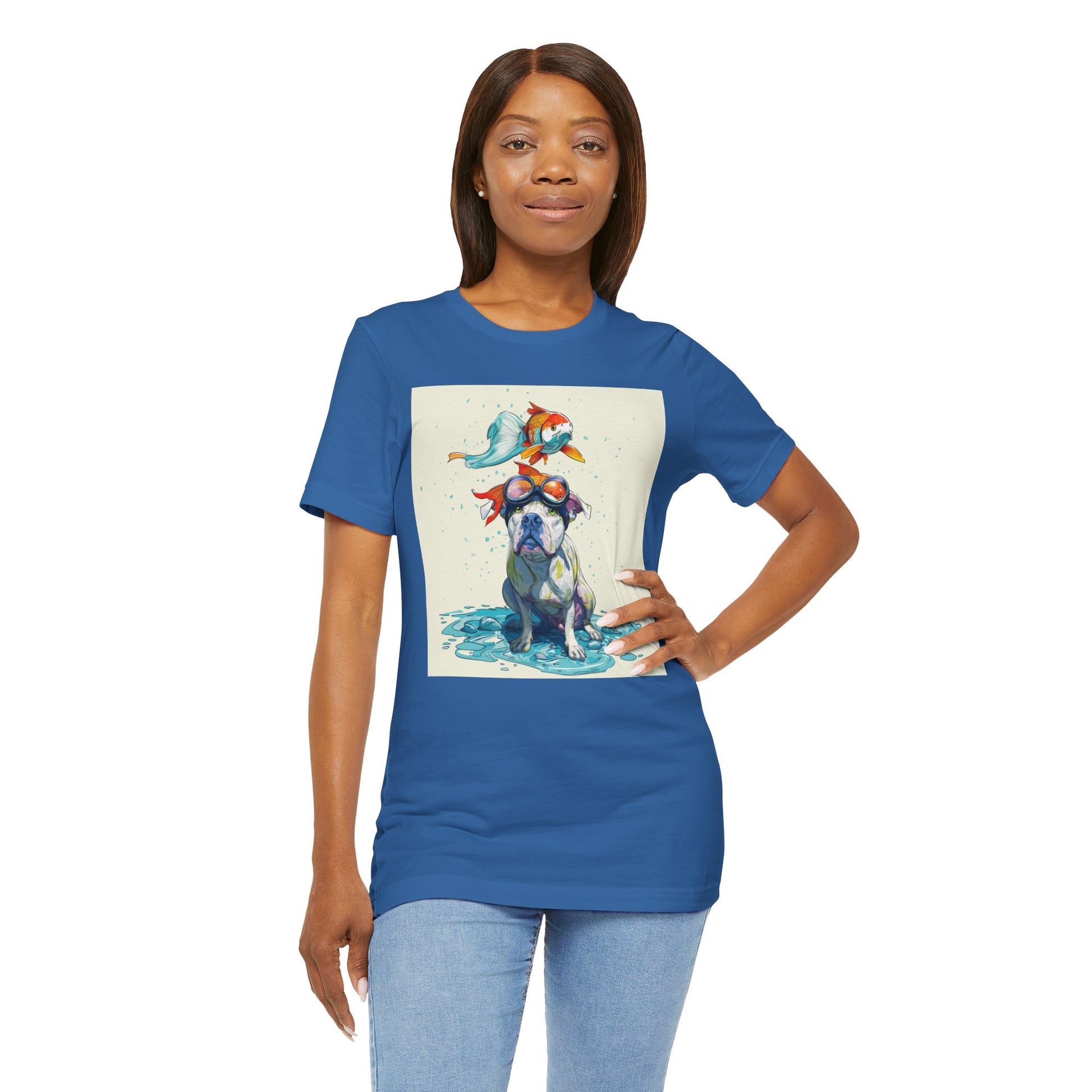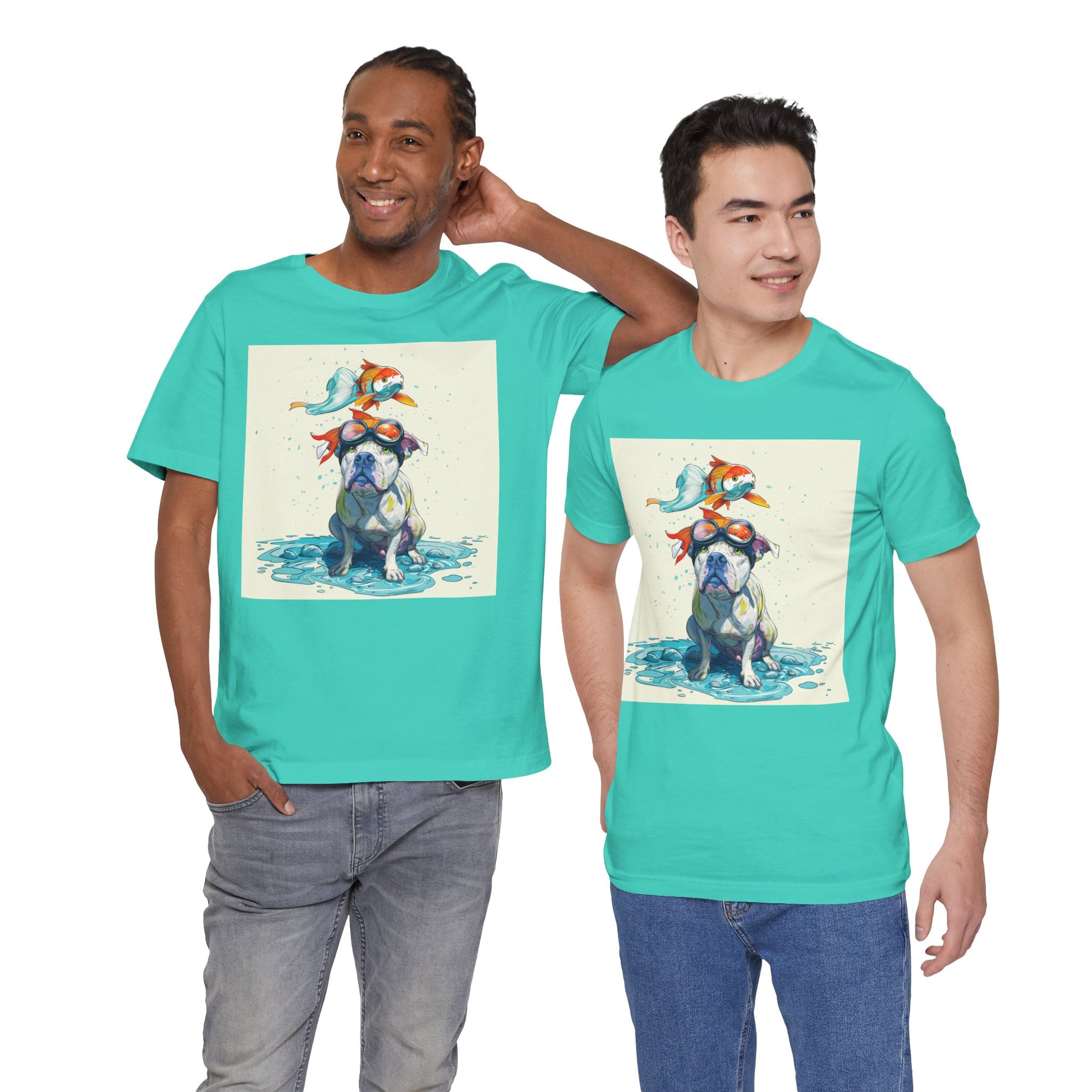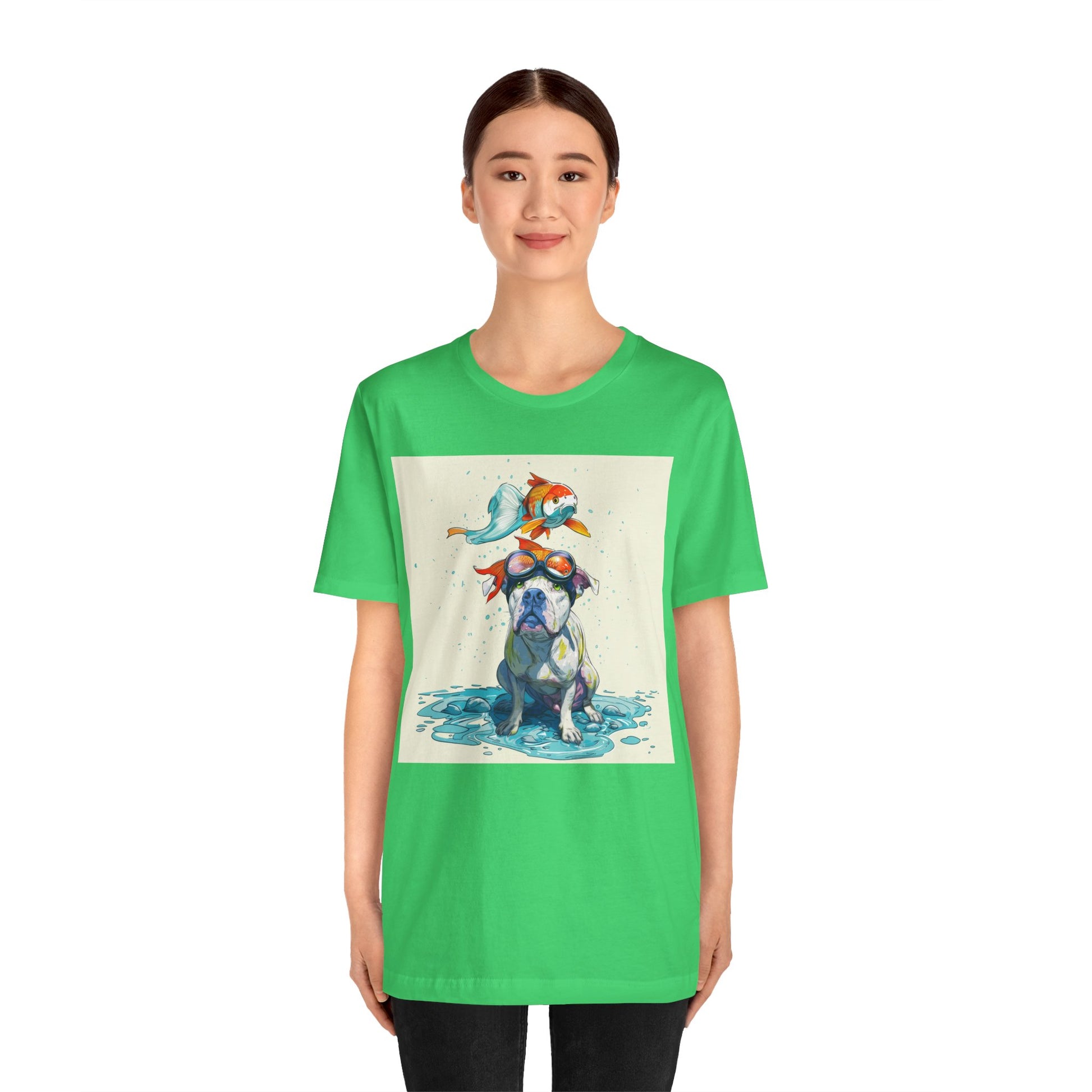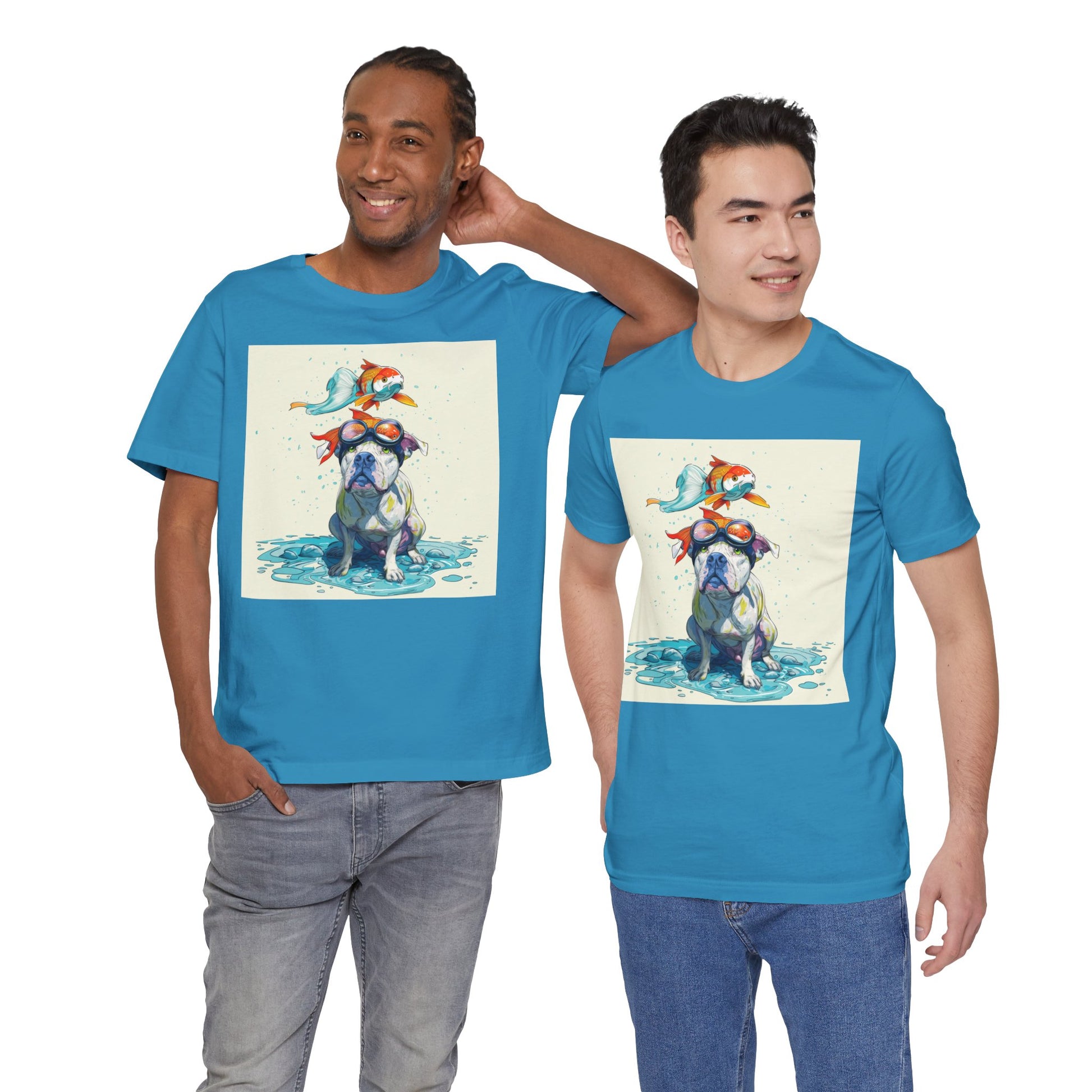 Meet the goofiest pup you’ll ever see! This playful design features a happy pitbull wearing goggles with a colorful koi fish balancing on his head—perfectly ridiculous and absolutely adorable. Full of vibrant colors and silly charm, it’s a shirt that brings smiles wherever it goes.