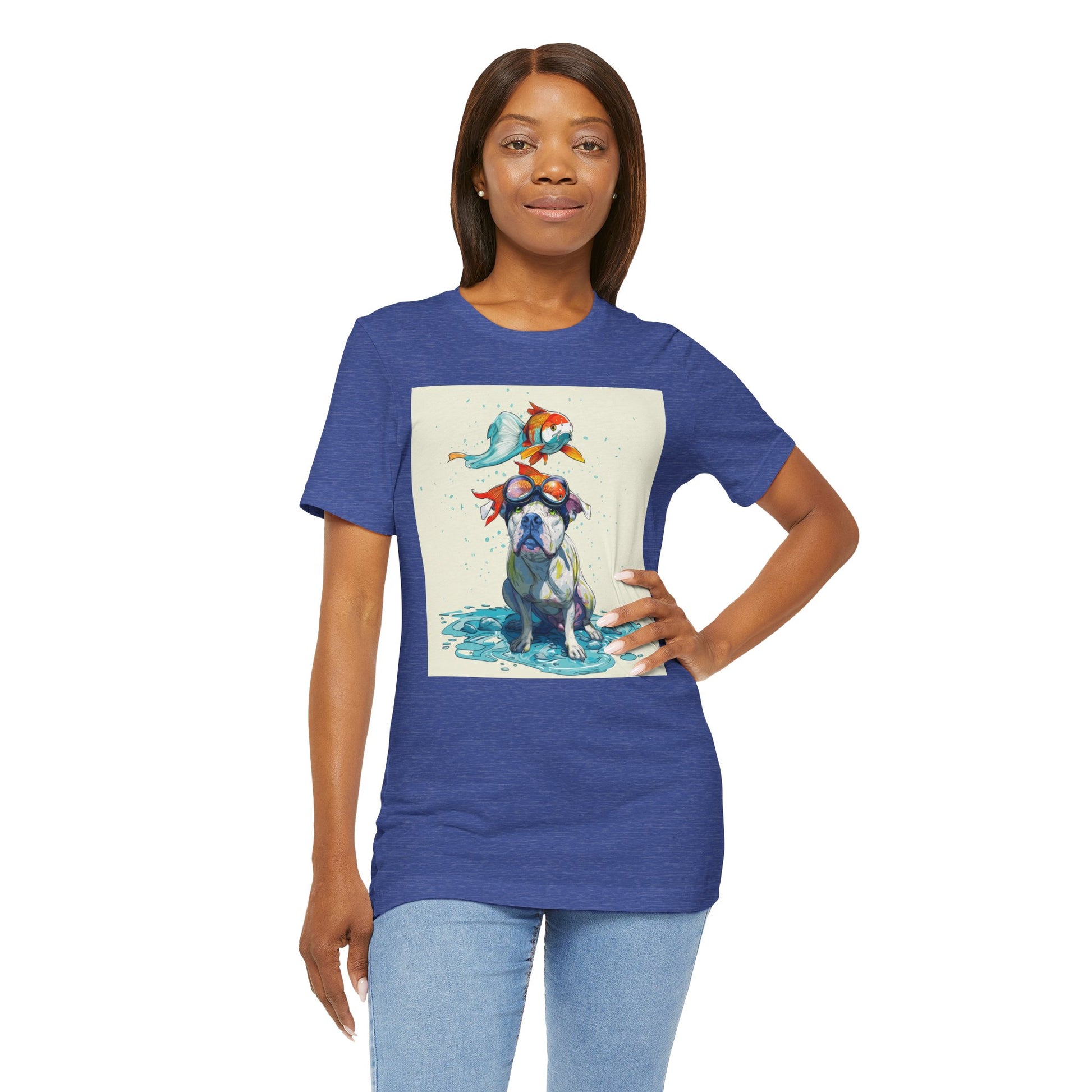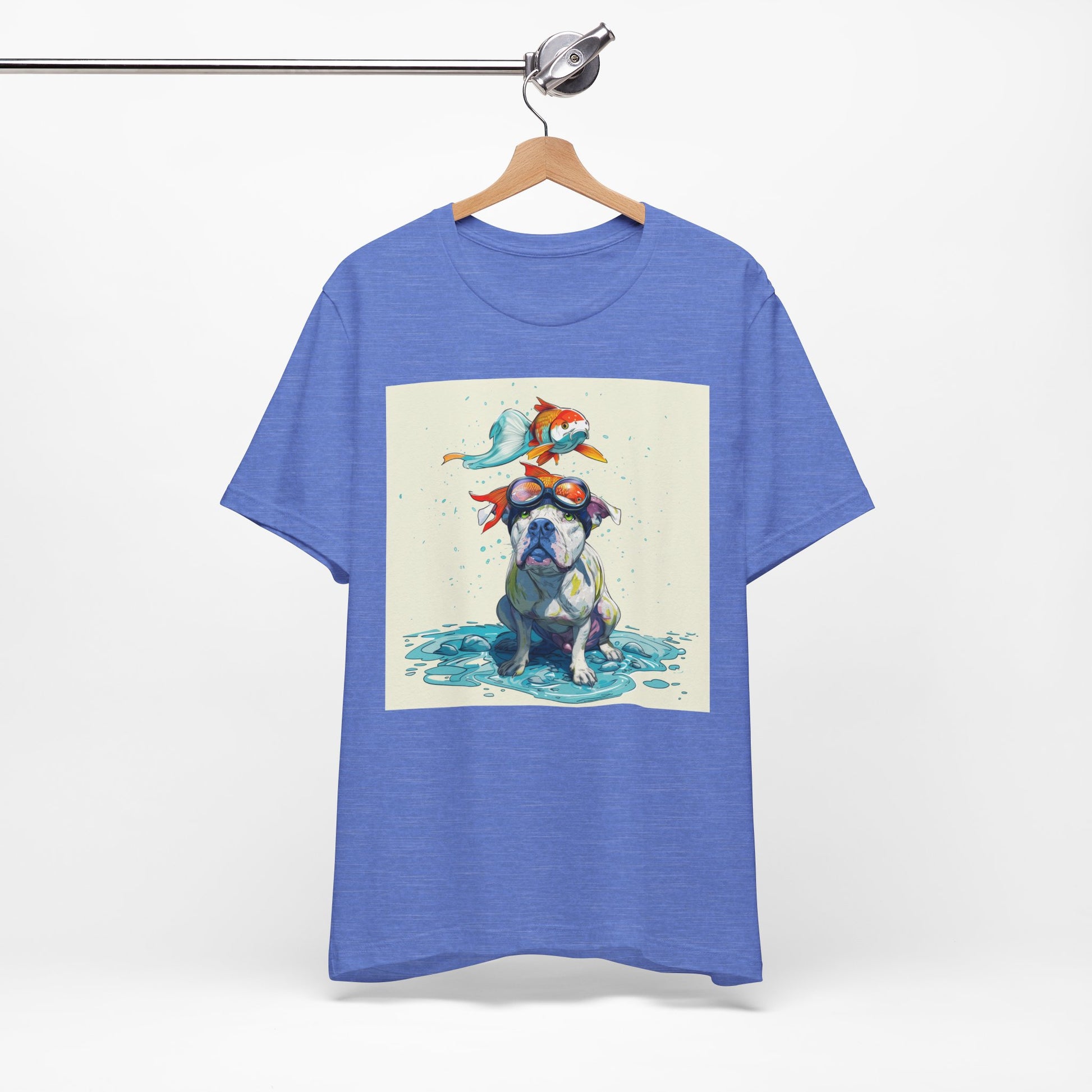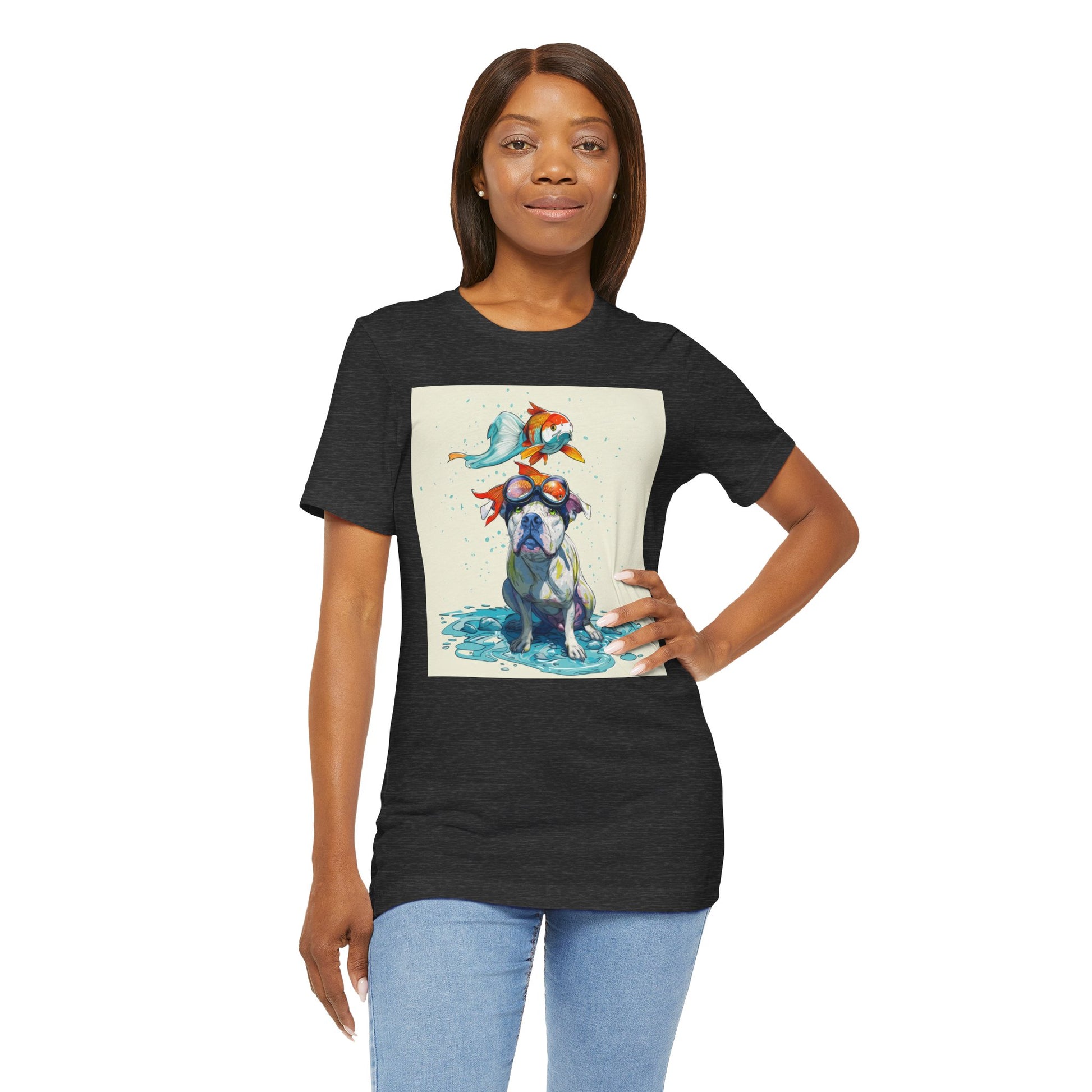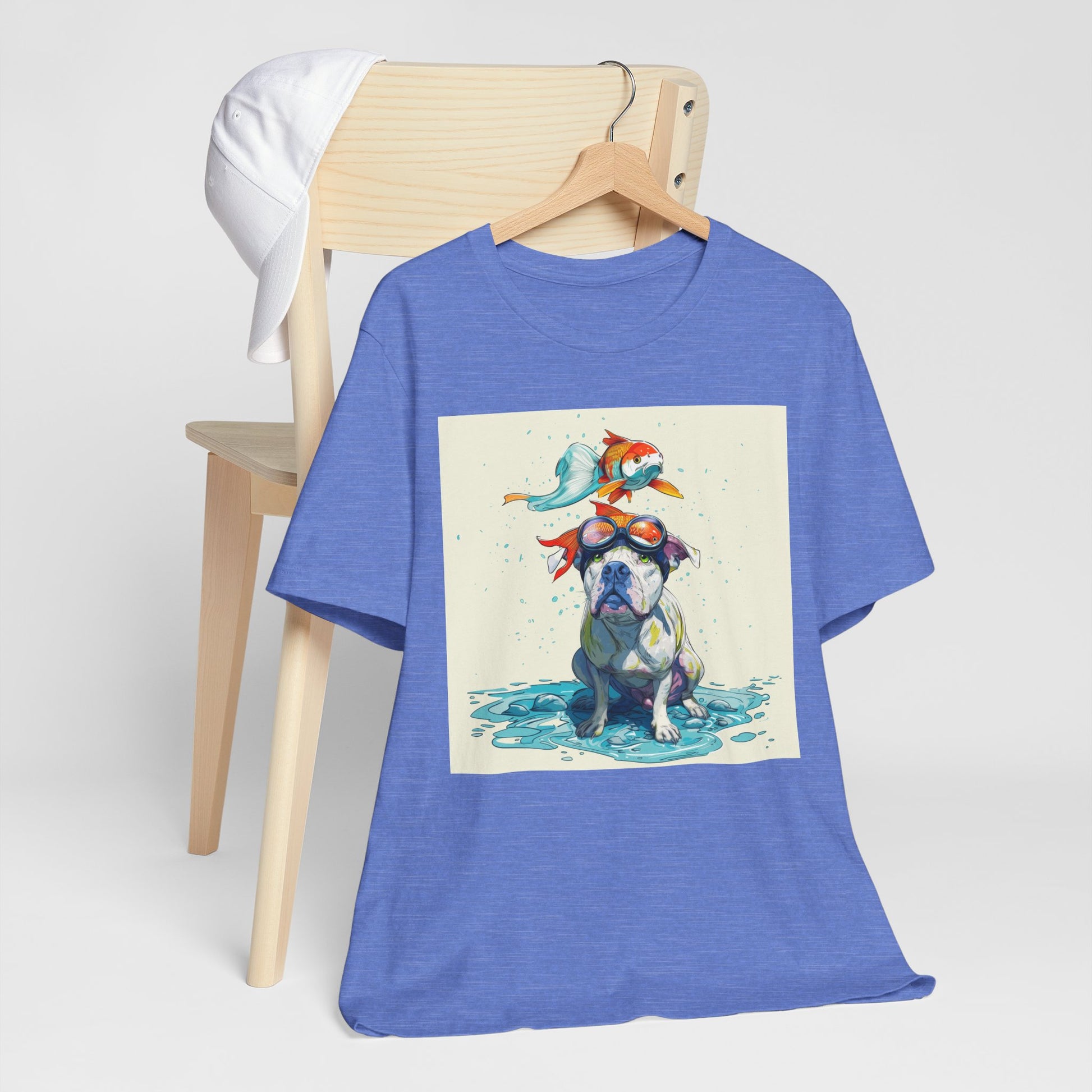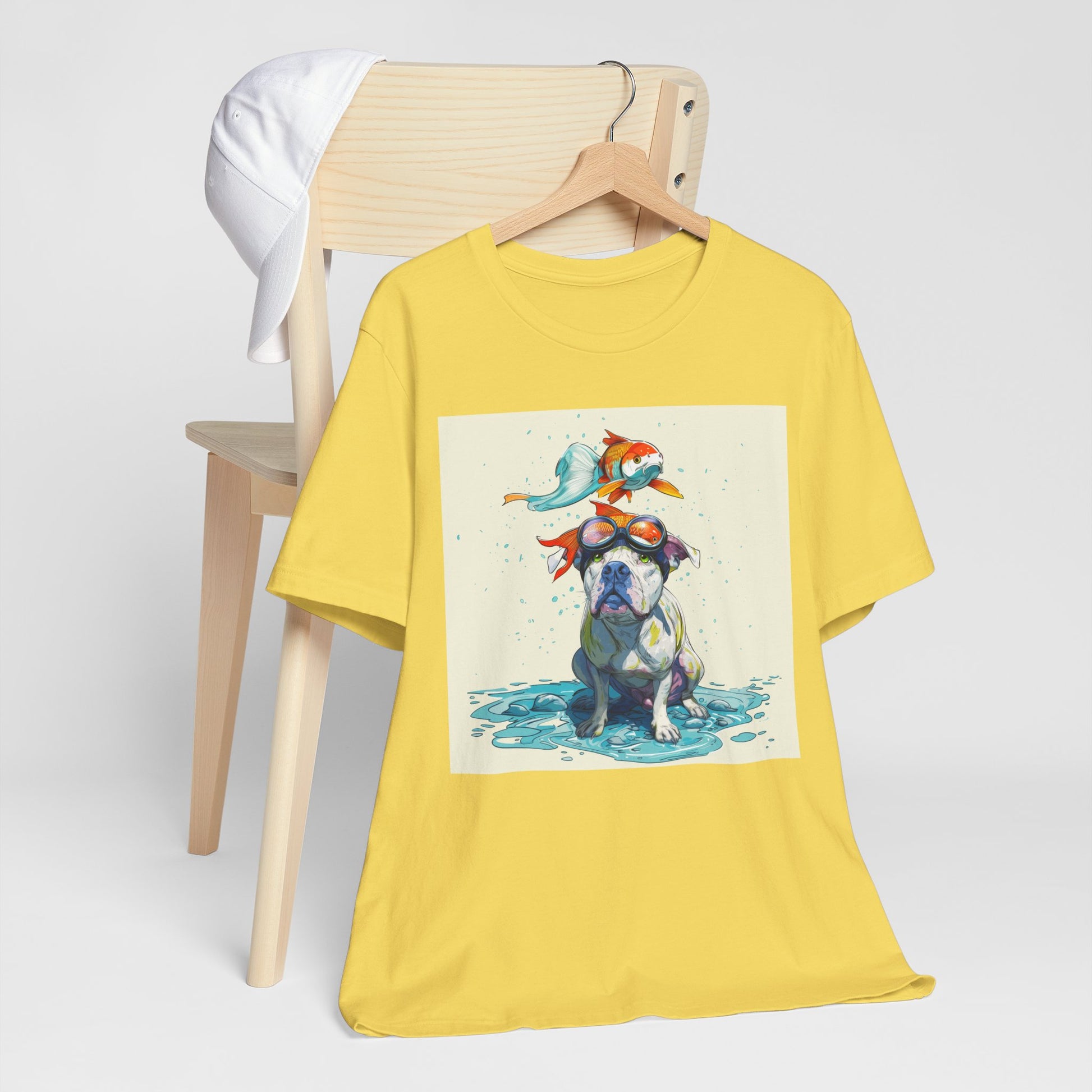 Meet the goofiest pup you’ll ever see! This playful design features a happy pitbull wearing goggles with a colorful koi fish balancing on his head—perfectly ridiculous and absolutely adorable. Full of vibrant colors and silly charm, it’s a shirt that brings smiles wherever it goes.