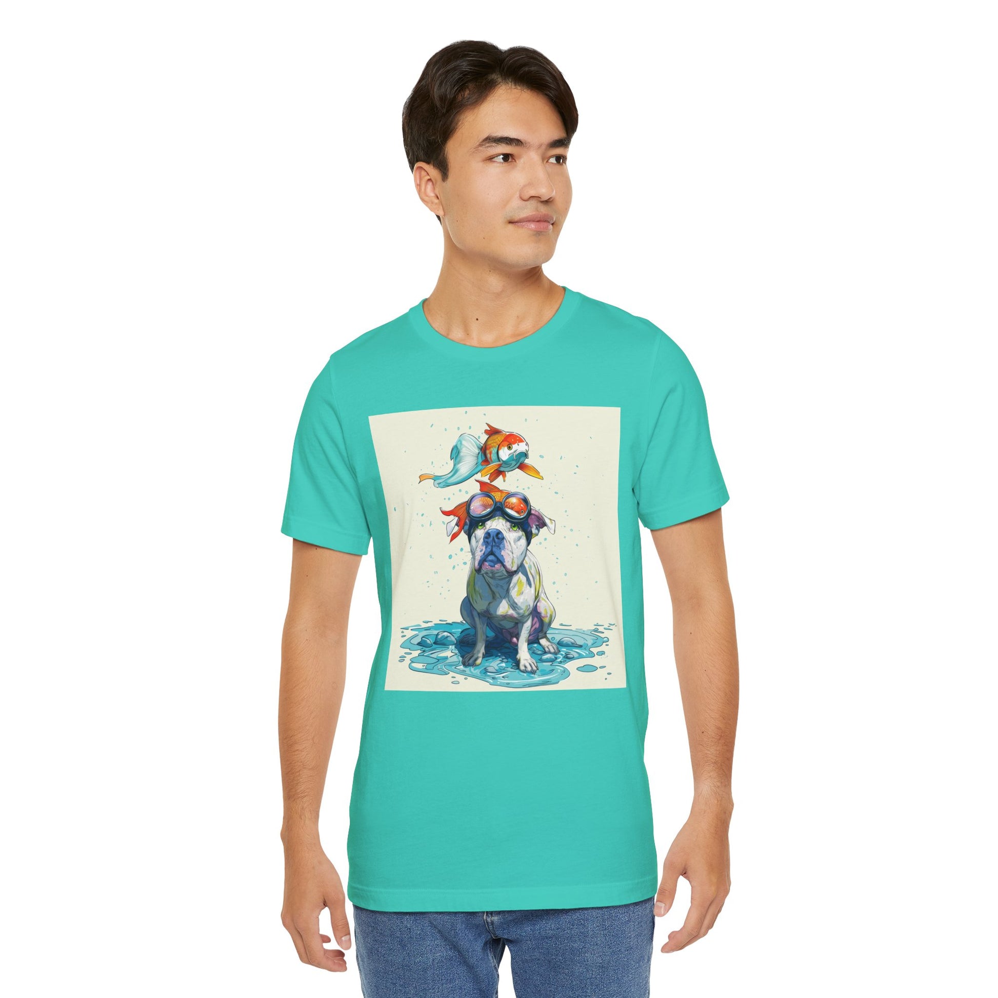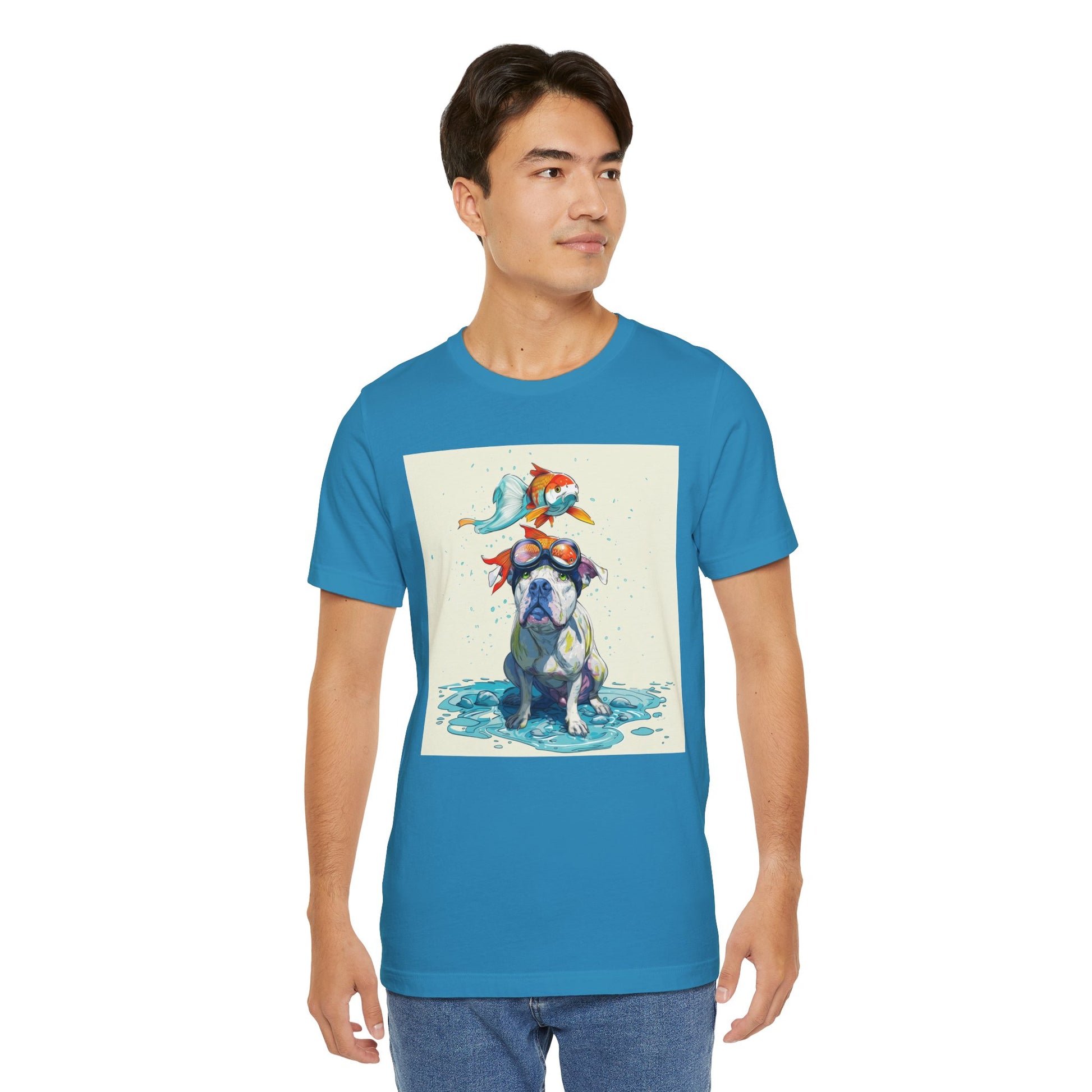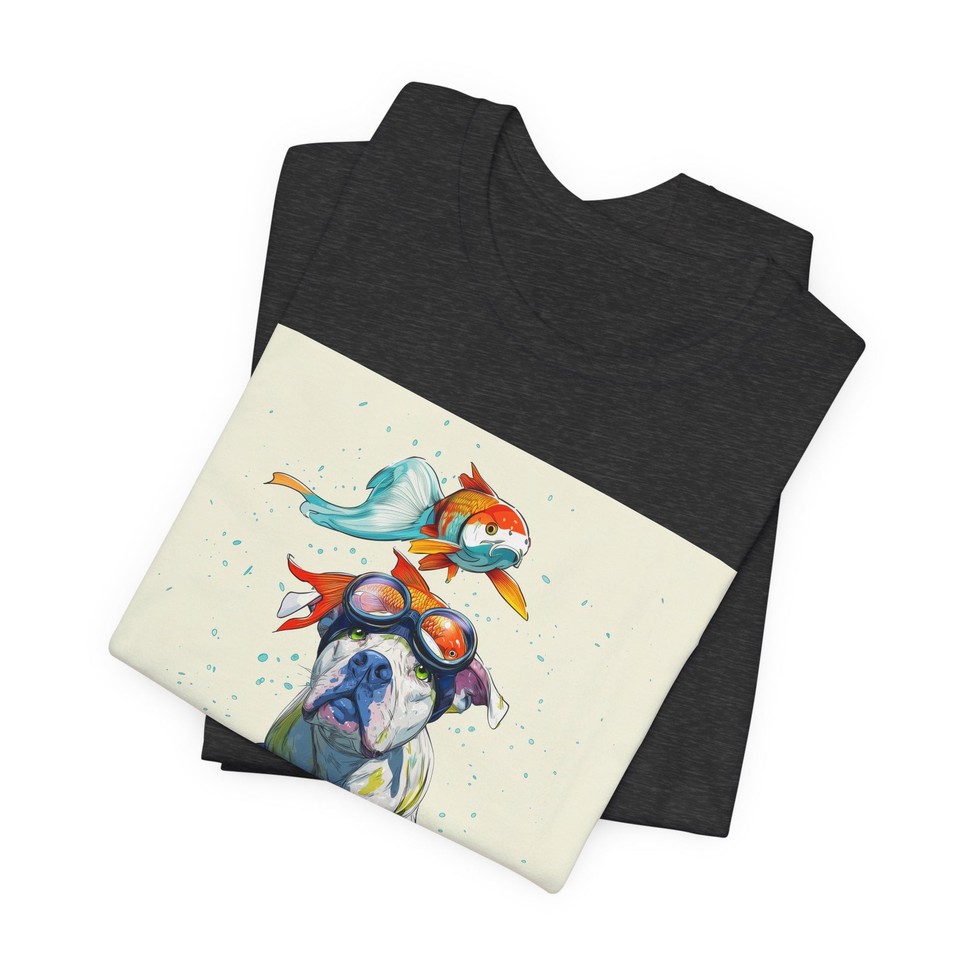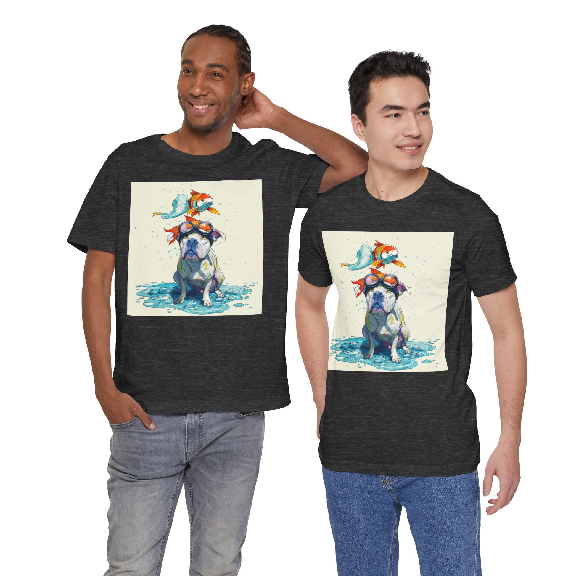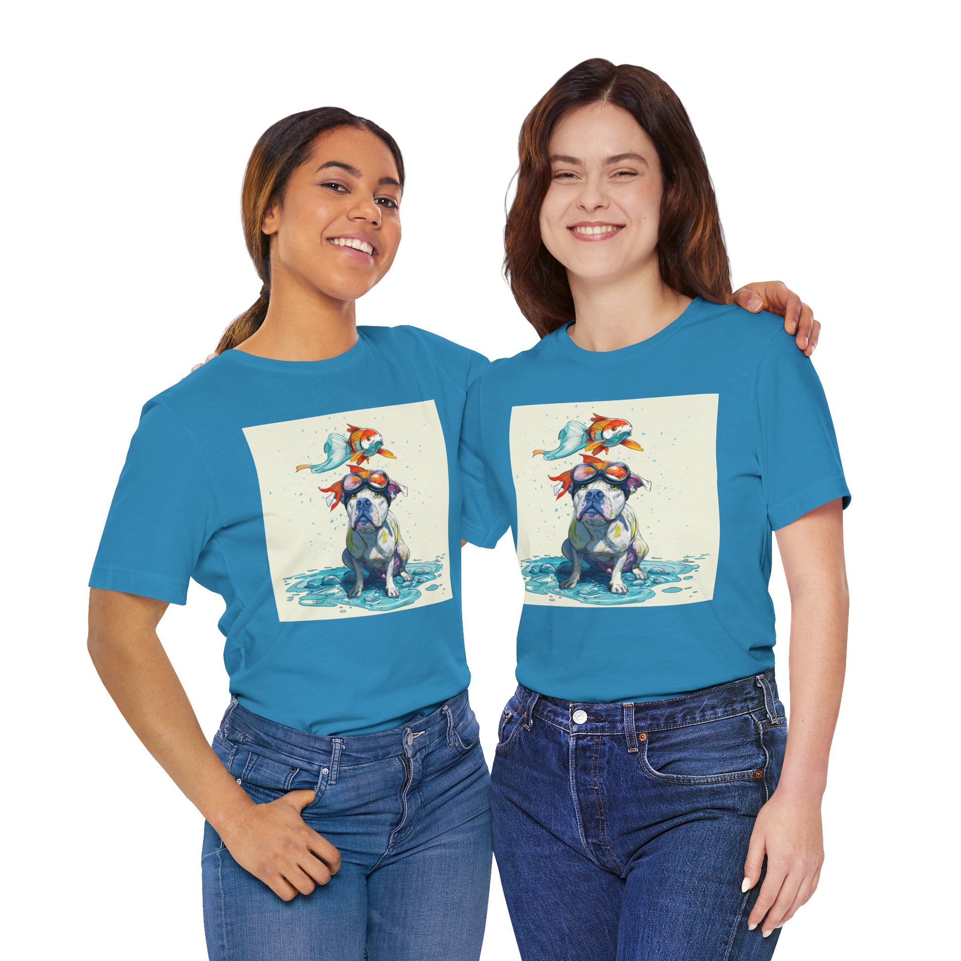 Meet the goofiest pup you’ll ever see! This playful design features a happy pitbull wearing goggles with a colorful koi fish balancing on his head—perfectly ridiculous and absolutely adorable. Full of vibrant colors and silly charm, it’s a shirt that brings smiles wherever it goes.