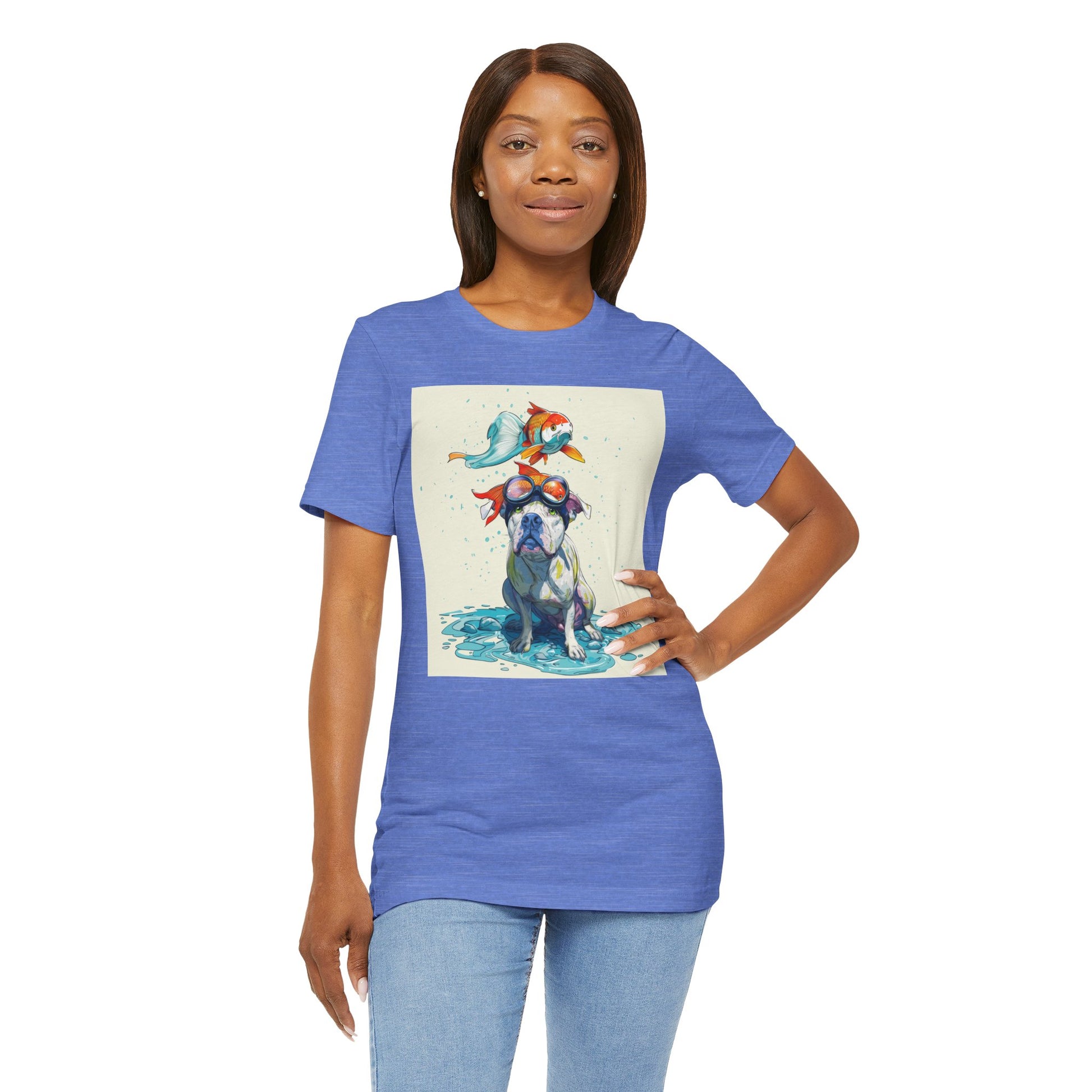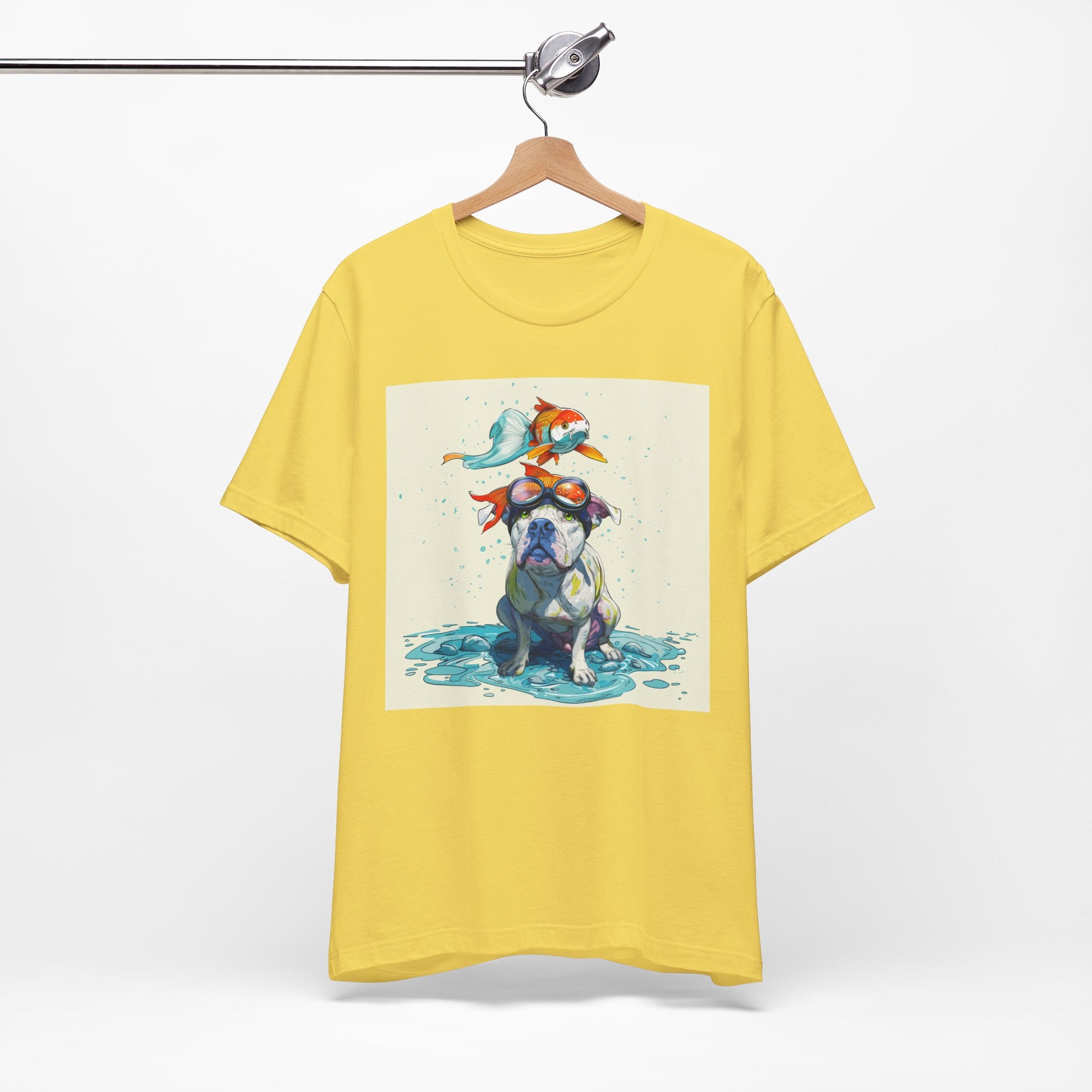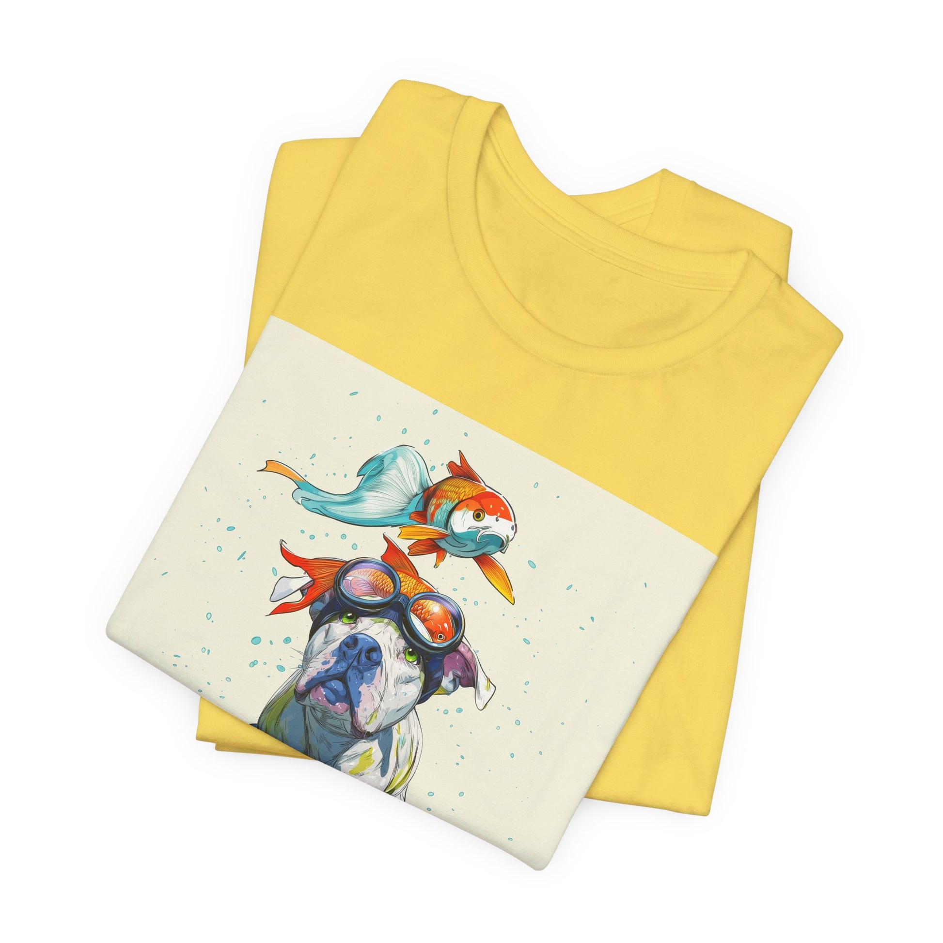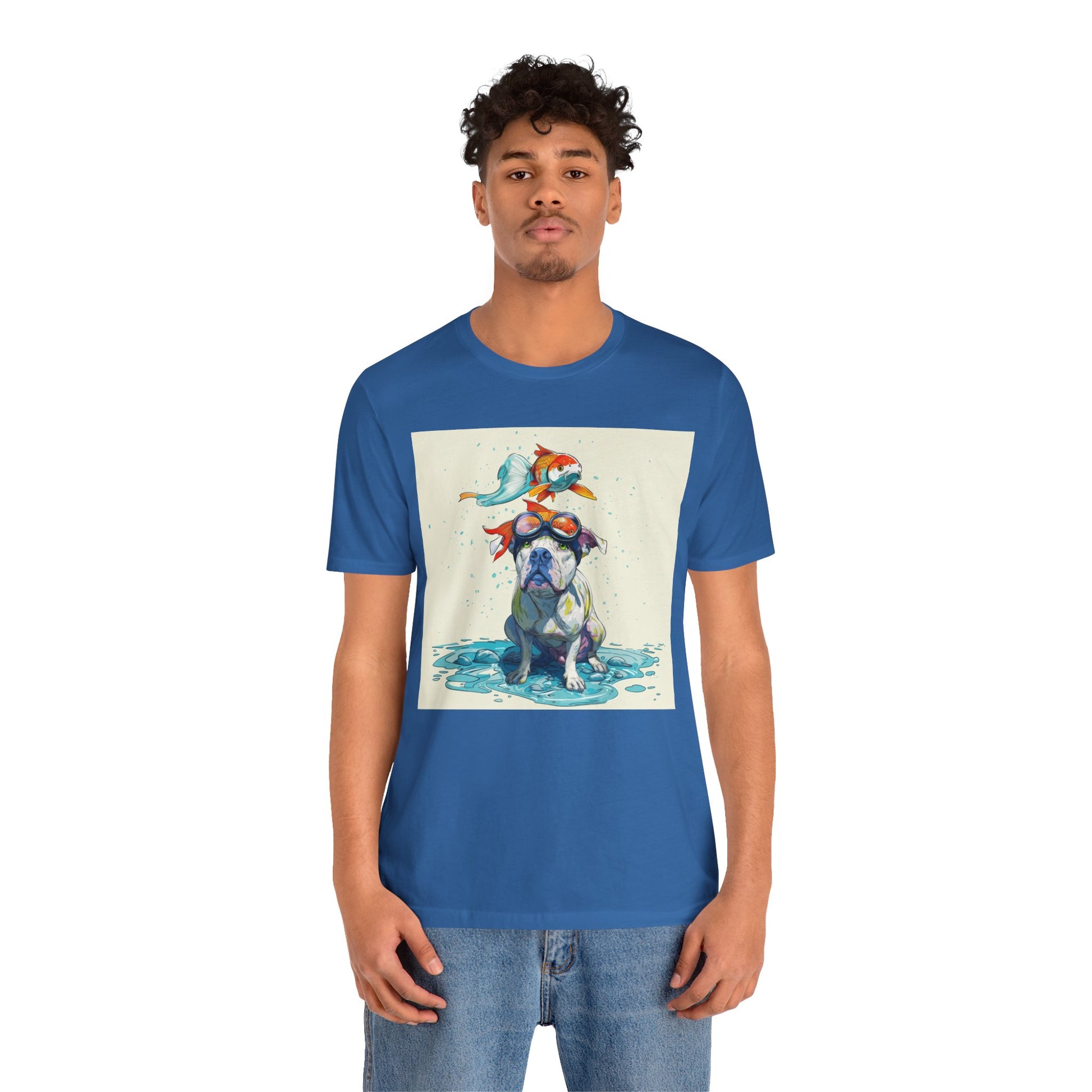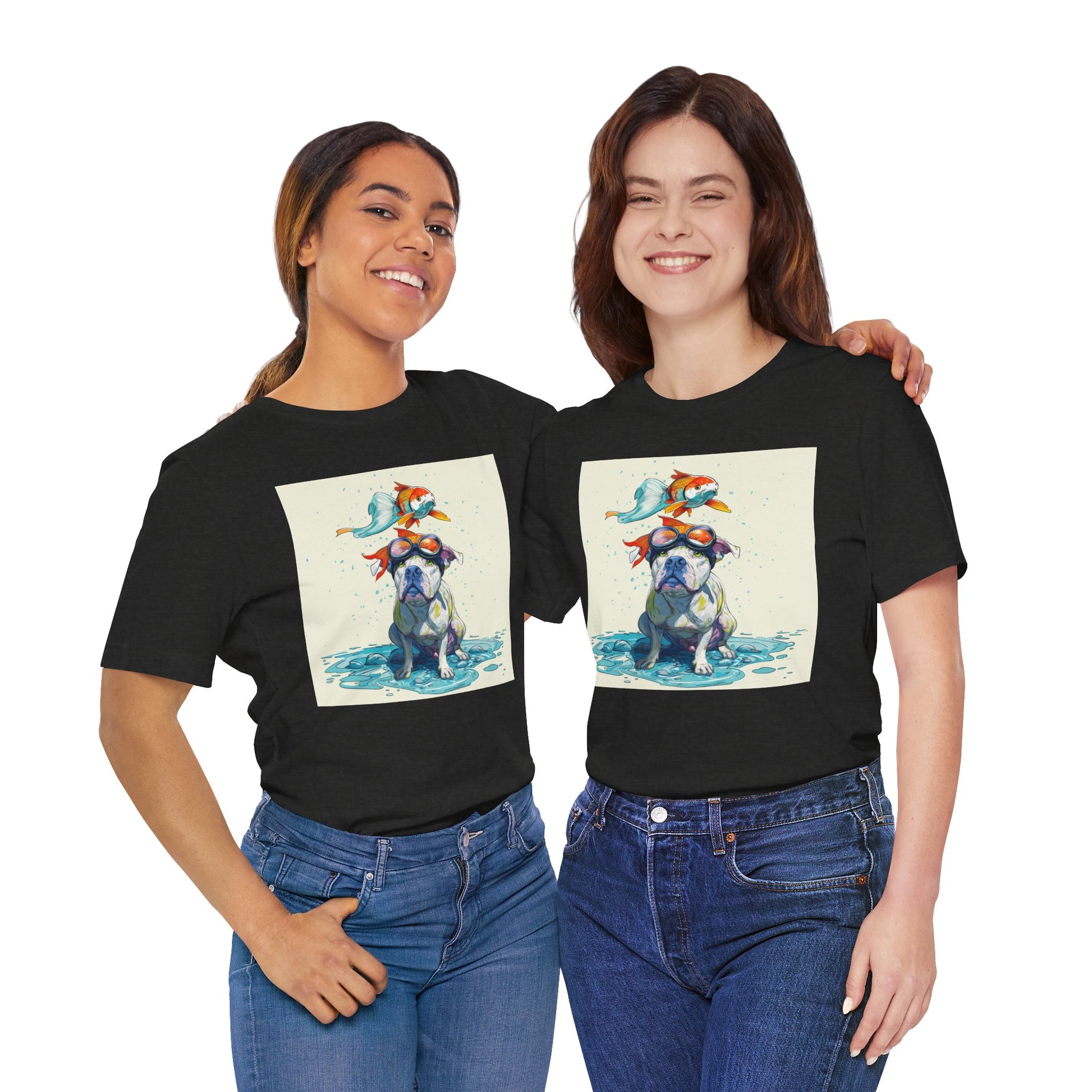 Meet the goofiest pup you’ll ever see! This playful design features a happy pitbull wearing goggles with a colorful koi fish balancing on his head—perfectly ridiculous and absolutely adorable. Full of vibrant colors and silly charm, it’s a shirt that brings smiles wherever it goes.