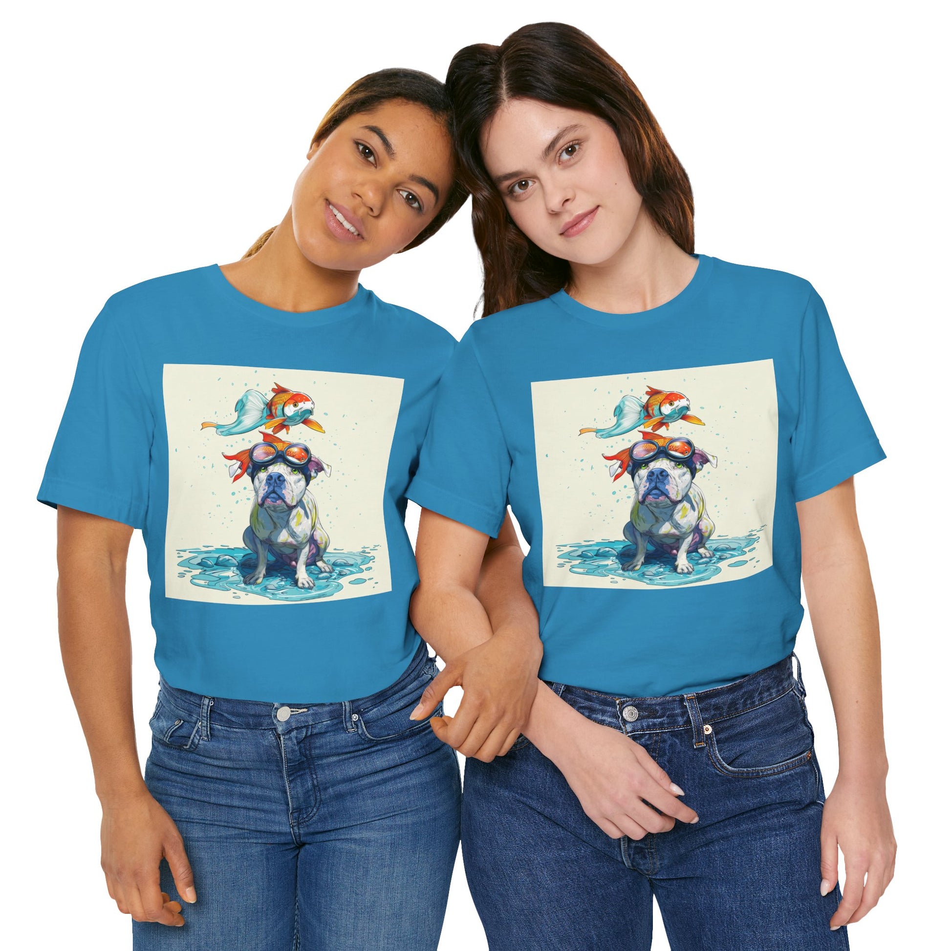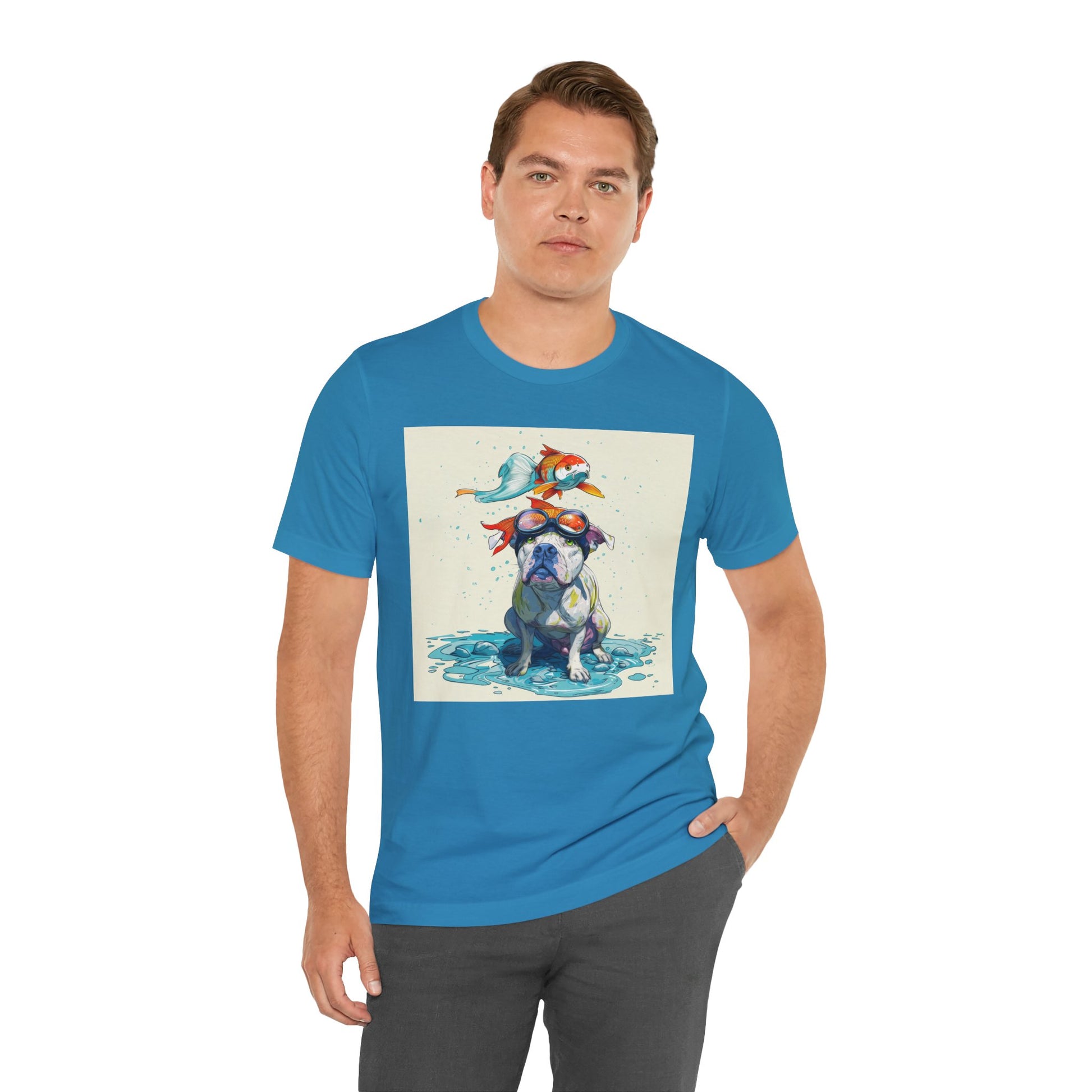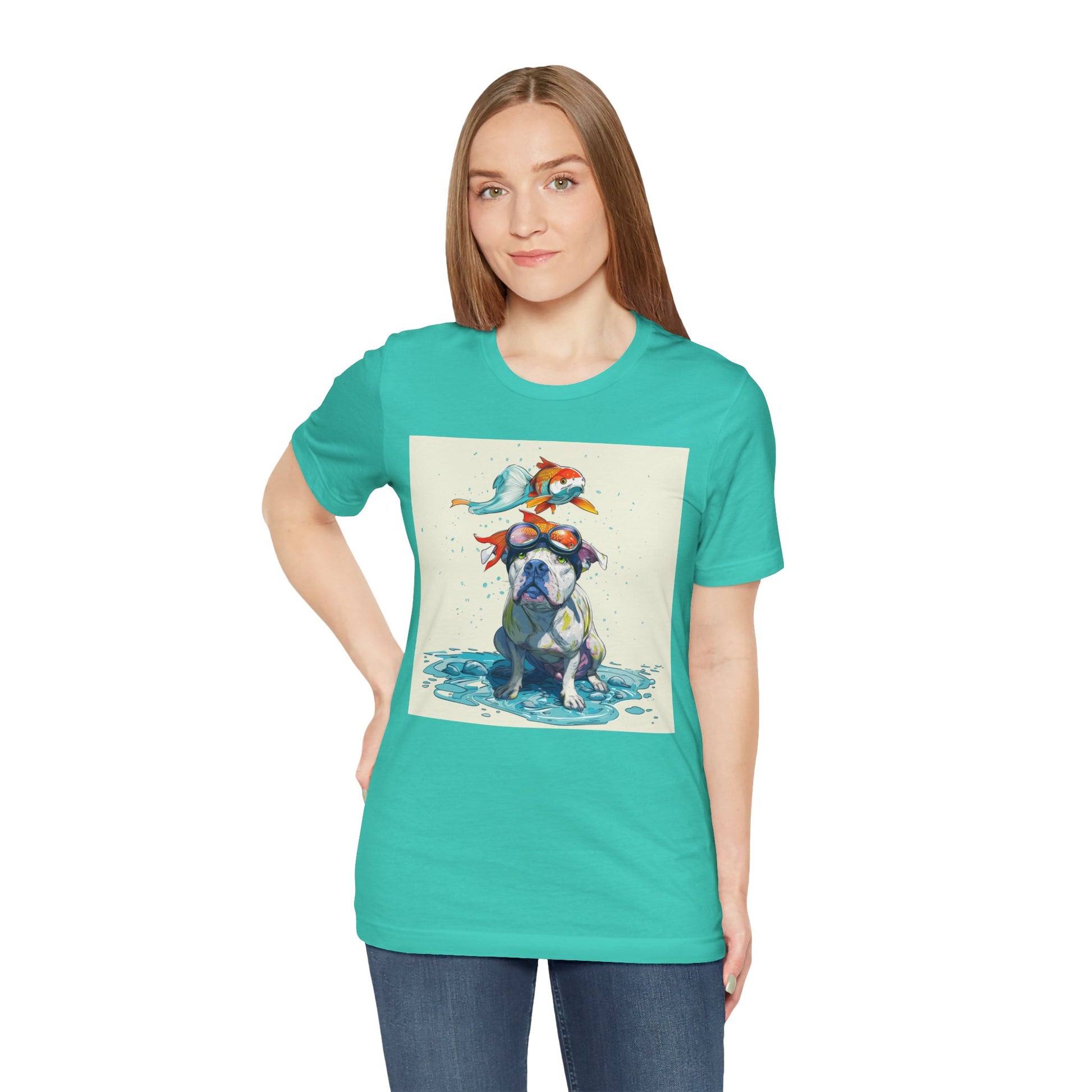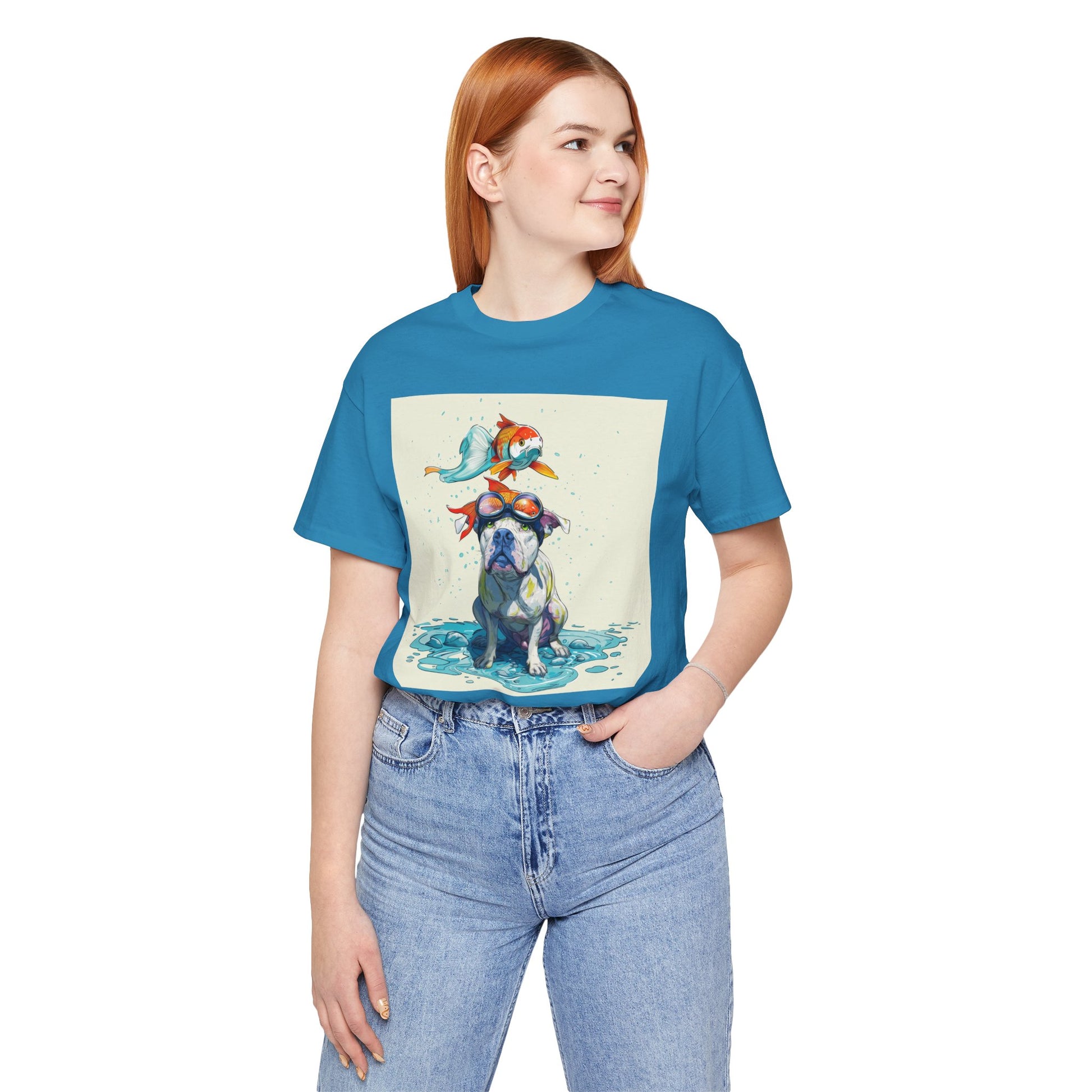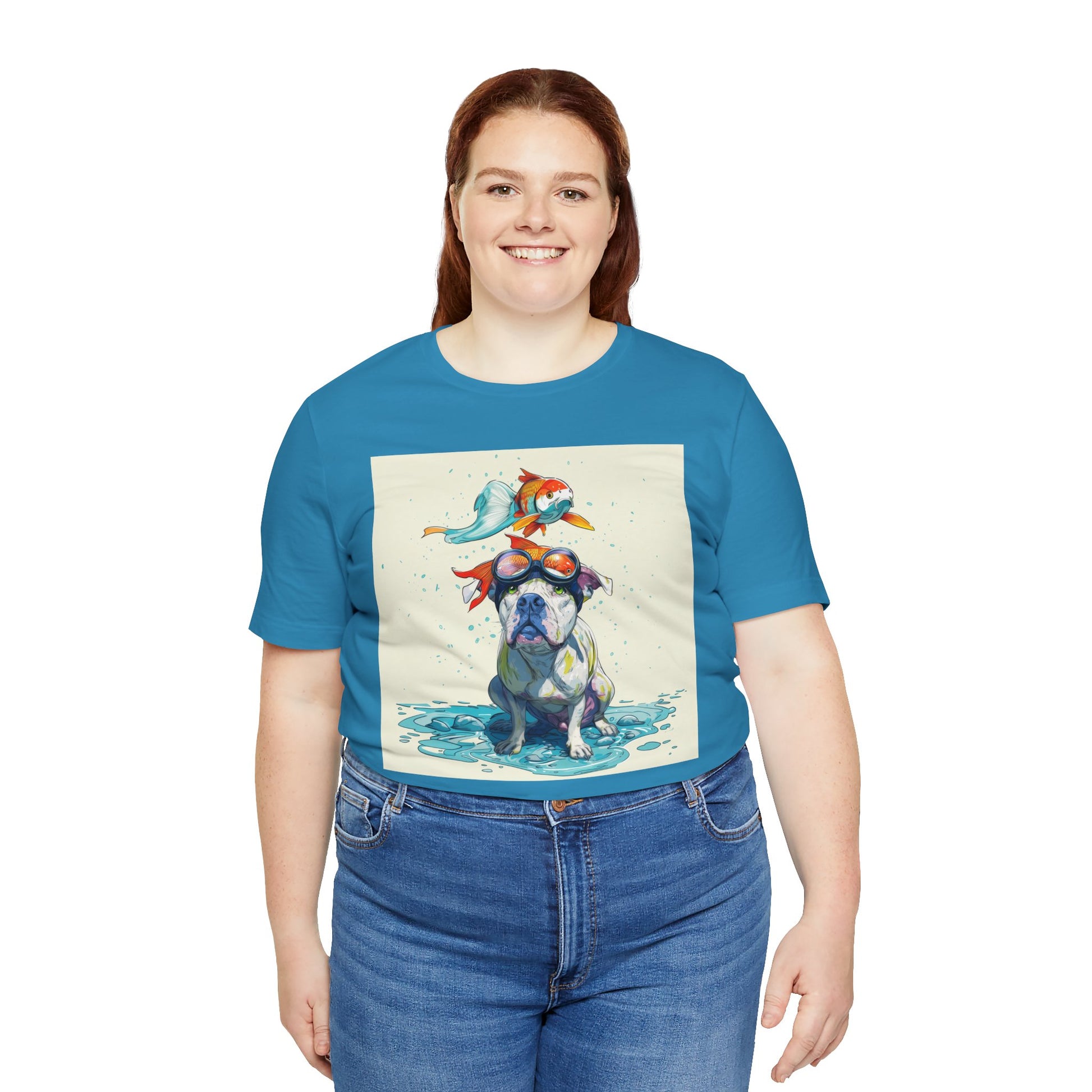 Meet the goofiest pup you’ll ever see! This playful design features a happy pitbull wearing goggles with a colorful koi fish balancing on his head—perfectly ridiculous and absolutely adorable. Full of vibrant colors and silly charm, it’s a shirt that brings smiles wherever it goes.
