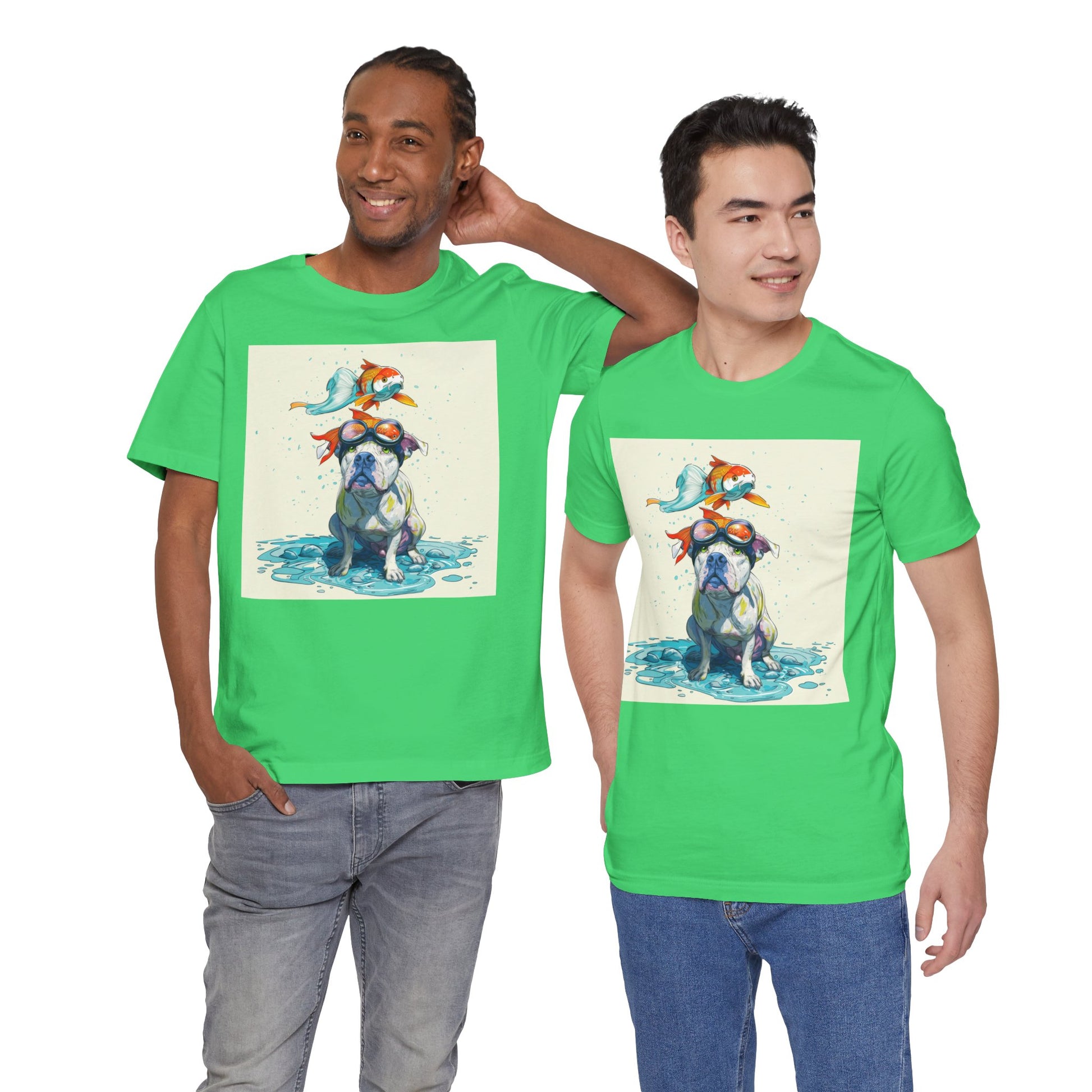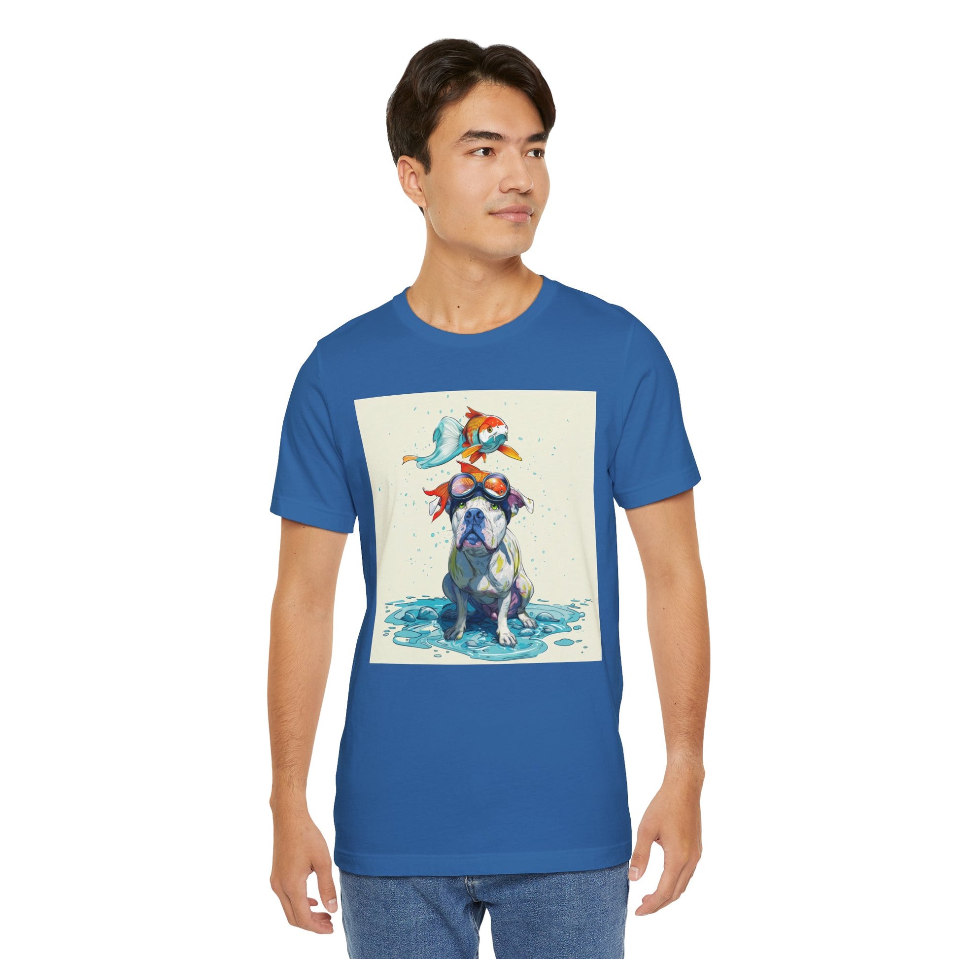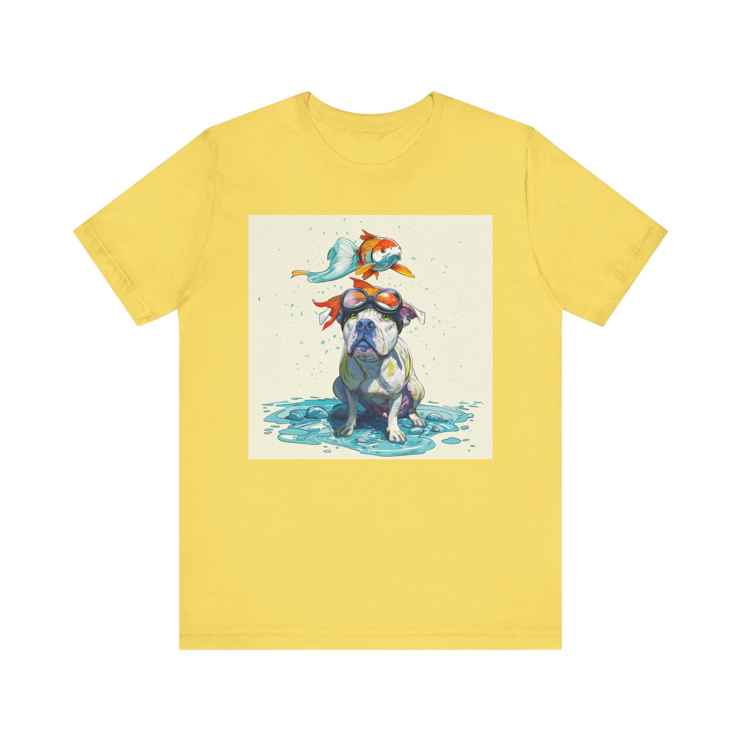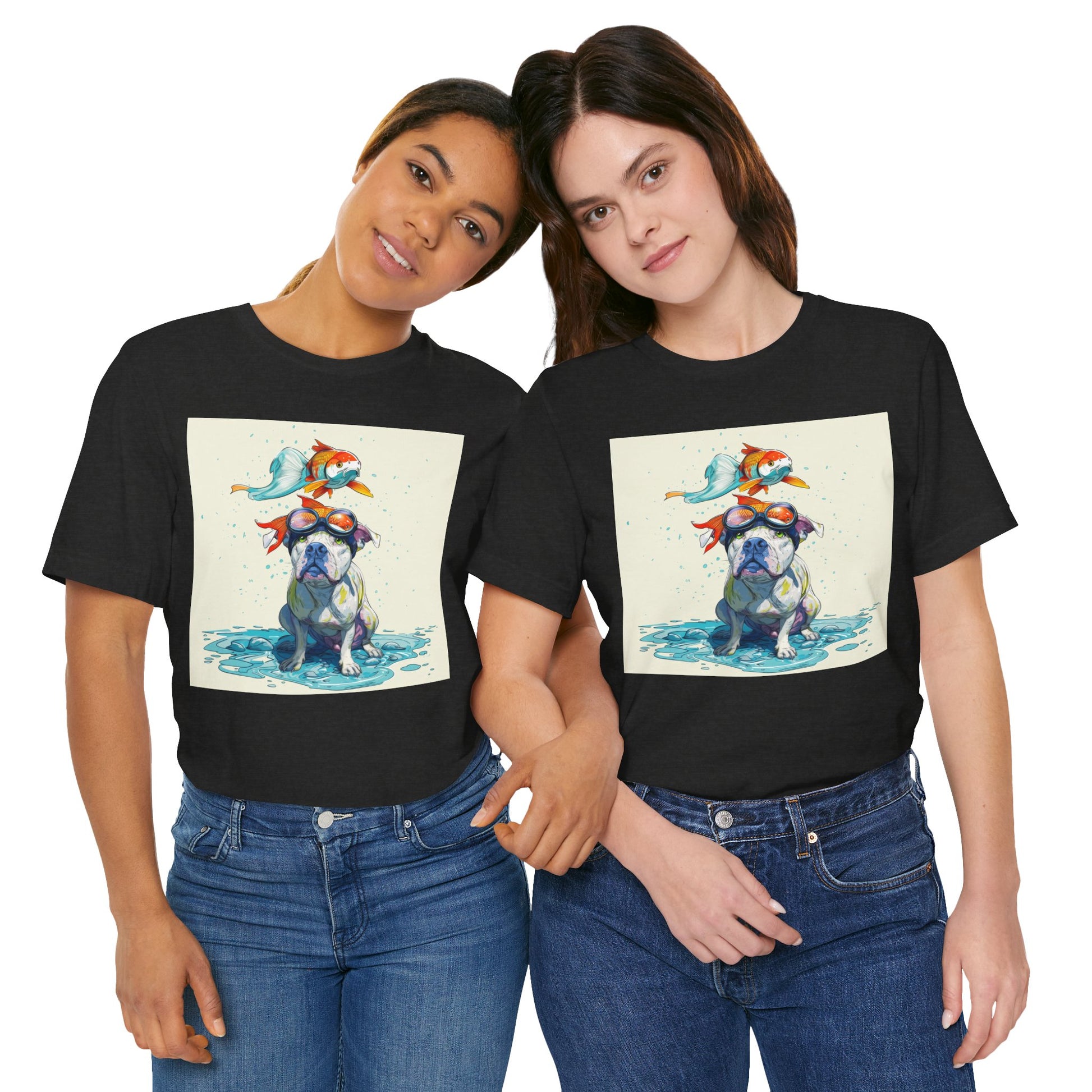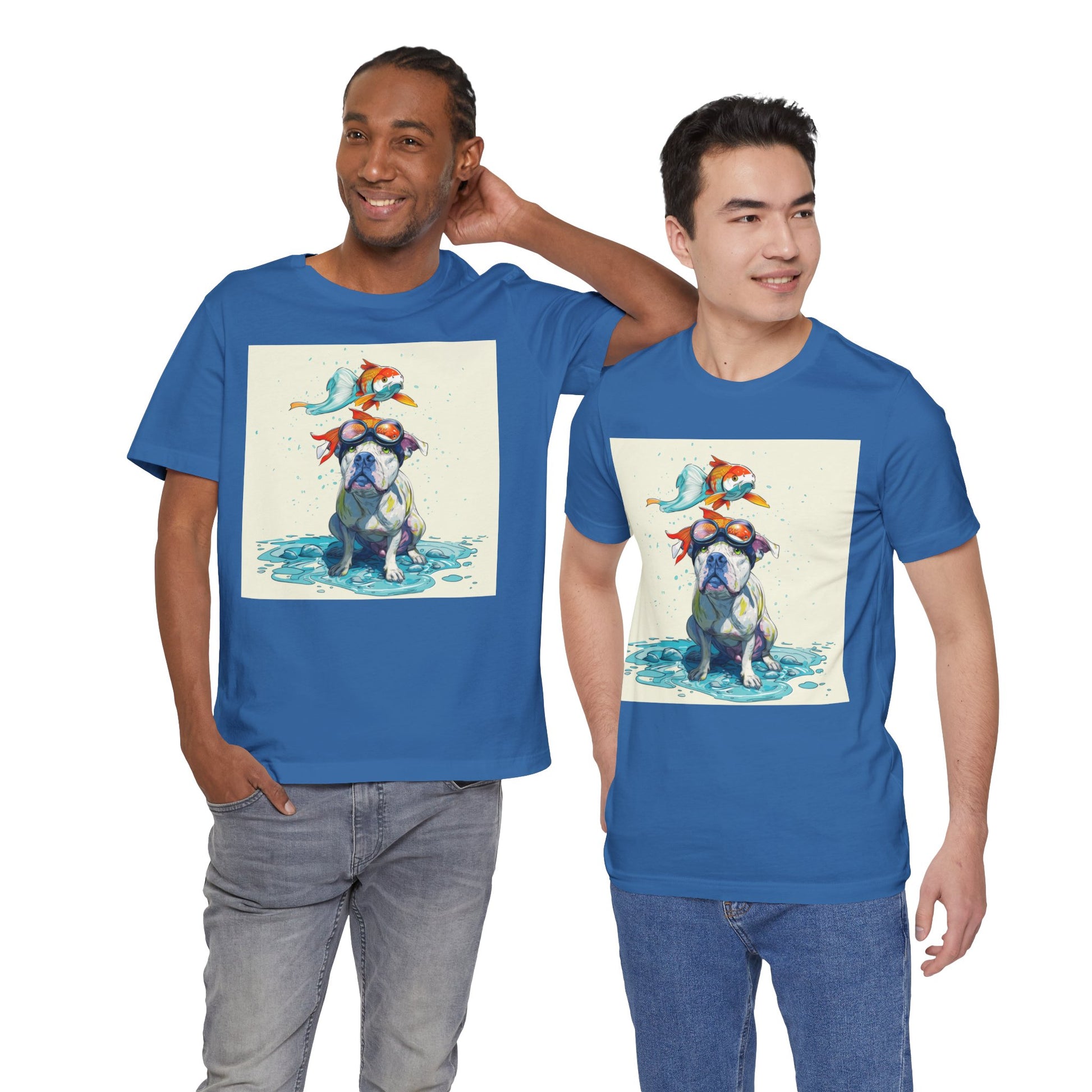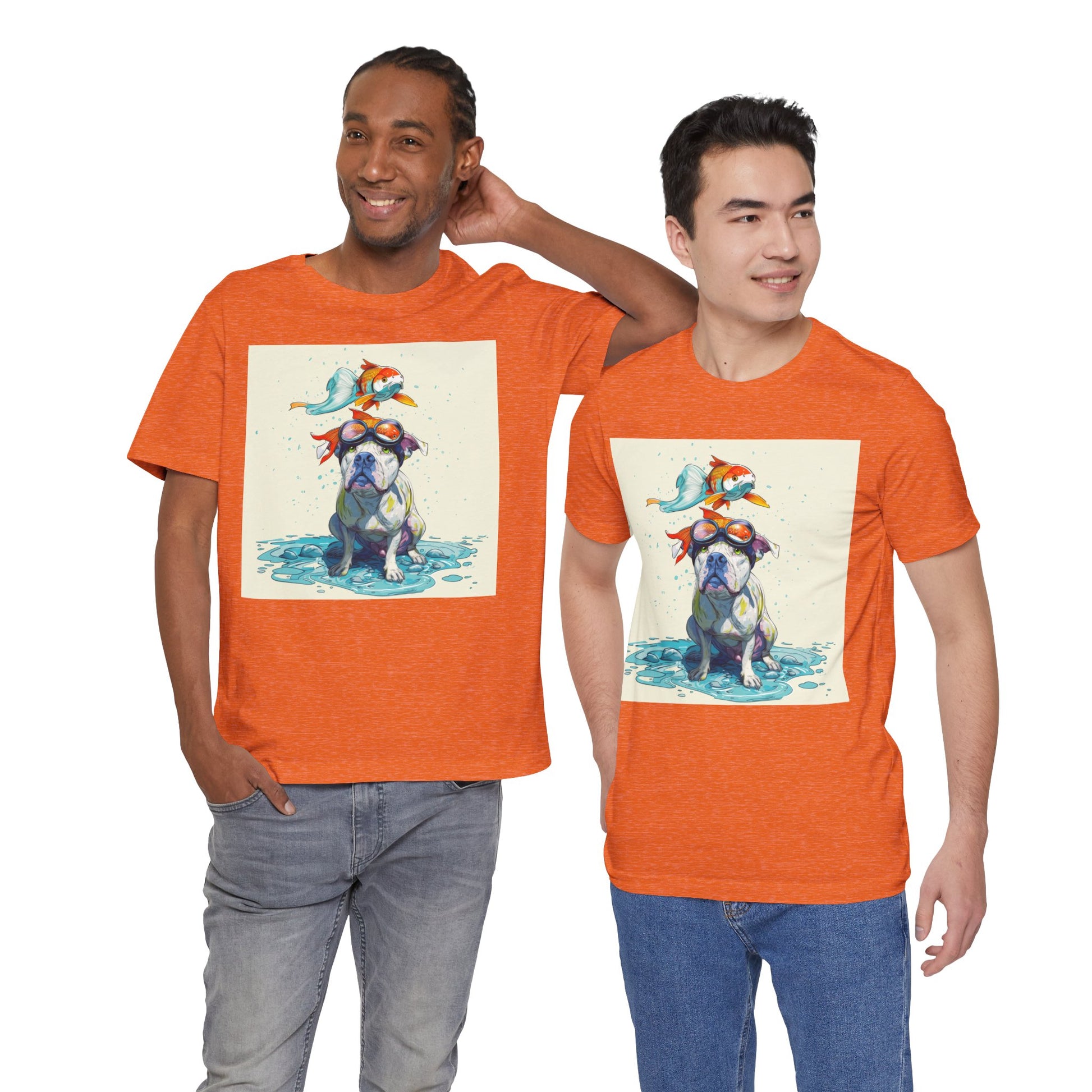 Meet the goofiest pup you’ll ever see! This playful design features a happy pitbull wearing goggles with a colorful koi fish balancing on his head—perfectly ridiculous and absolutely adorable. Full of vibrant colors and silly charm, it’s a shirt that brings smiles wherever it goes.
