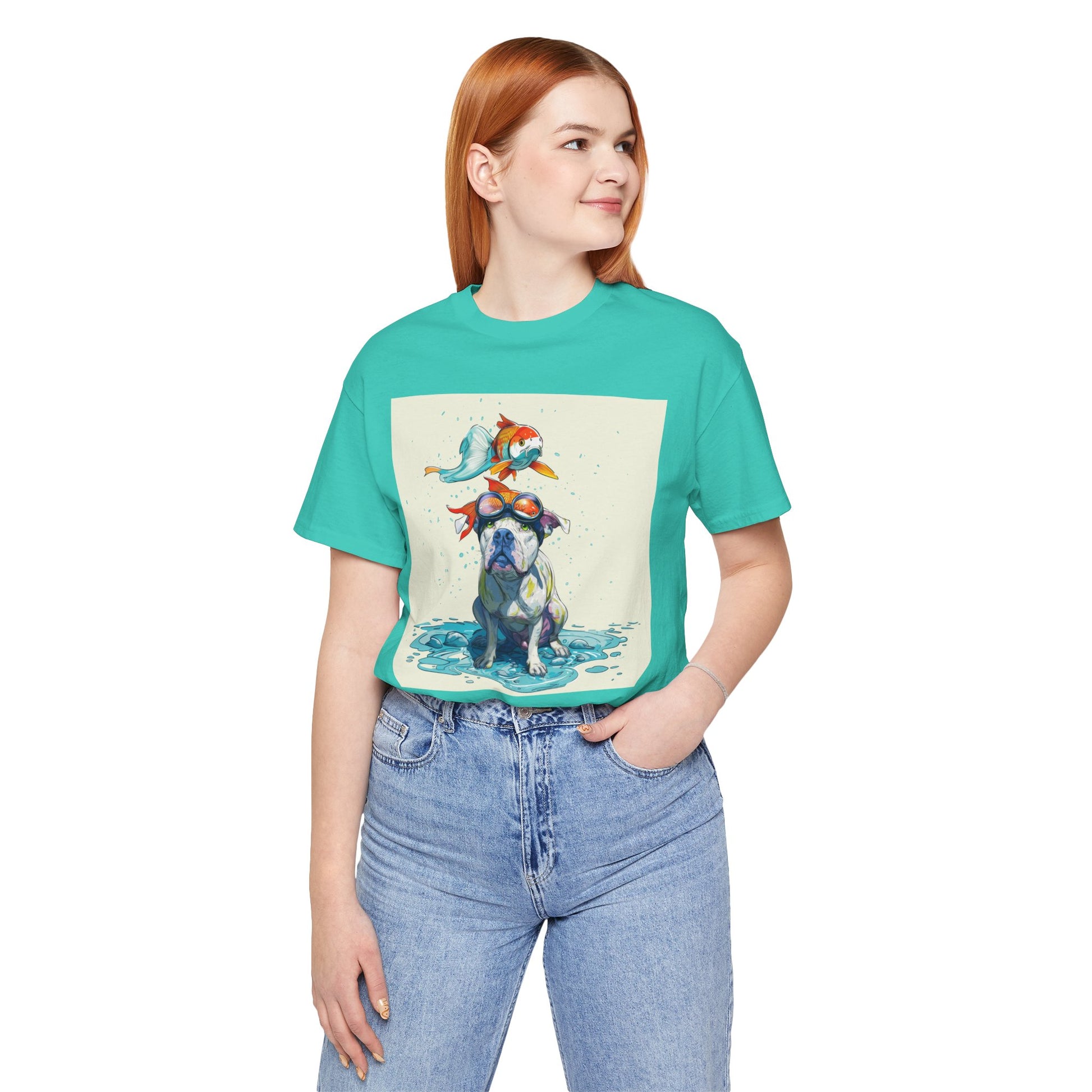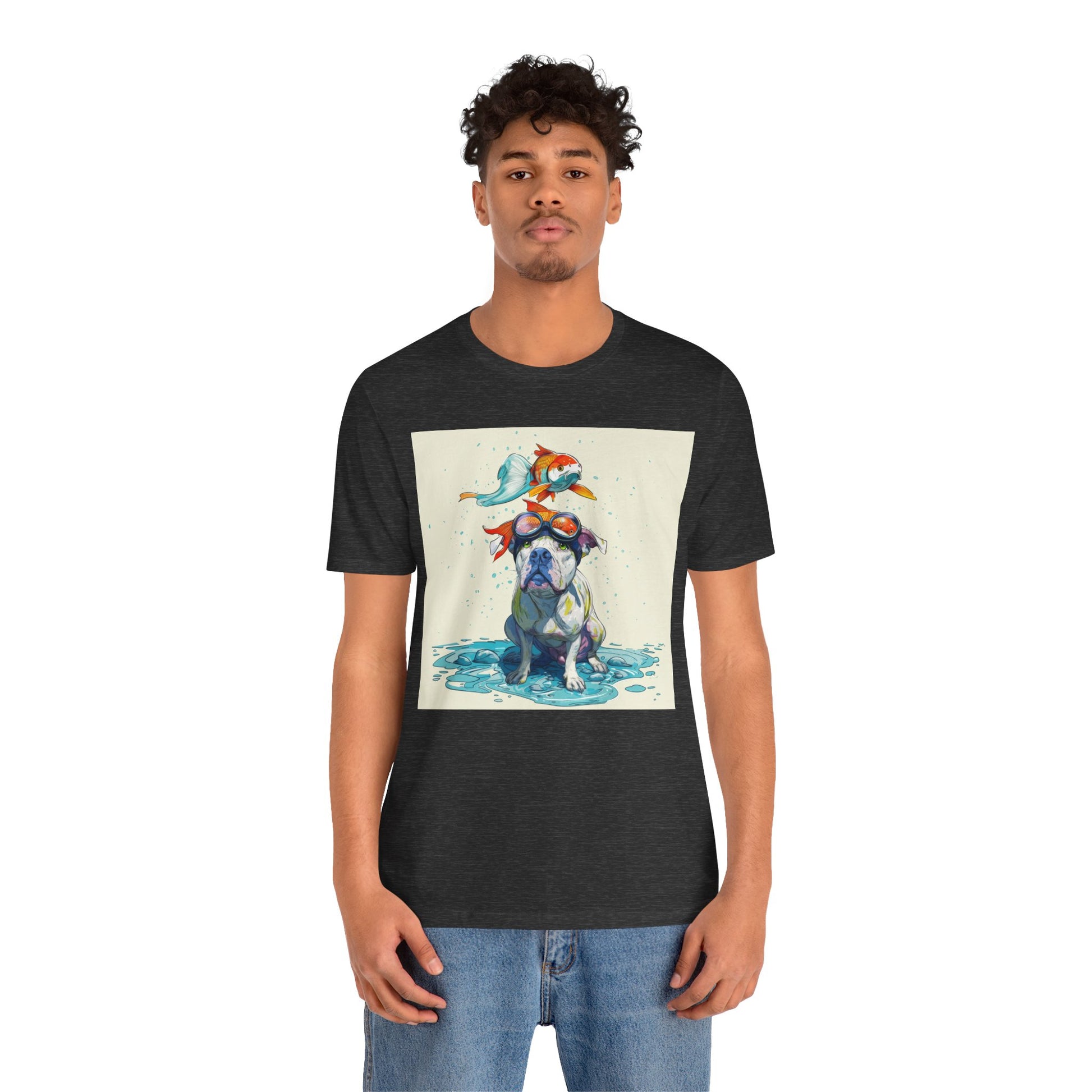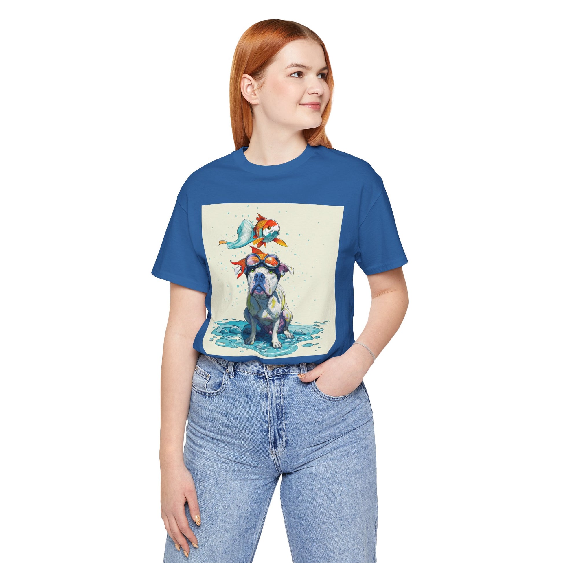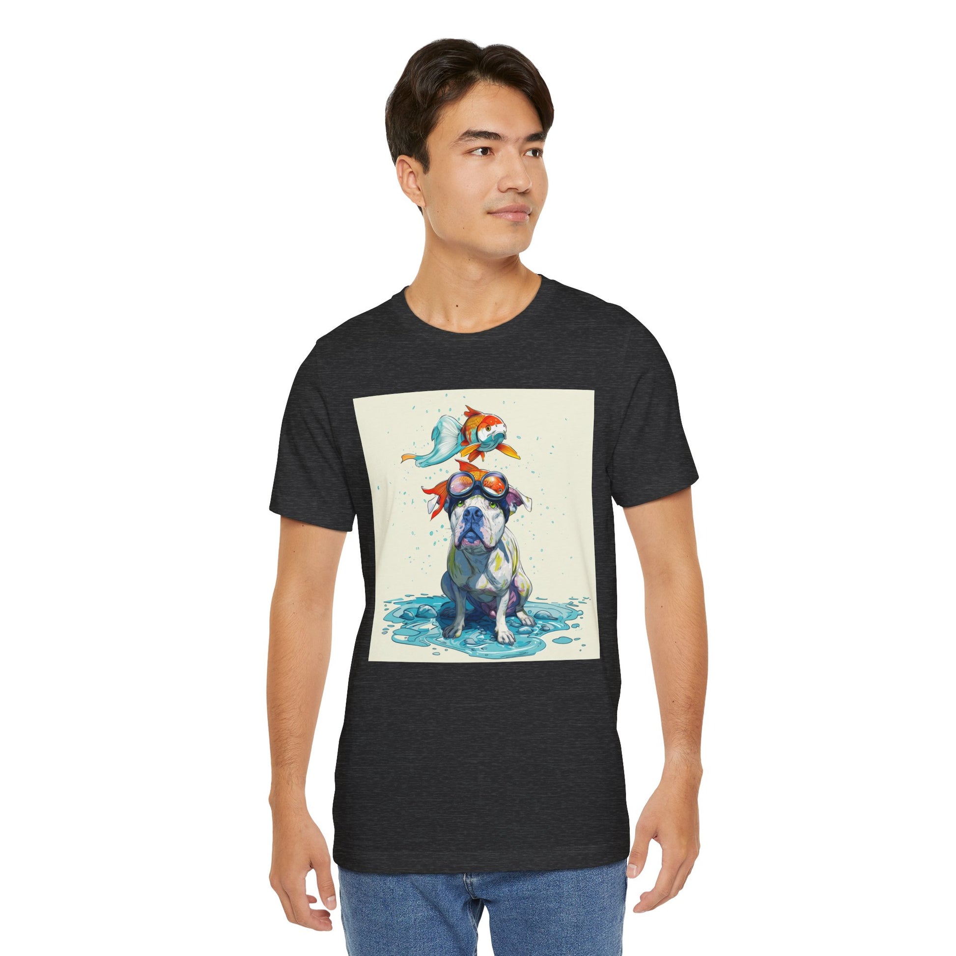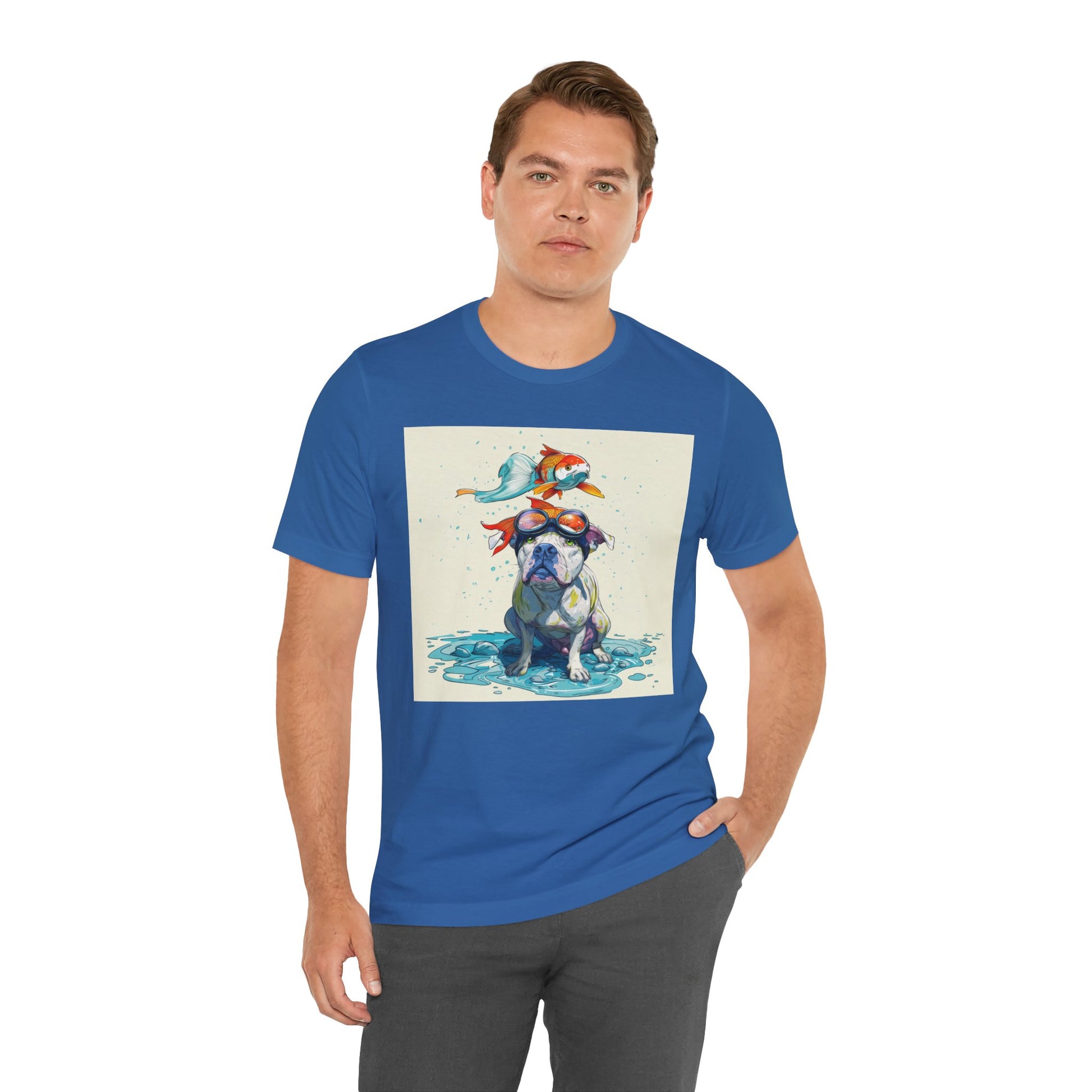 Meet the goofiest pup you’ll ever see! This playful design features a happy pitbull wearing goggles with a colorful koi fish balancing on his head—perfectly ridiculous and absolutely adorable. Full of vibrant colors and silly charm, it’s a shirt that brings smiles wherever it goes.