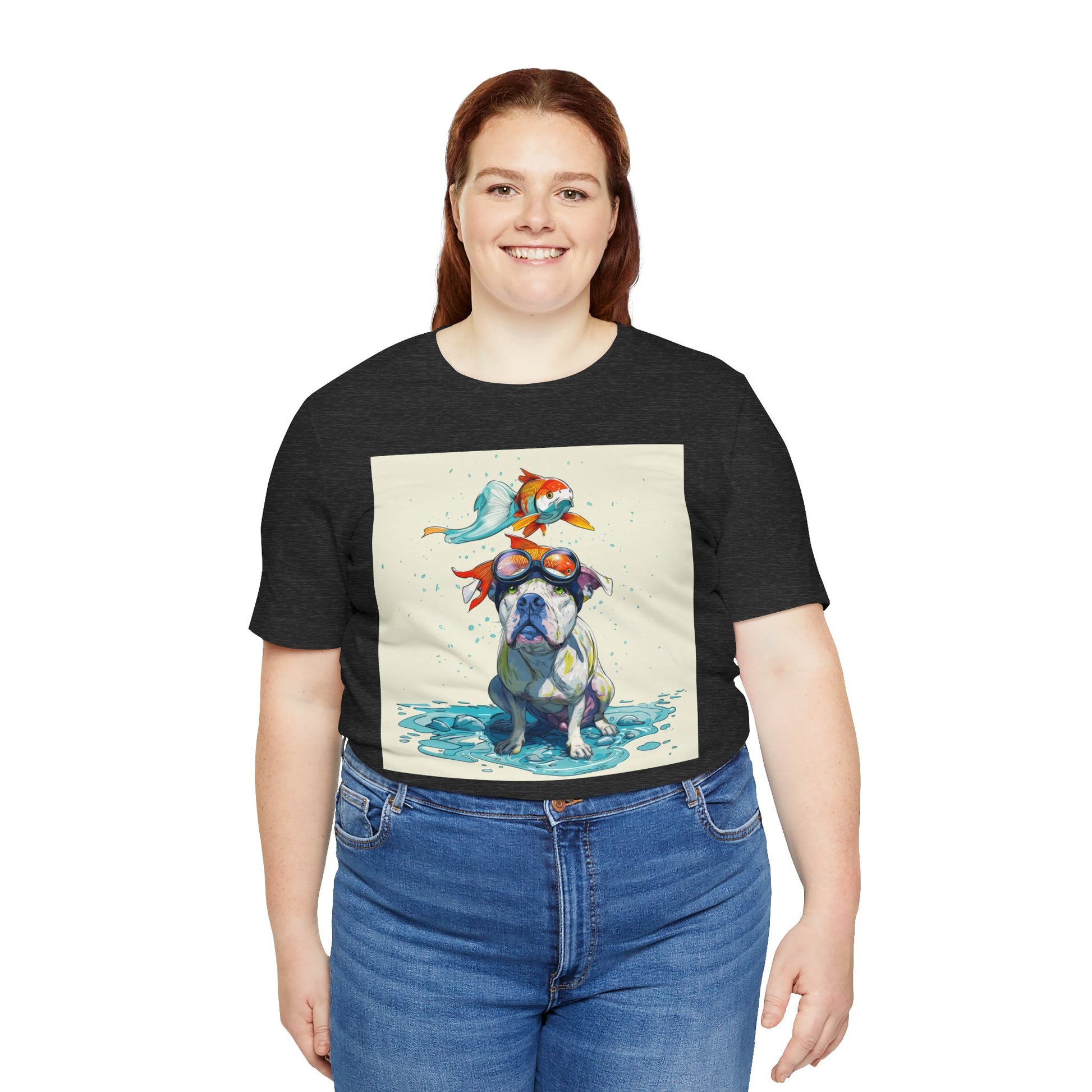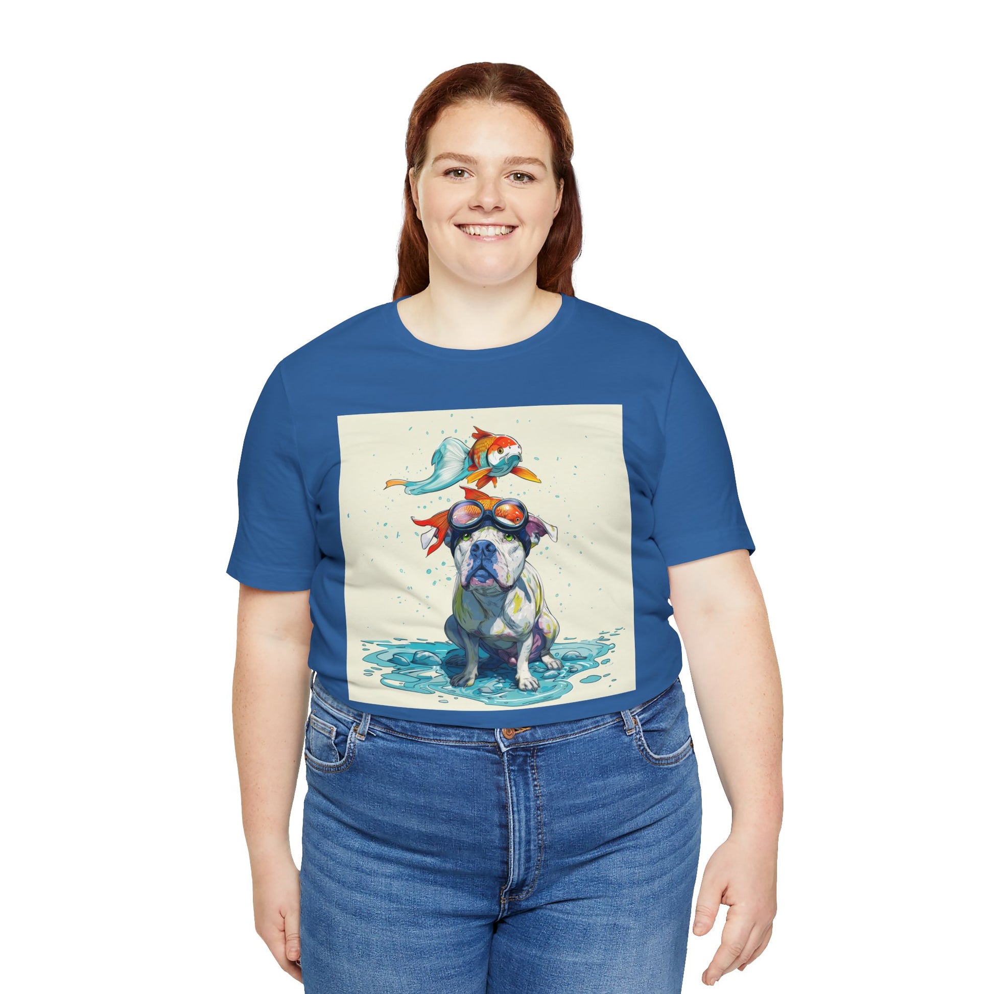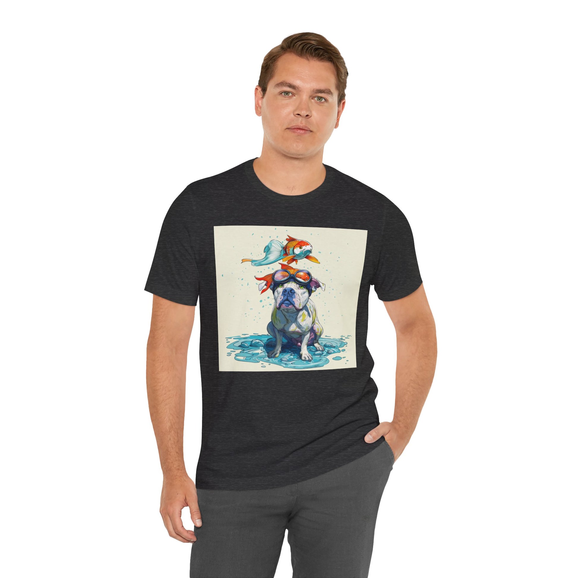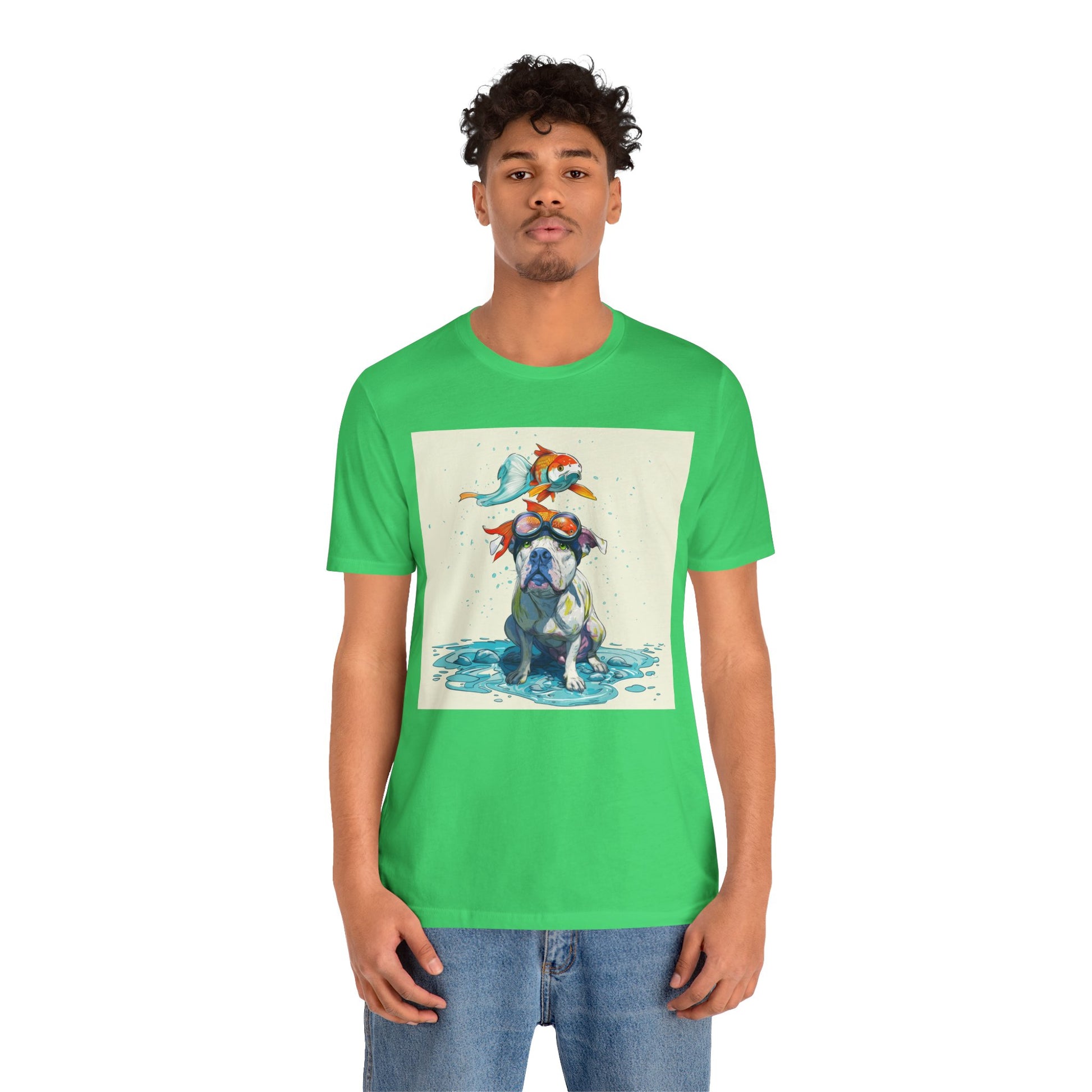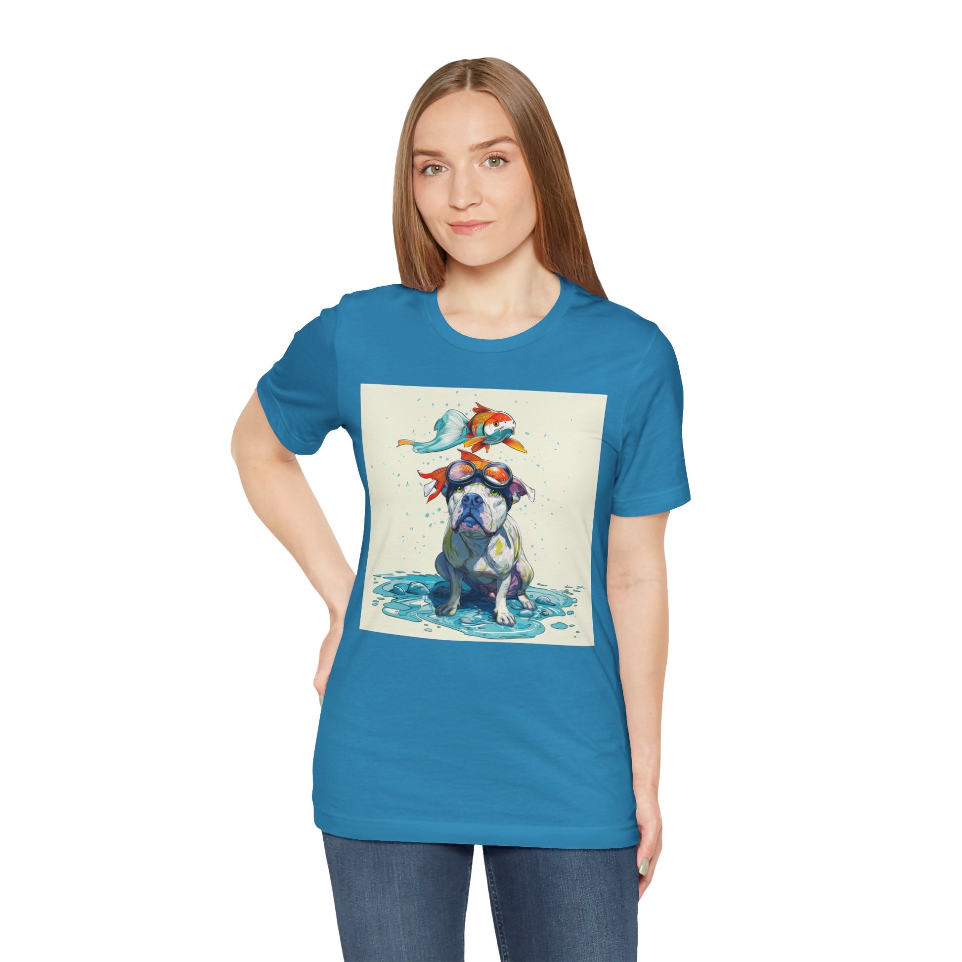 Meet the goofiest pup you’ll ever see! This playful design features a happy pitbull wearing goggles with a colorful koi fish balancing on his head—perfectly ridiculous and absolutely adorable. Full of vibrant colors and silly charm, it’s a shirt that brings smiles wherever it goes.