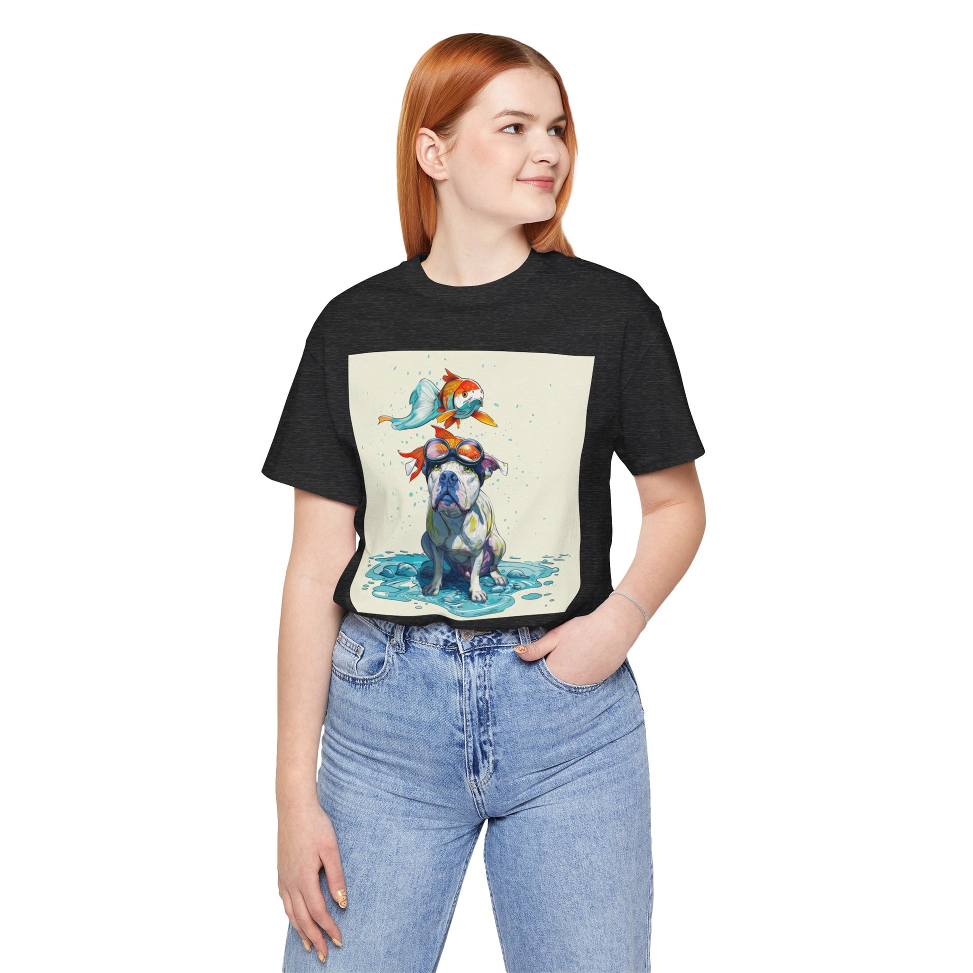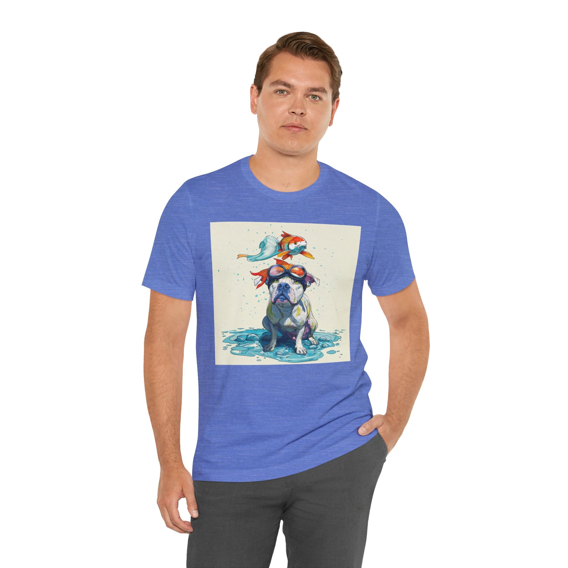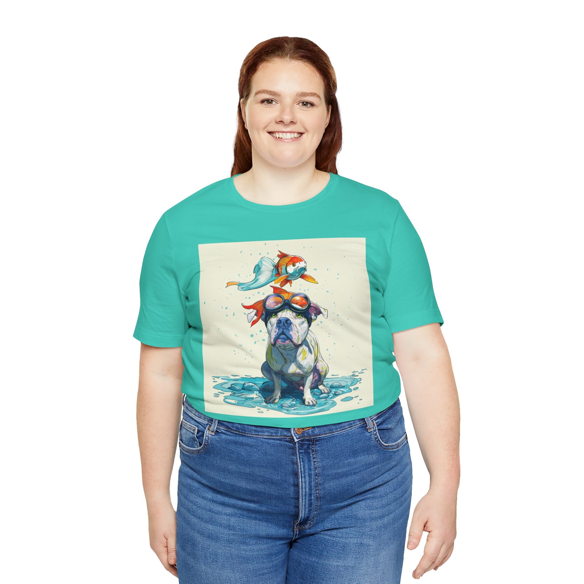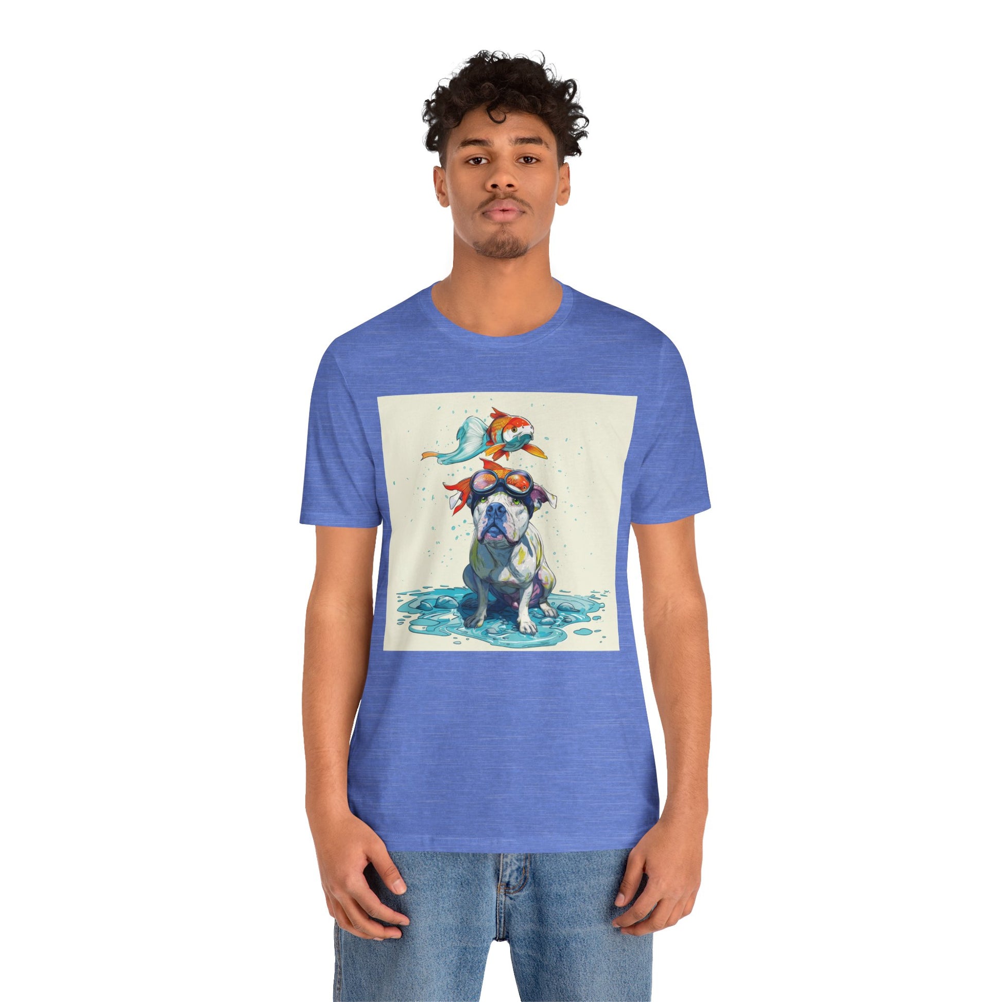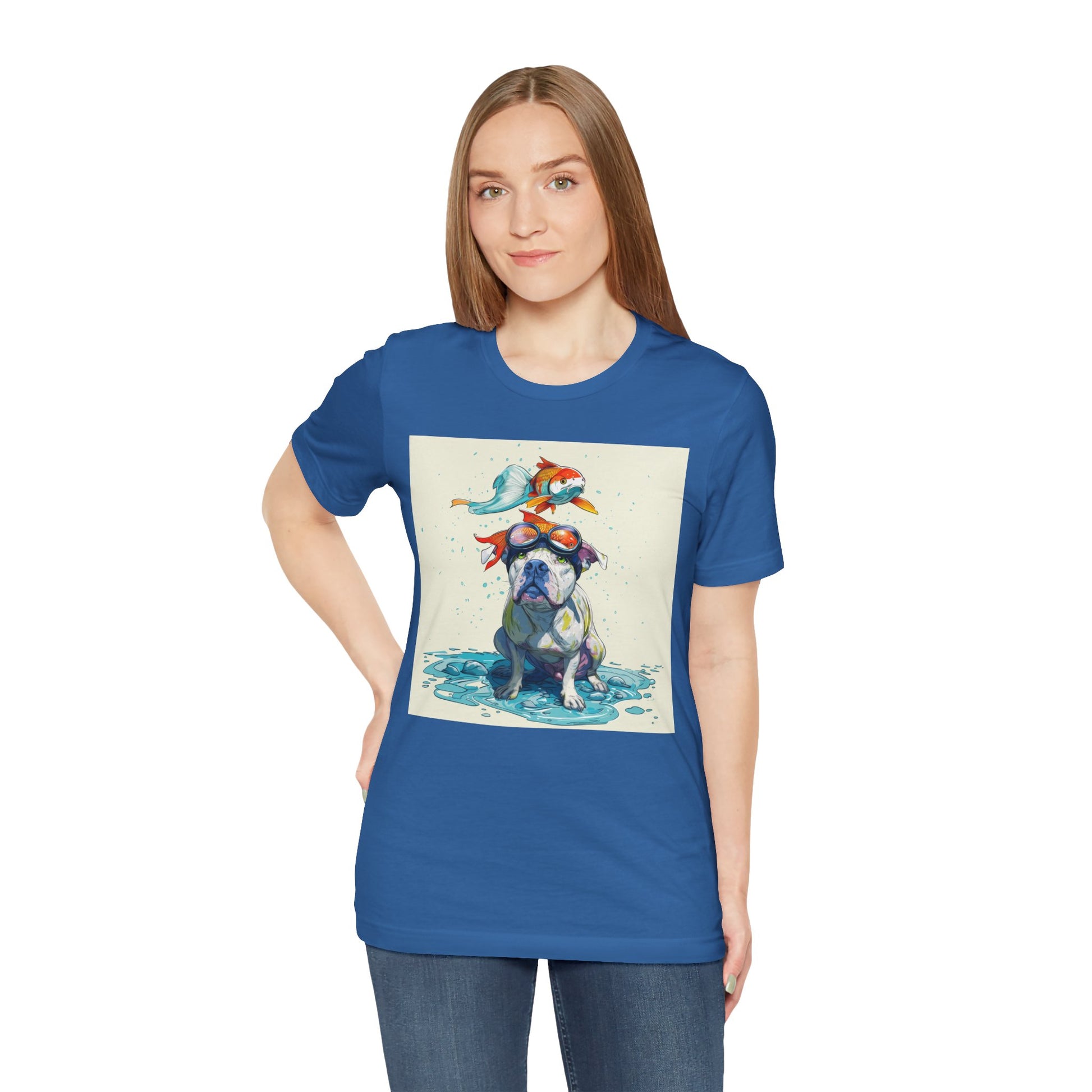 Meet the goofiest pup you’ll ever see! This playful design features a happy pitbull wearing goggles with a colorful koi fish balancing on his head—perfectly ridiculous and absolutely adorable. Full of vibrant colors and silly charm, it’s a shirt that brings smiles wherever it goes.