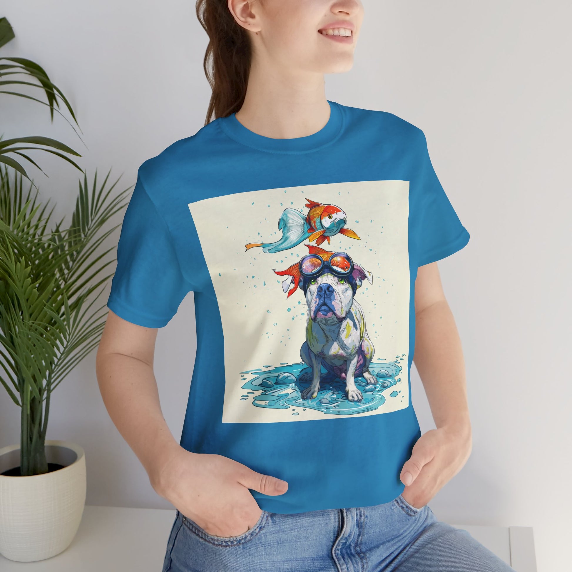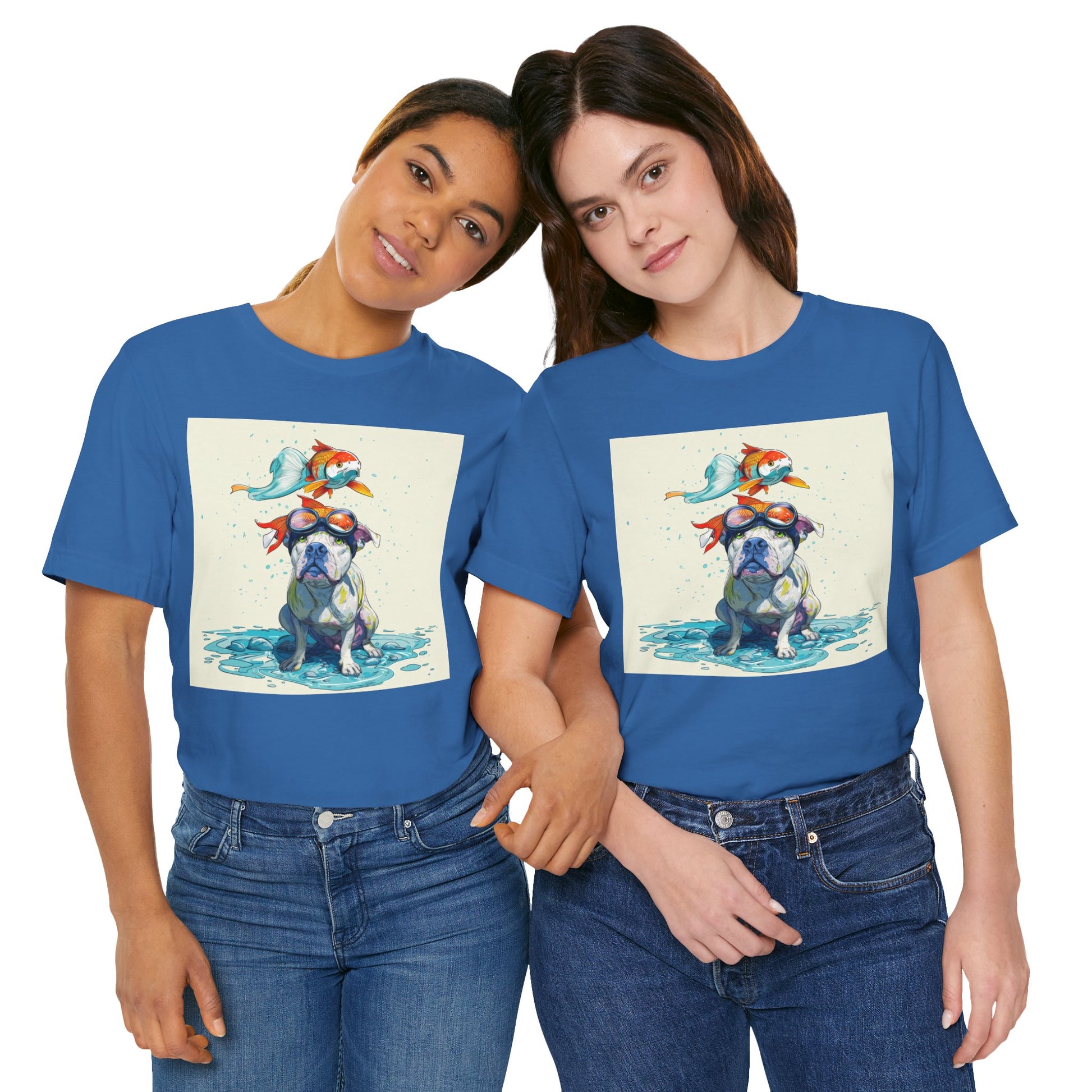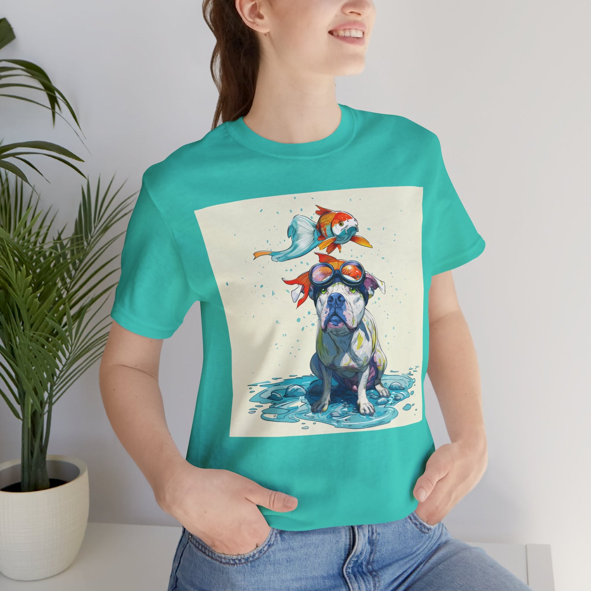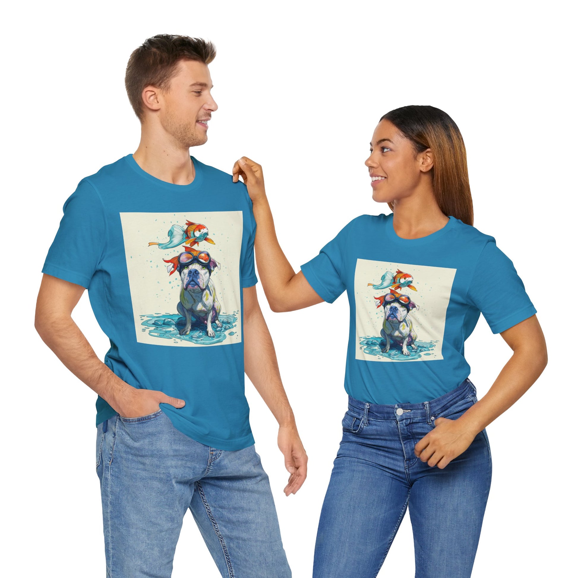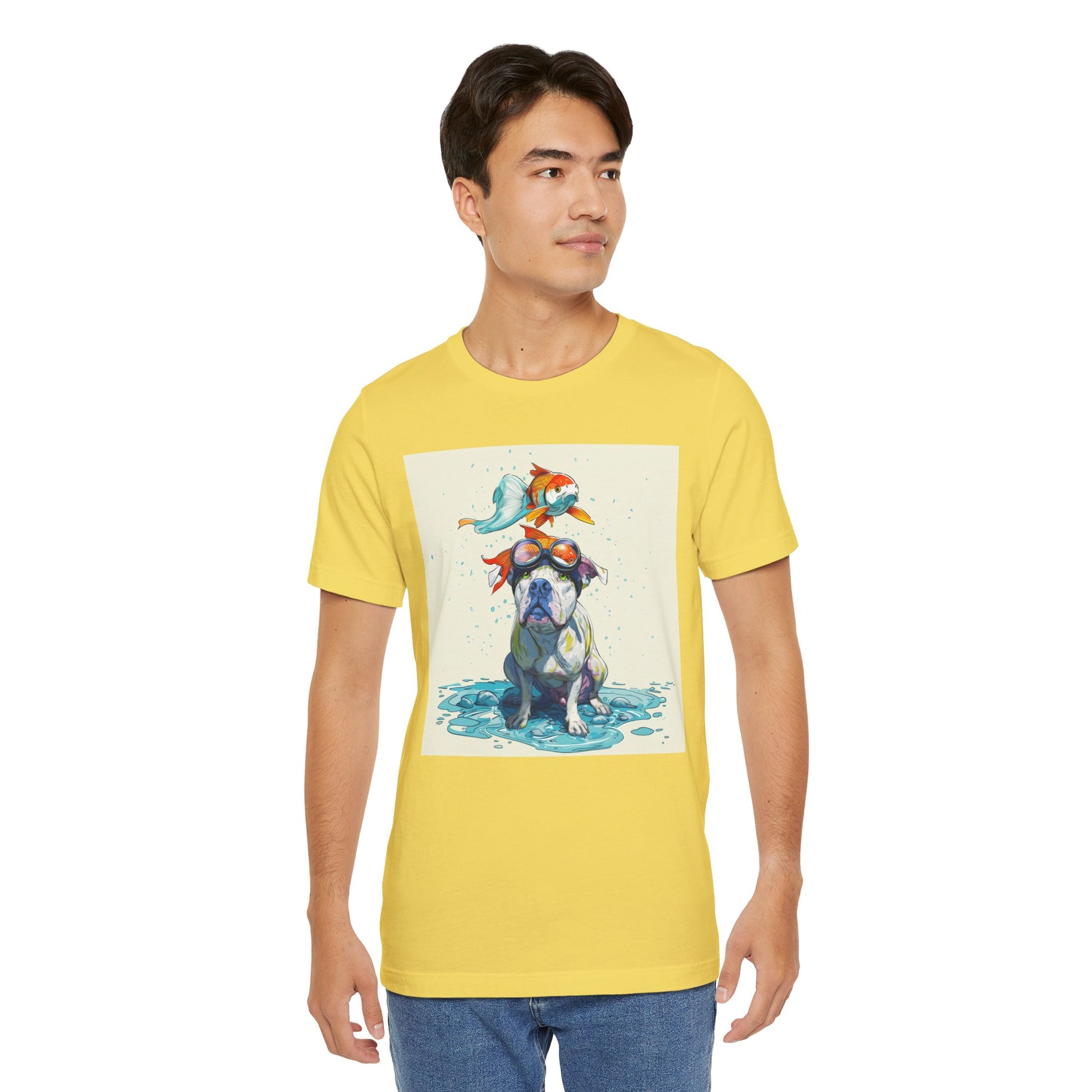 Meet the goofiest pup you’ll ever see! This playful design features a happy pitbull wearing goggles with a colorful koi fish balancing on his head—perfectly ridiculous and absolutely adorable. Full of vibrant colors and silly charm, it’s a shirt that brings smiles wherever it goes.
