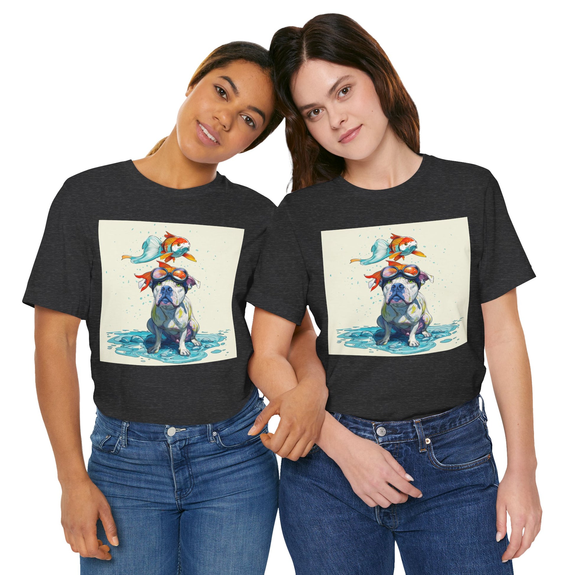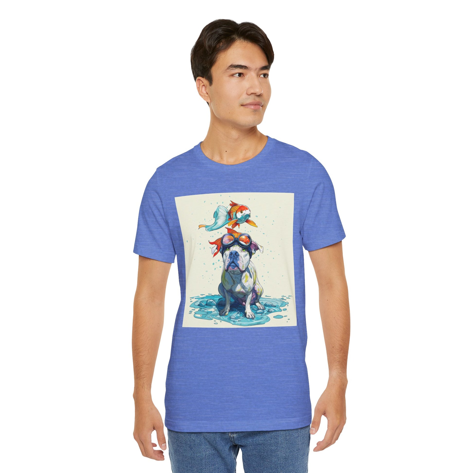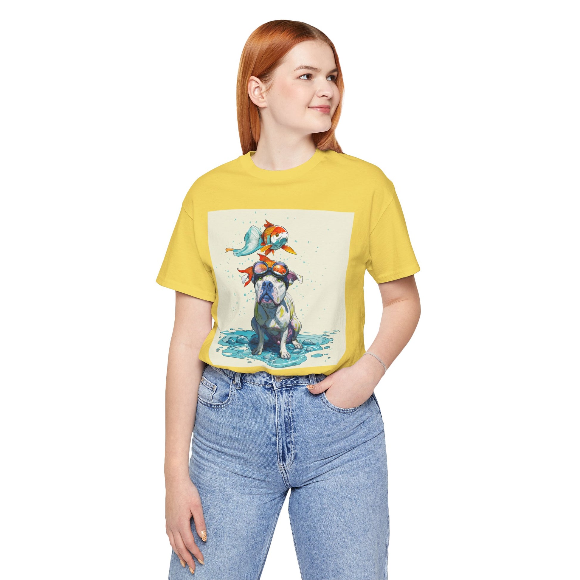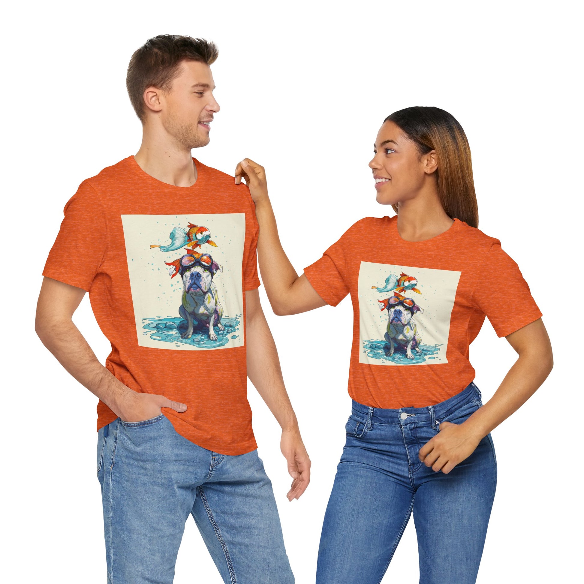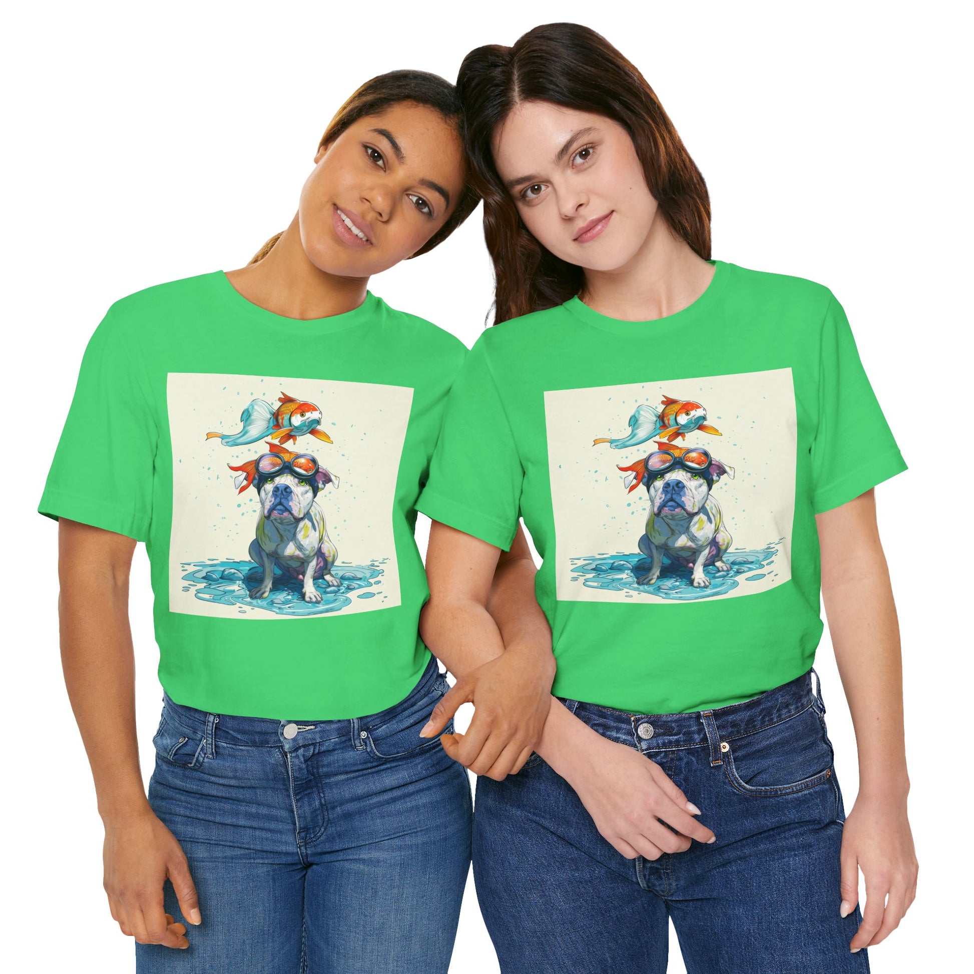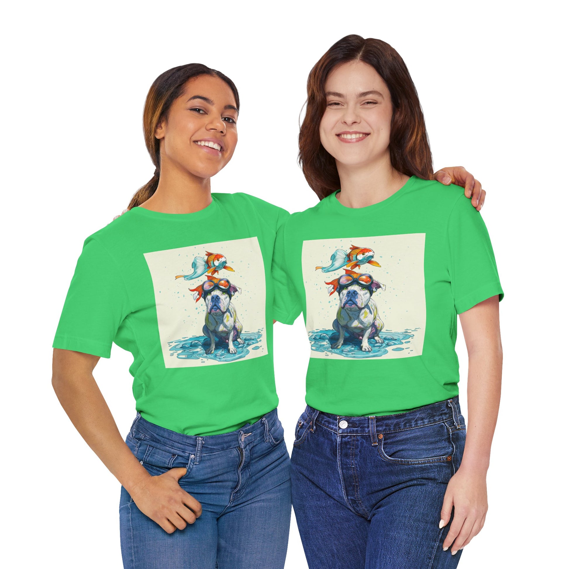 Meet the goofiest pup you’ll ever see! This playful design features a happy pitbull wearing goggles with a colorful koi fish balancing on his head—perfectly ridiculous and absolutely adorable. Full of vibrant colors and silly charm, it’s a shirt that brings smiles wherever it goes.