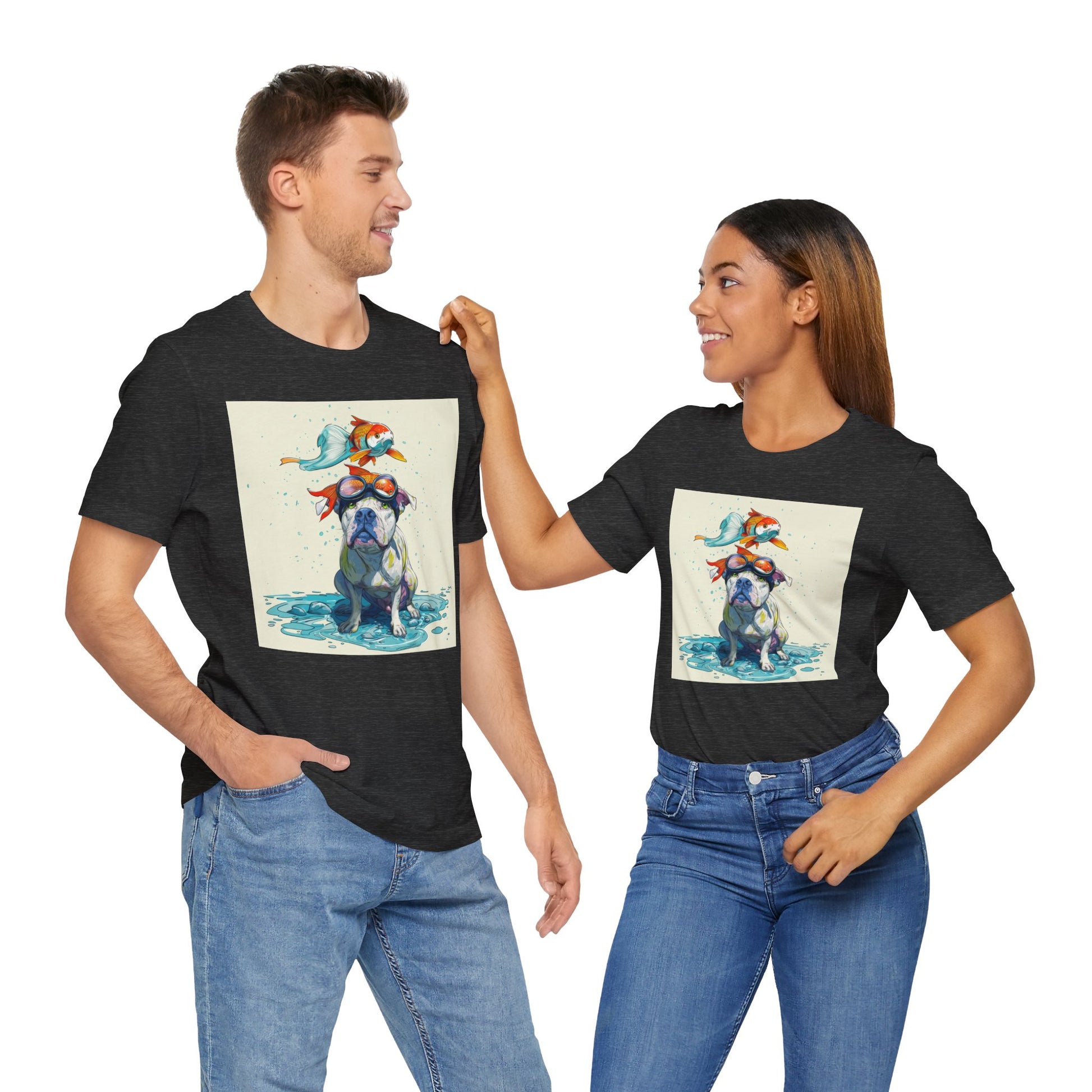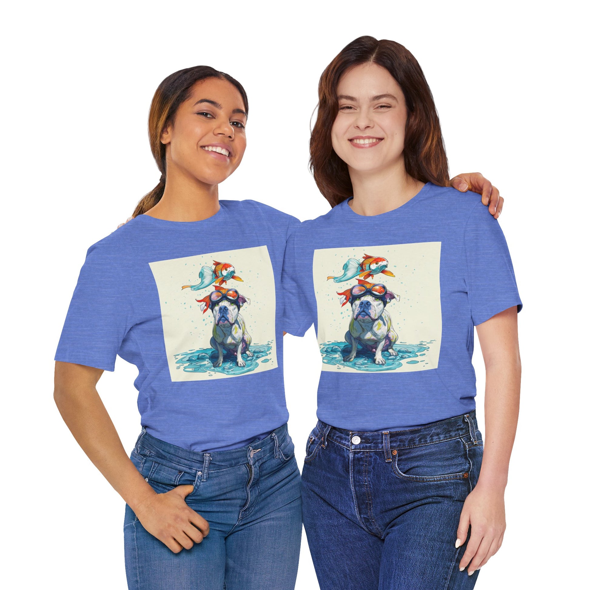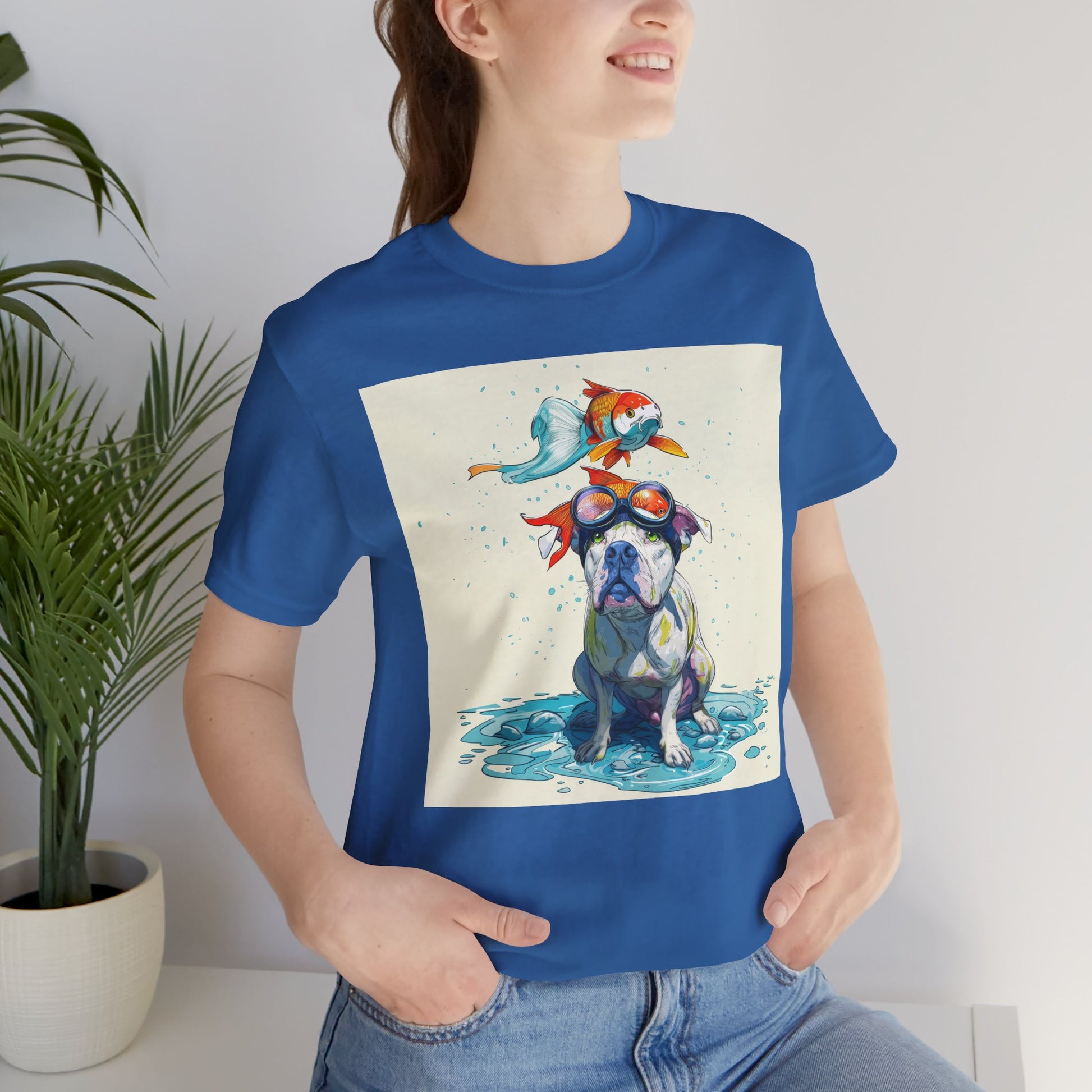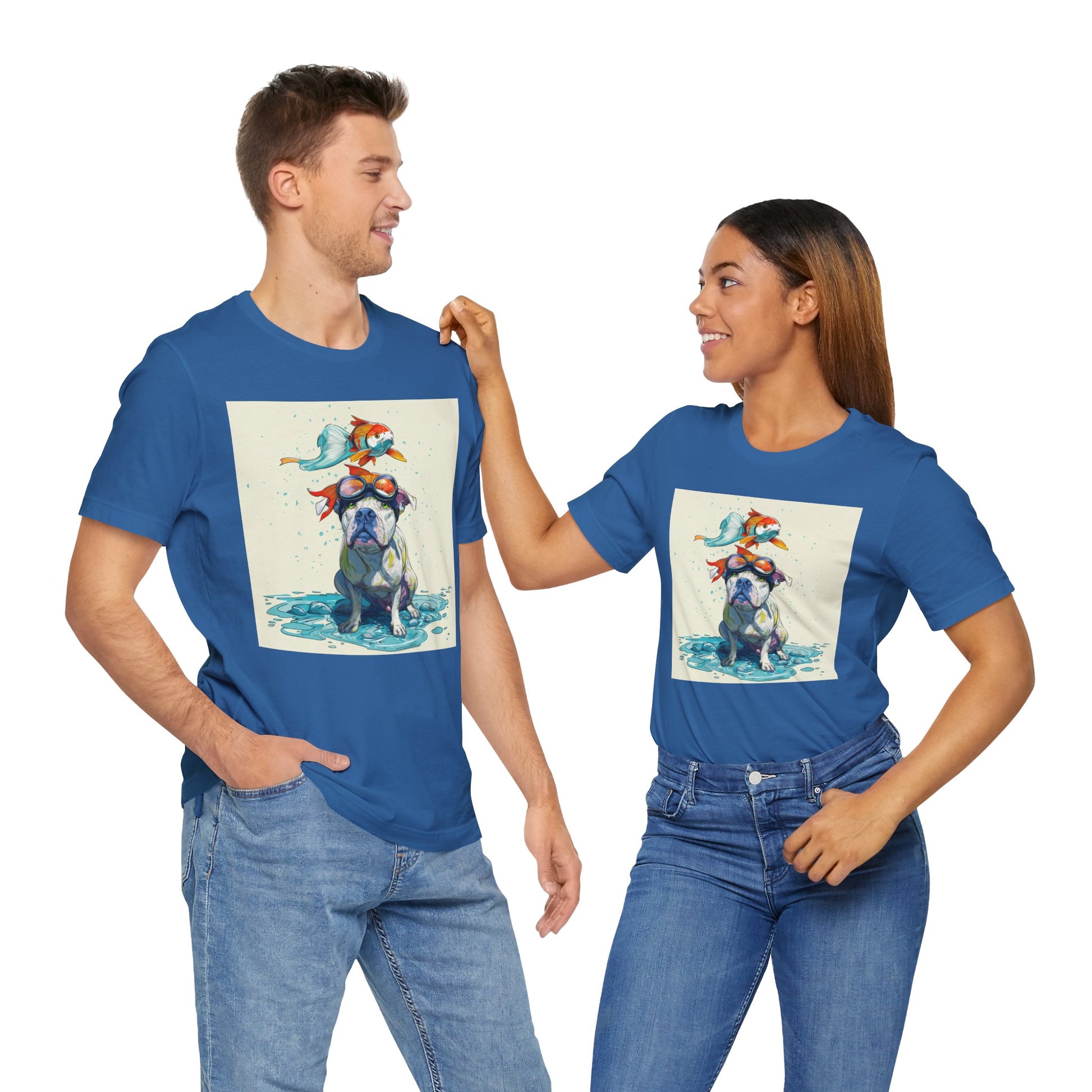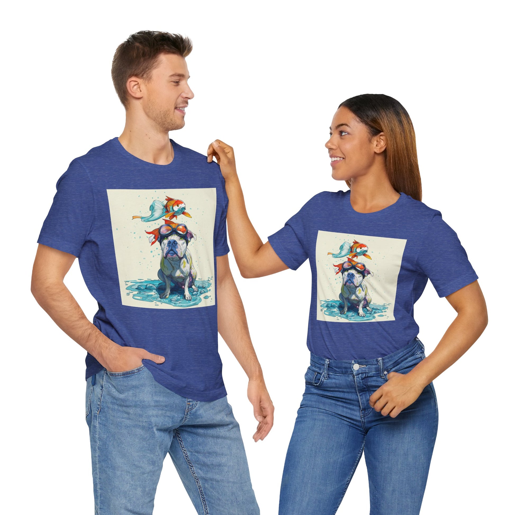 Meet the goofiest pup you’ll ever see! This playful design features a happy pitbull wearing goggles with a colorful koi fish balancing on his head—perfectly ridiculous and absolutely adorable. Full of vibrant colors and silly charm, it’s a shirt that brings smiles wherever it goes.