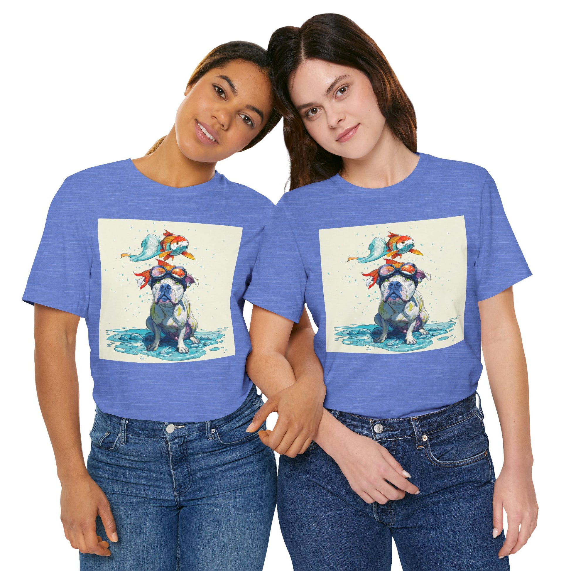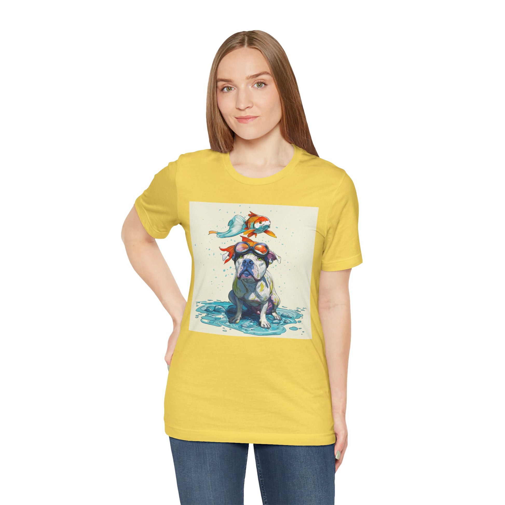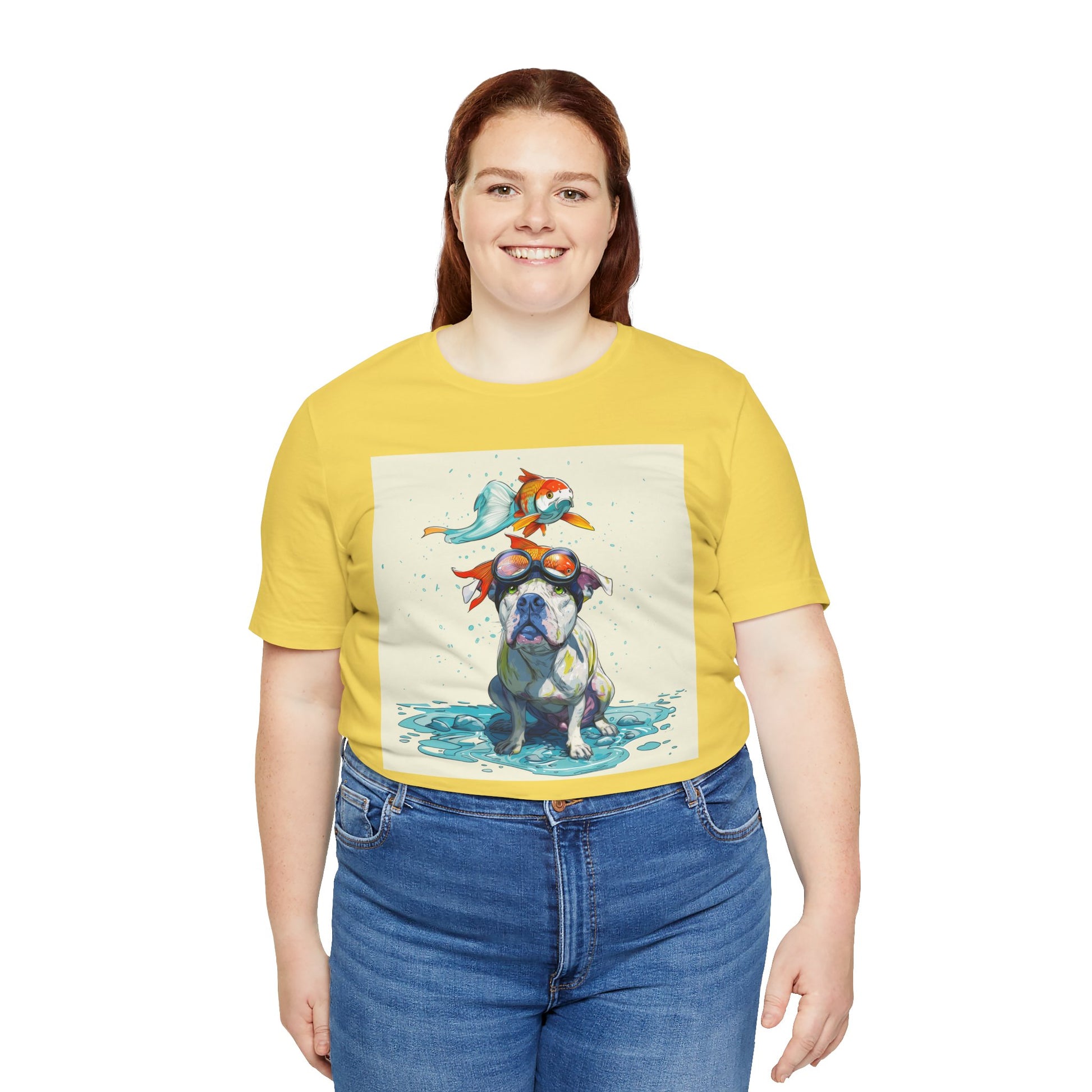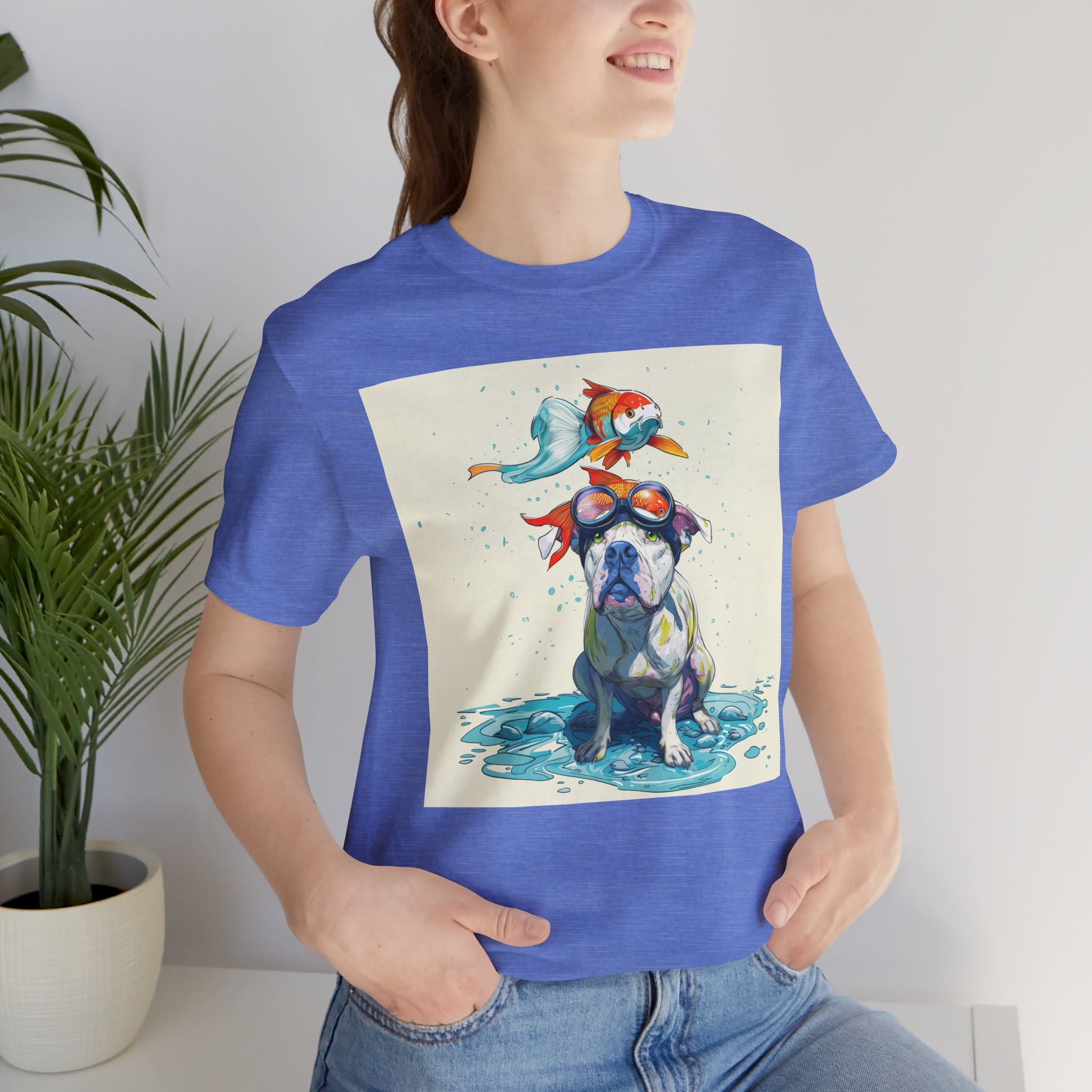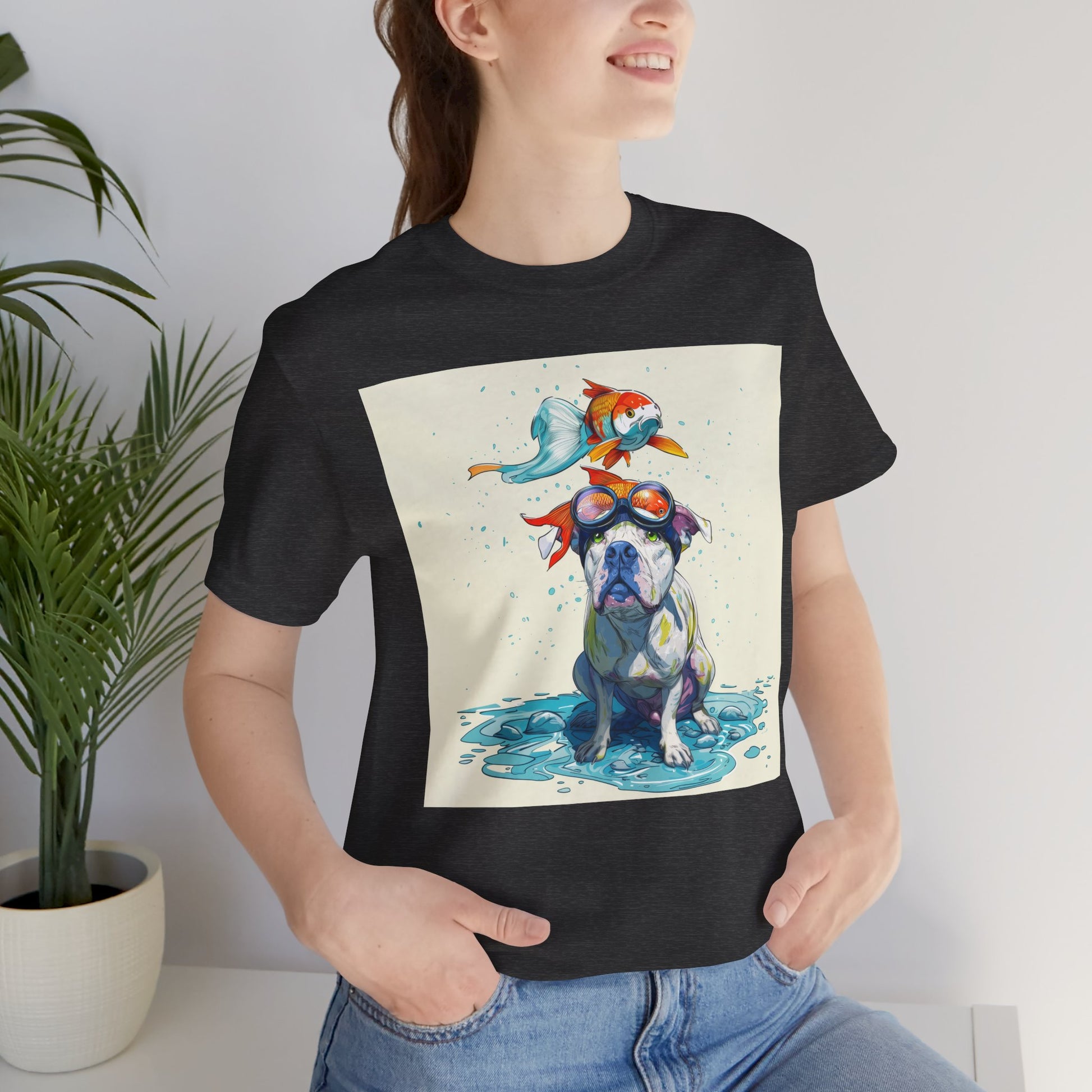 Meet the goofiest pup you’ll ever see! This playful design features a happy pitbull wearing goggles with a colorful koi fish balancing on his head—perfectly ridiculous and absolutely adorable. Full of vibrant colors and silly charm, it’s a shirt that brings smiles wherever it goes.