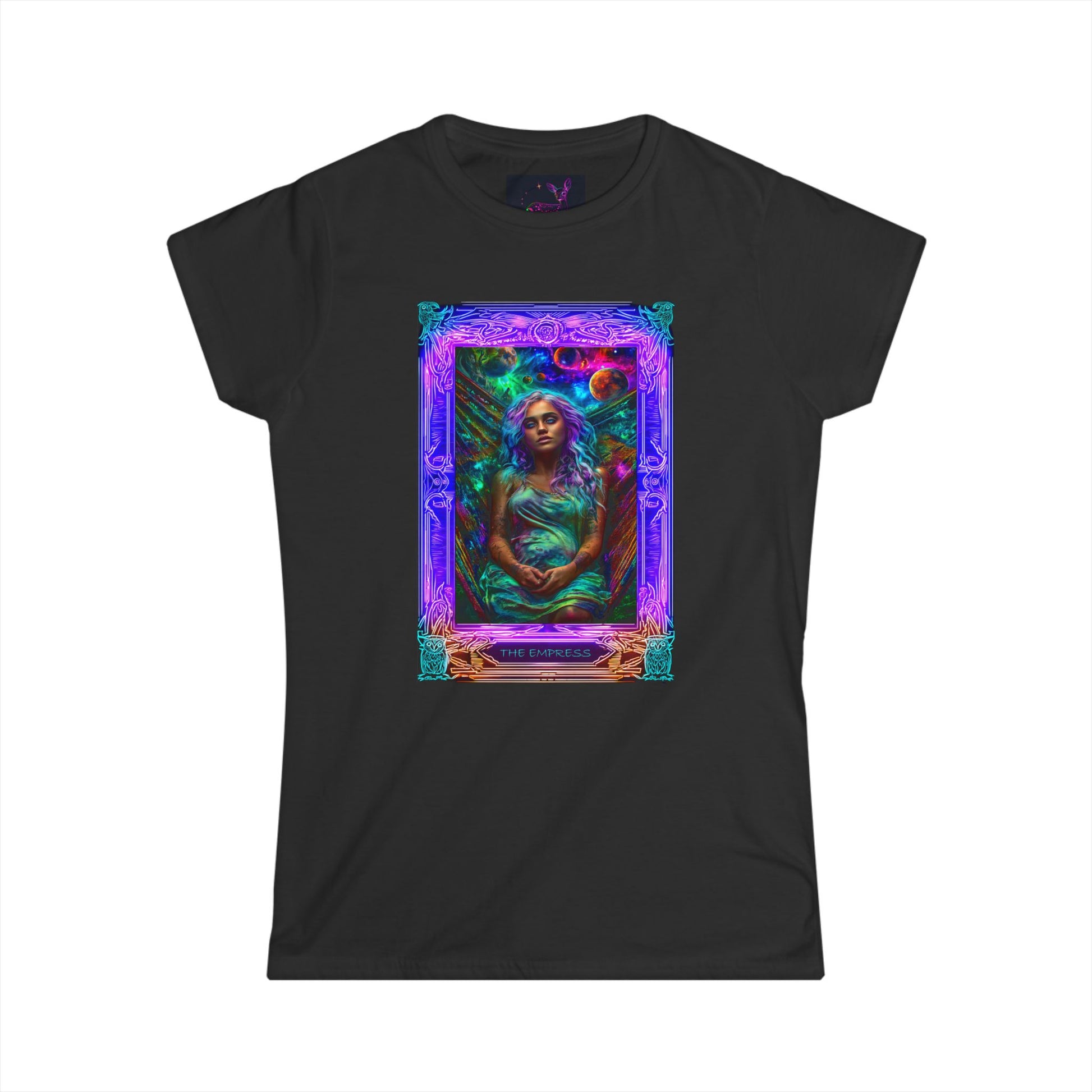 Channel celestial abundance with The Empress, a radiant cosmic mother resting in a hammock of galaxies. Her wavy purple hair and serene gaze glow with nurturing energy as stars, planets, and nebulae orbit in harmony around her. In tarot, The Empress embodies creation, beauty, fertility, and the flow of life’s abundance. This design is a wearable reminder of your power to manifest, nurture, and create worlds of your own.