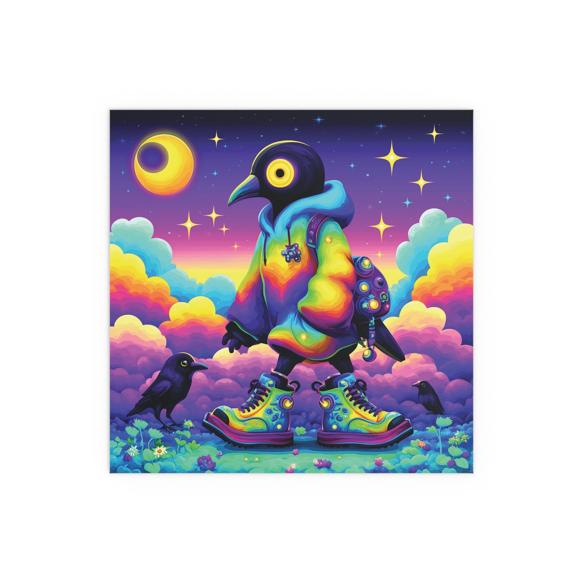 A curious crow wanders through a candy-colored sky, wrapped in a hoodie that glows like sunrise.