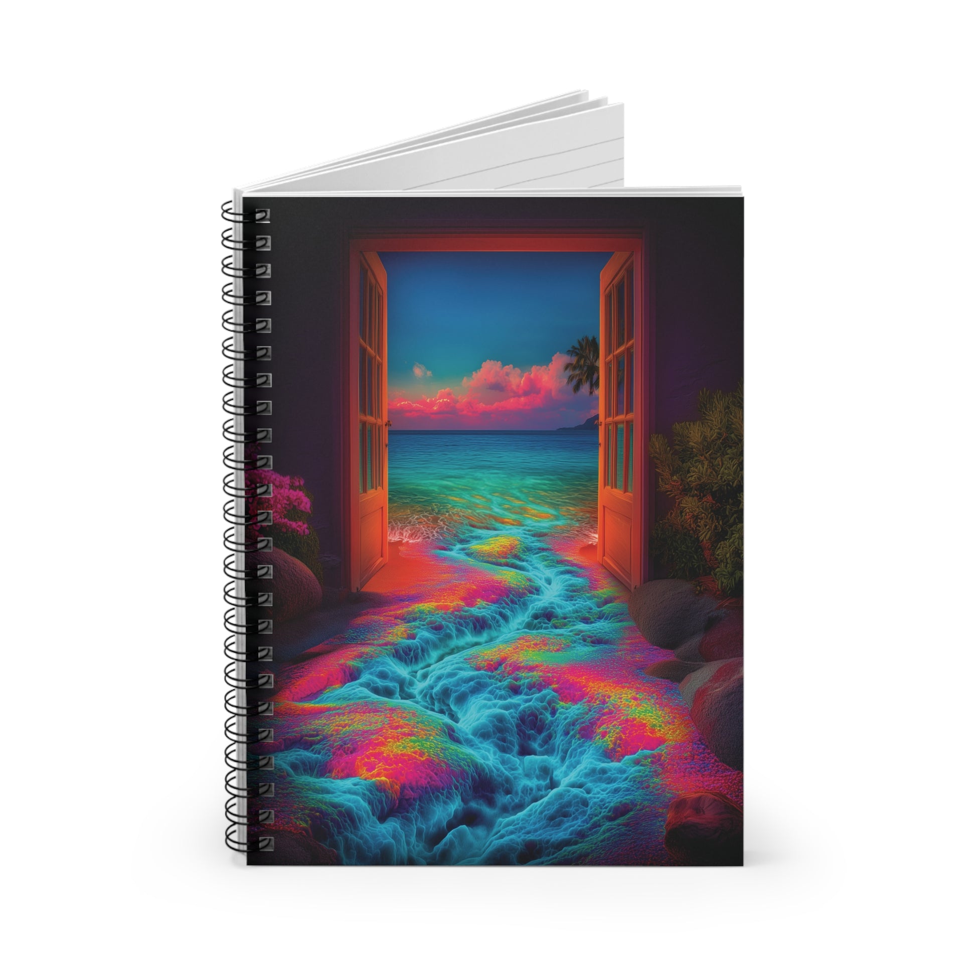 Step into the dream. 🌊 This spiral notebook features a mesmerizing dreamlogic design: double doors opening onto a glowing beach scene, while inside the room, a surreal crevasse drips with flowing water. The imagery blends the calm of the ocean with the mystery of a shifting inner world—trippy, surreal, and utterly captivating.