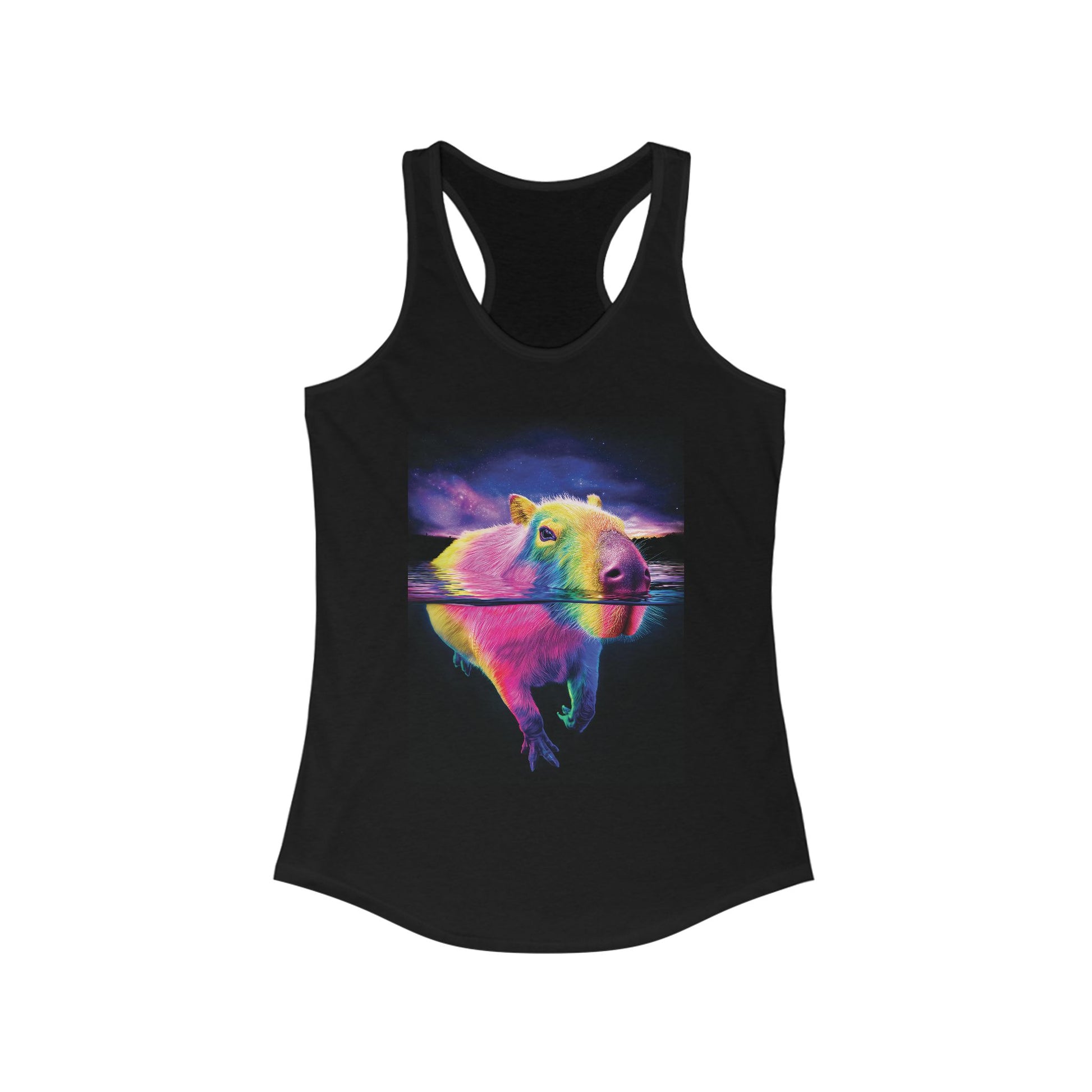 Chill vibes, cosmic style — this trippy tank top shows a cool capybara swimming. With a neon coat, dreamy patterns, and a surreal glow, the design blends cuteness with mind-bending beauty. Perfect for animal lovers, festival-goers, or anyone who wants to rock the most relaxed (and stylish) creature in the muliverse?