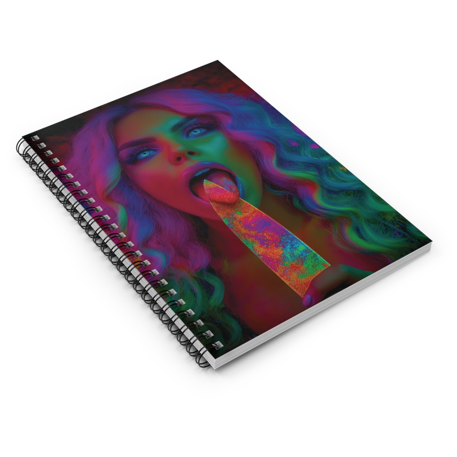 Bold, surreal, and unforgettable. This spiral notebook features a trippy rainbow-colored illustration of a striking figure licking an iridescent glass blade—a symbolic nod to the raw edge of passion, love, and danger. The vibrant psychedelic tones create a surreal visual that blends beauty with intensity, making it perfect for fans of alternative art and bold aesthetics.