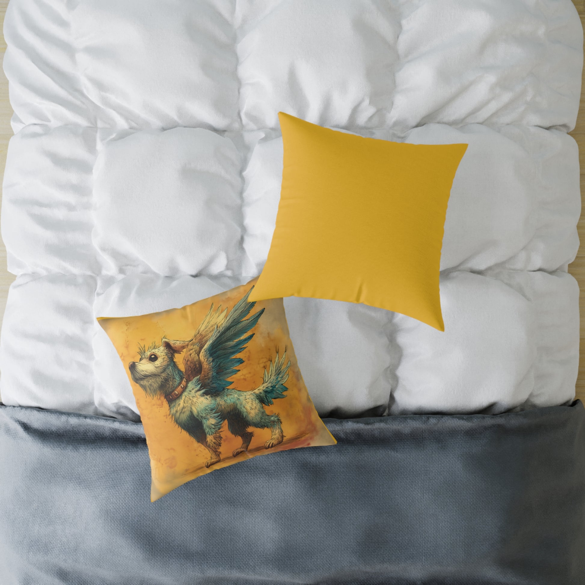 Honor the memory of a beloved companion with this heartfelt pillow, part of our “Tribute to Our Friends in the Stars” series. Featuring a simple yet touching illustration of a small white terrier with angel wings against a soft yellow background, this design brings comfort and warmth without being overly cosmic. A gentle reminder of love that endures beyond time, it’s a beautiful way to keep an old friend close by and offer solace during moments of grief and remembrance