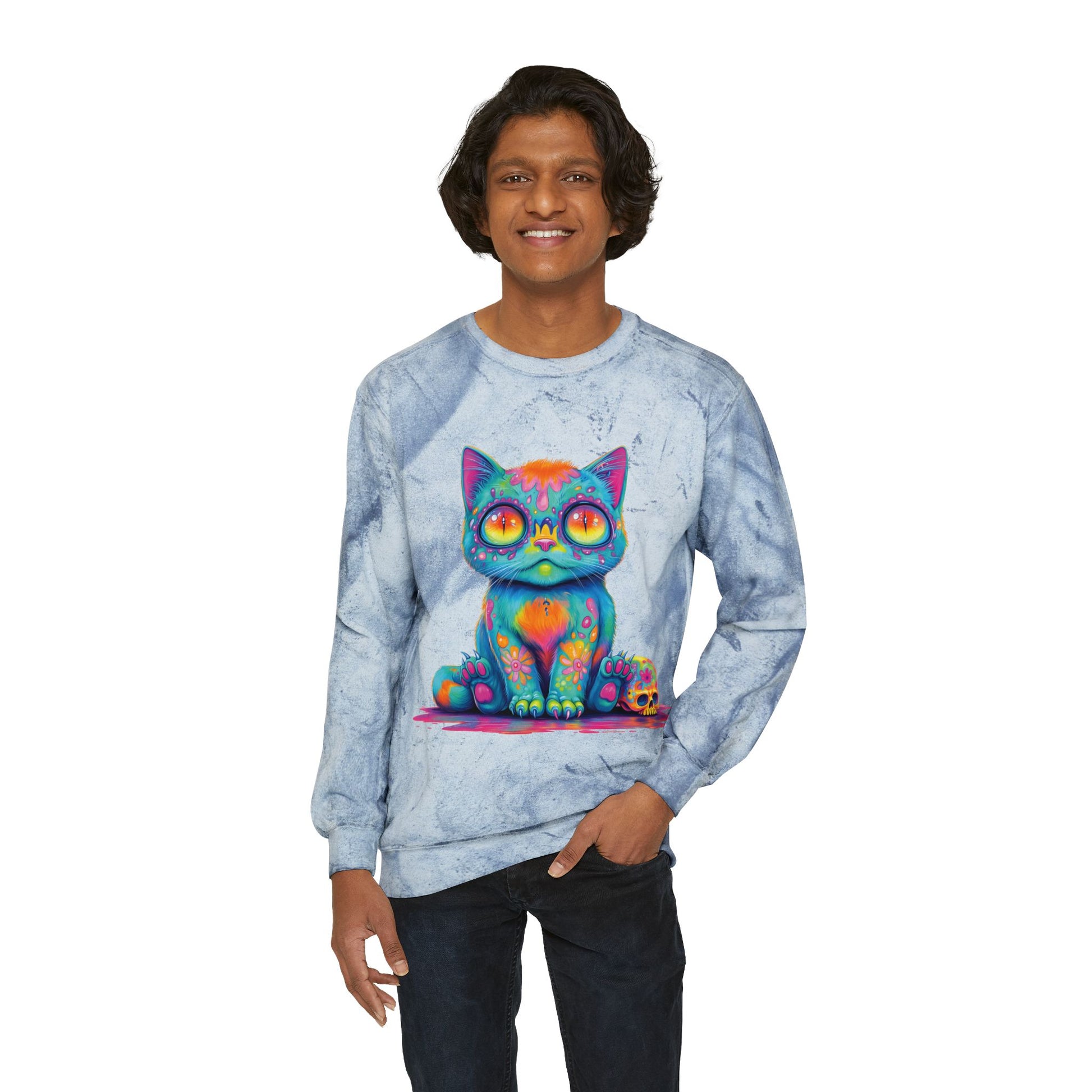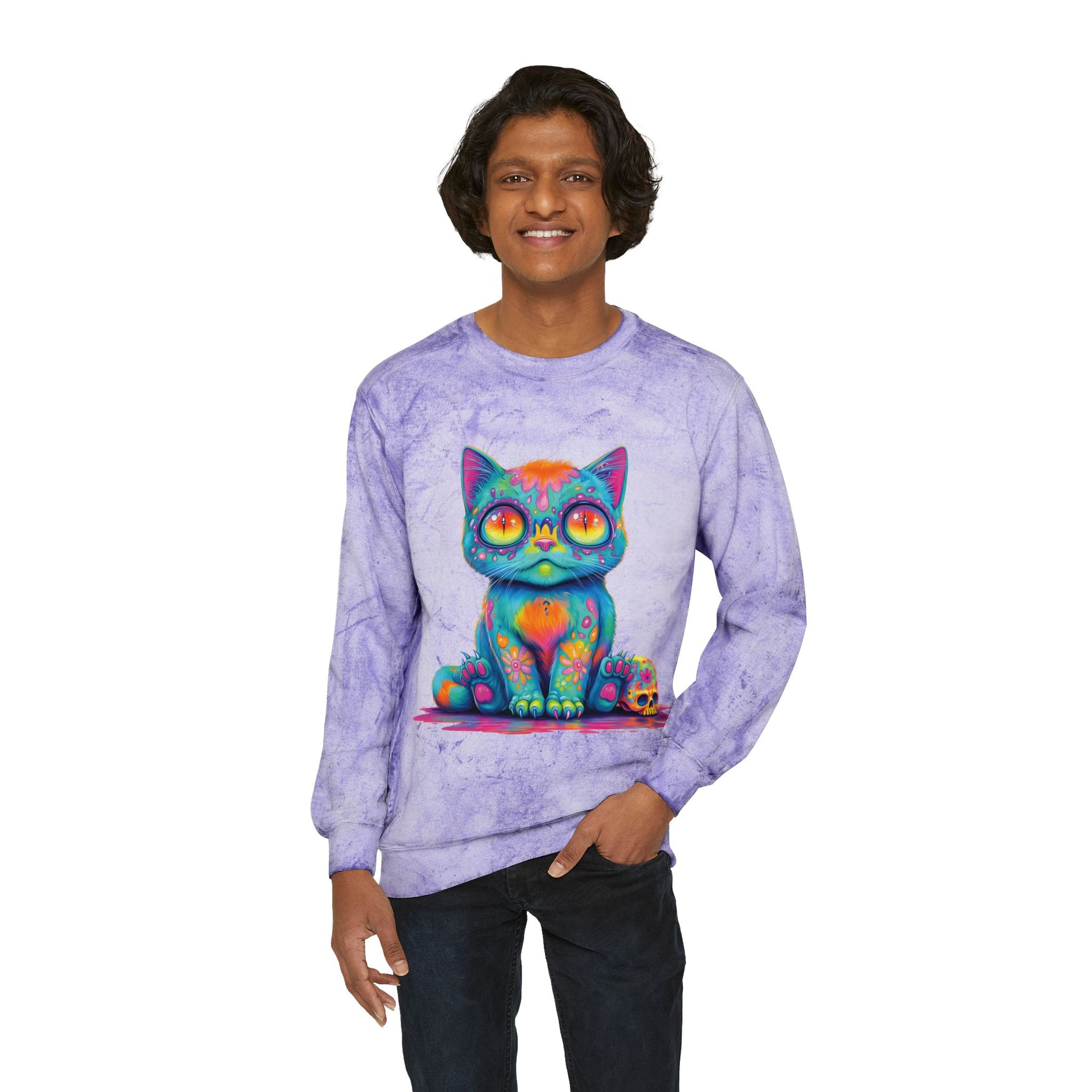 Embrace a colorful vibe with this unisex color blast crewneck sweatshirt. Bright, bold, and a little bit undead — this vibrant zombie cat hoodie blends creepy and cute in perfect harmony. The colorful vector design pops against soft, cozy fabric that’s made to last. Perfect for cat lovers, chaos lovers, or anyone who thrives in color.